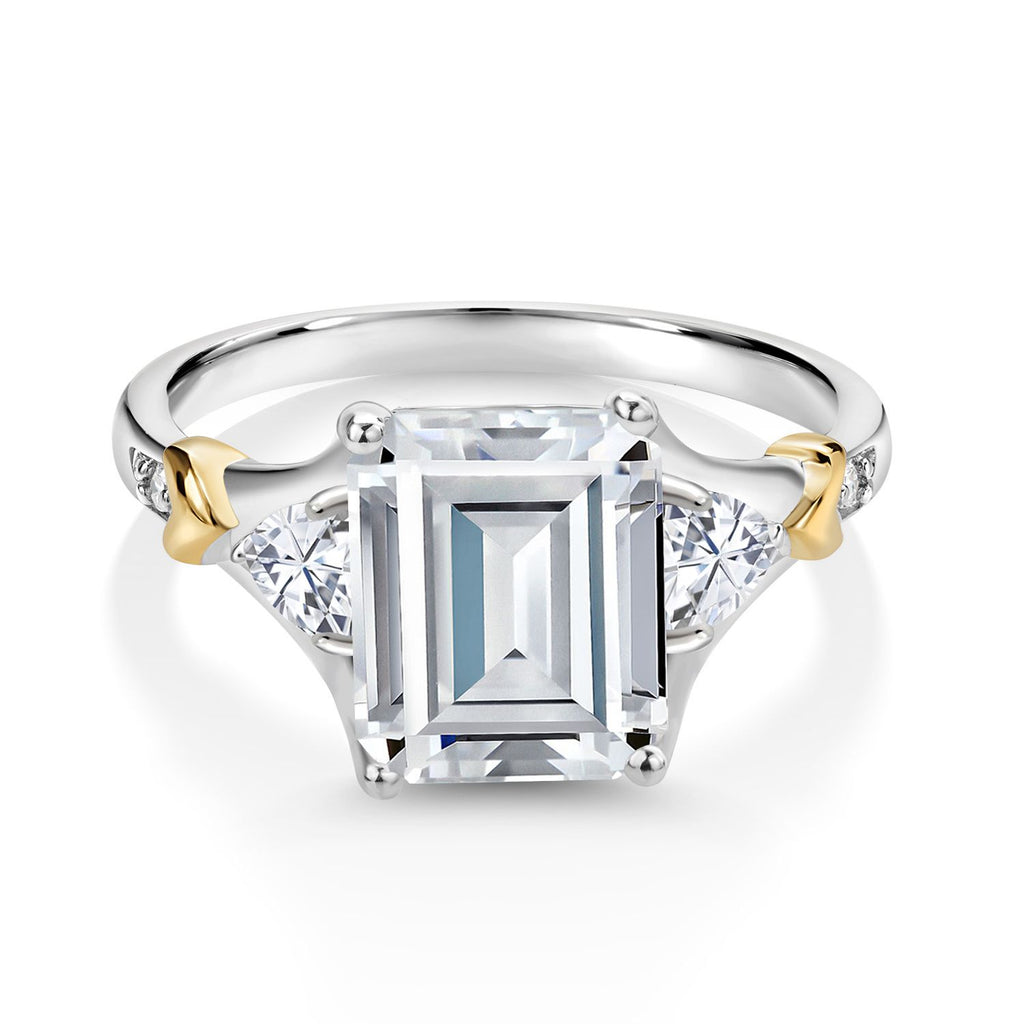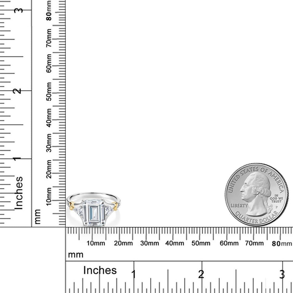 MEASUREMENTS: 10x8mm Emerald Cut Near Colorless (GH) Moissanite, 3.5x3.5mm Trillion Near Colorless (GH) Moissanite1.15, x, 1.15, mm Round White Diamond. Total Carat Weight is 3.89 cttw