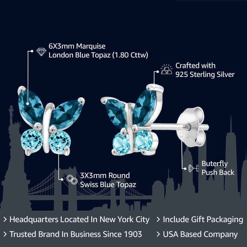 925 Silver Marquise London Blue Topaz and Swiss Blue Topaz Butterfly Earrings For Women (1.80 Cttw, Gemstone November Birthstone, Center Stone: 6X3MM, Small Stones: 3MM)