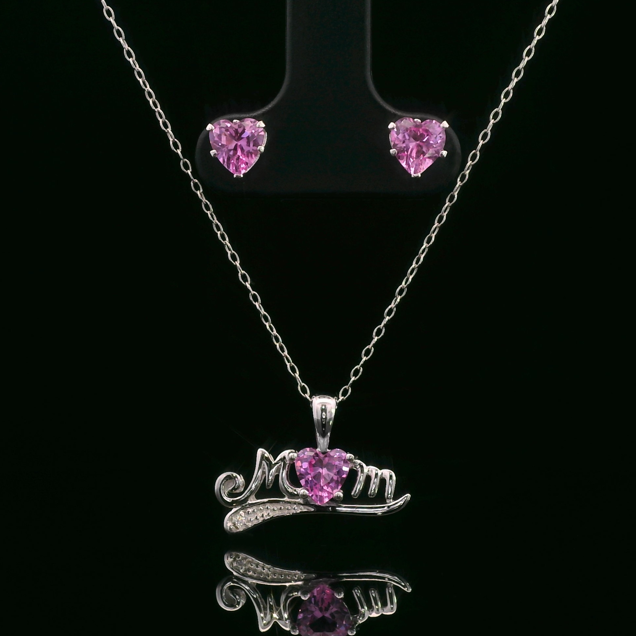 925 Silver `Mom` 1.81Ct Pink Created Sapphire White Diamond Pendant and Earrings Jewelry Set