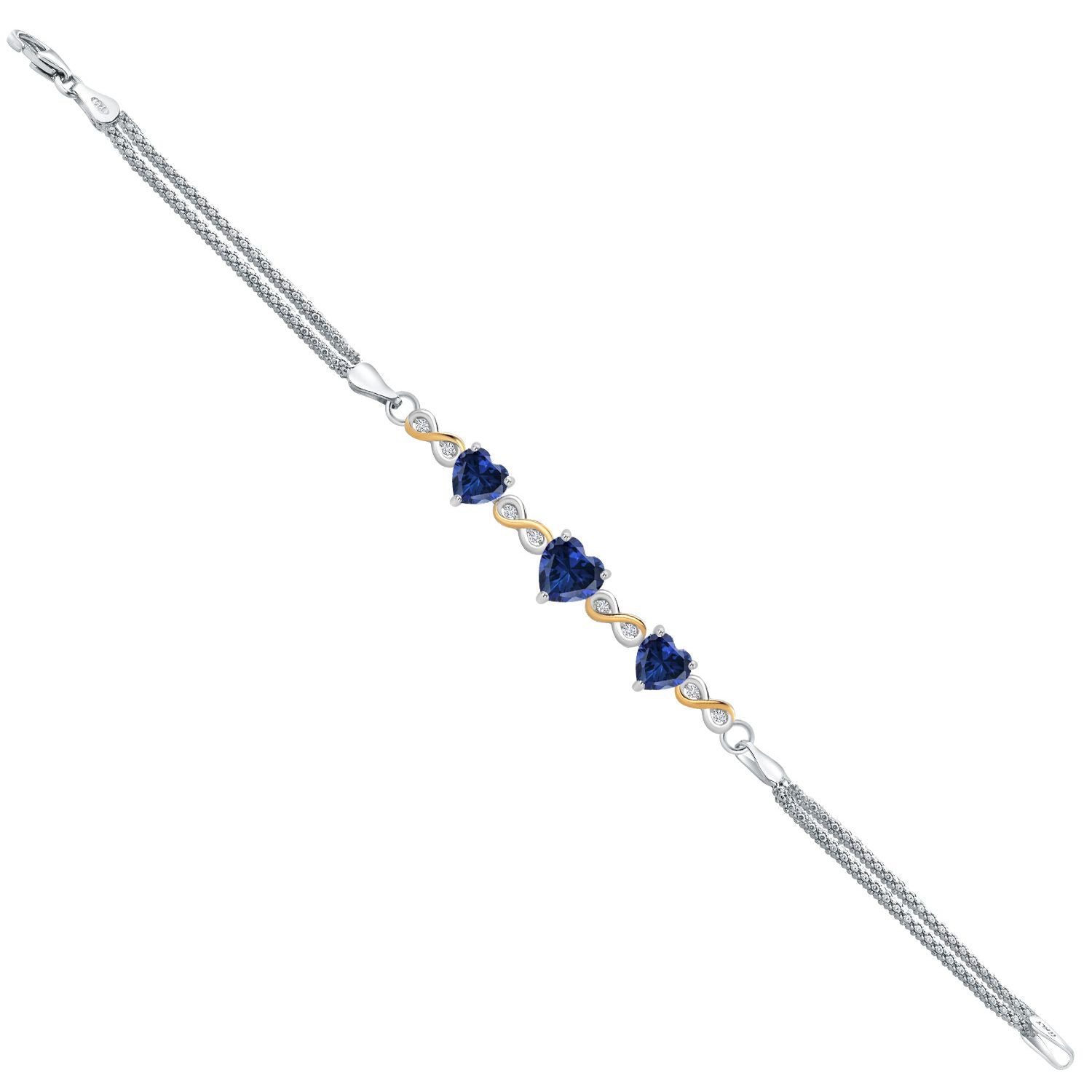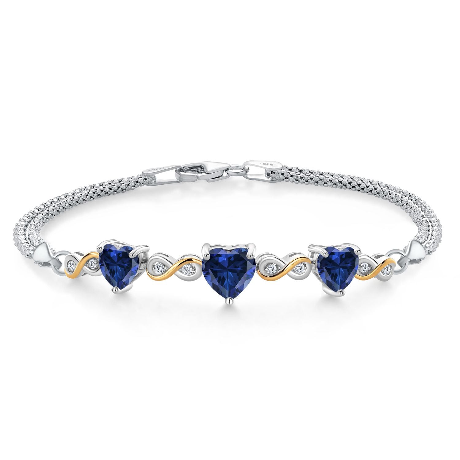 925 Sterling Silver and 10k Yellow Gold Blue Created Sapphire and White Lab Grown Diamond Bracelet For Women (2.78 Cttw, Heart 7MM and 6MM, 6.5/7/7.5 Inch, Made In Italy)