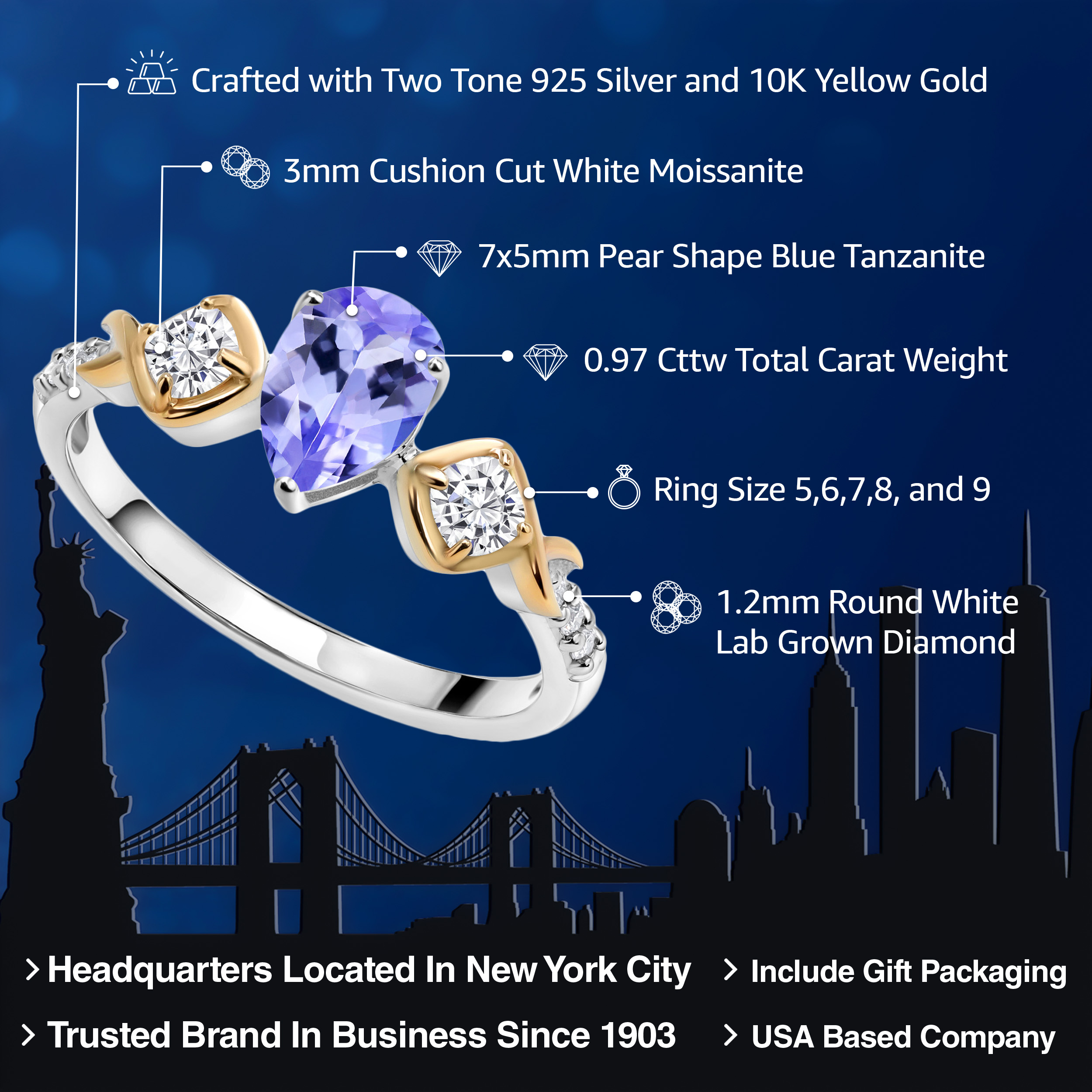 Premium 925 Sterling Silver & 10K Yellow Gold with Hypoallergenic Comfort – Crafted from solid sterling silver and genuine 10K yellow gold, this tanzanite and moissanite ring is nickel-free, hypoallergenic, and tarnish-resistant, ensuring long-lasting shine and safe wear for sensitive skin.