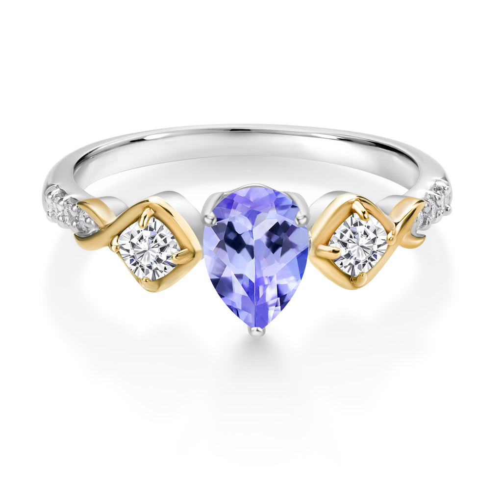 925 Sterling Silver and 10K Yellow Gold Blue Tanzanite White Moissanite and White Lab Grown Diamond Women Ring (0.97 Cttw, Pear Shape 7X5MM, Gemstone Birthstone)