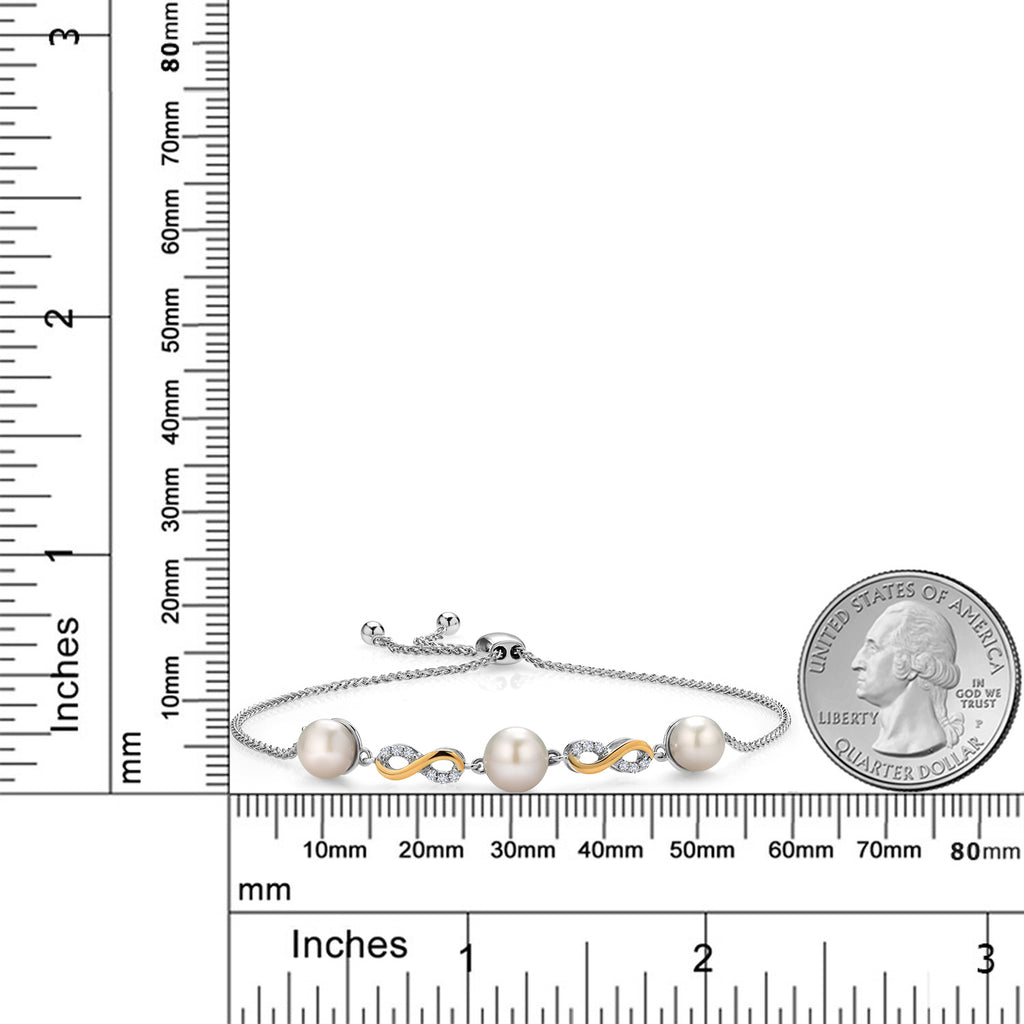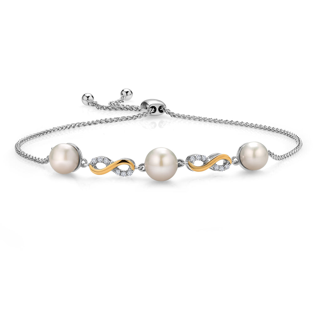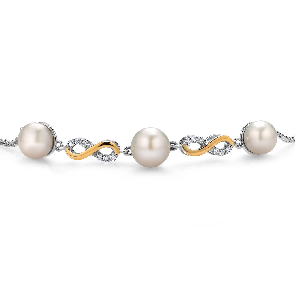 925 Sterling Silver and 10K Yellow Gold Cultured Freshwater Pearl and White Lab Grown Diamond Infinity Tennis Bracelet for Women (Round 6-7.5MM Pearls, Adjustable Up to 9.25 Inch)