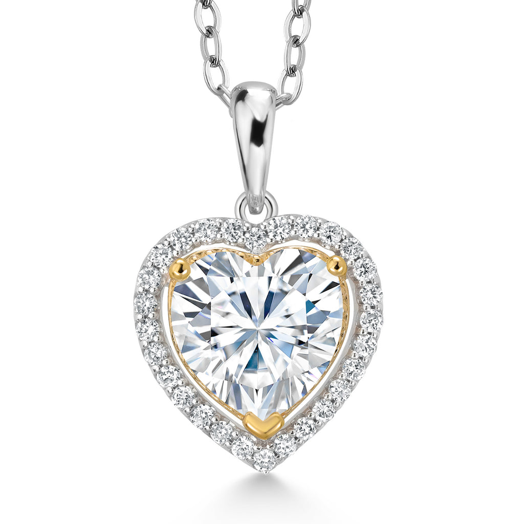 925 Sterling Silver and 10K Yellow Gold Forever Classic Moissanite and White Lab Grown Diamond Pendant Necklace For Women (2.00 Cttw, Heart Shape 8MM, with 18 Inch Chain)