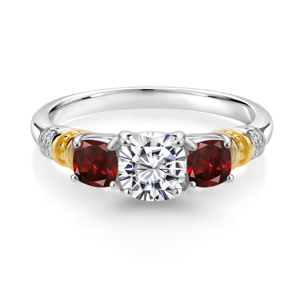 925 Sterling Silver and 10K Yellow Gold IGI Certified Lab Grown Diamond and Garnet 3 Stone Ring For Women | 1.89 Cttw | Center 1 Ct Cushion Diamond | E-F Color | VS1-VS2 Clarity