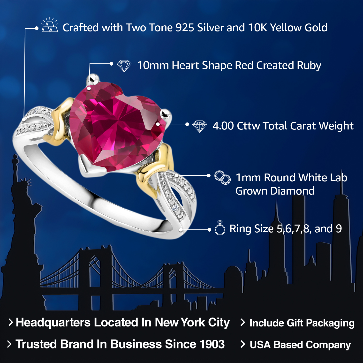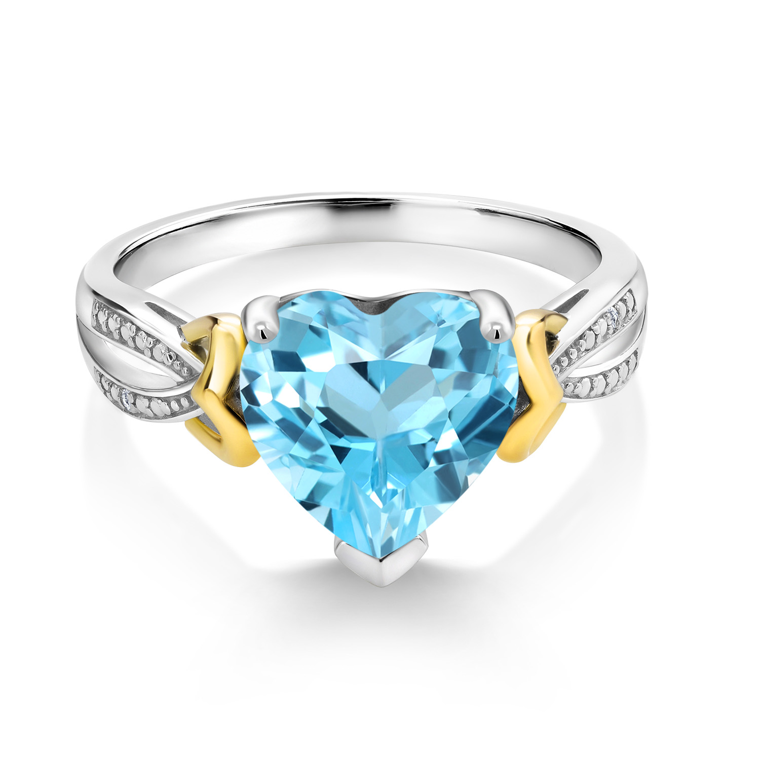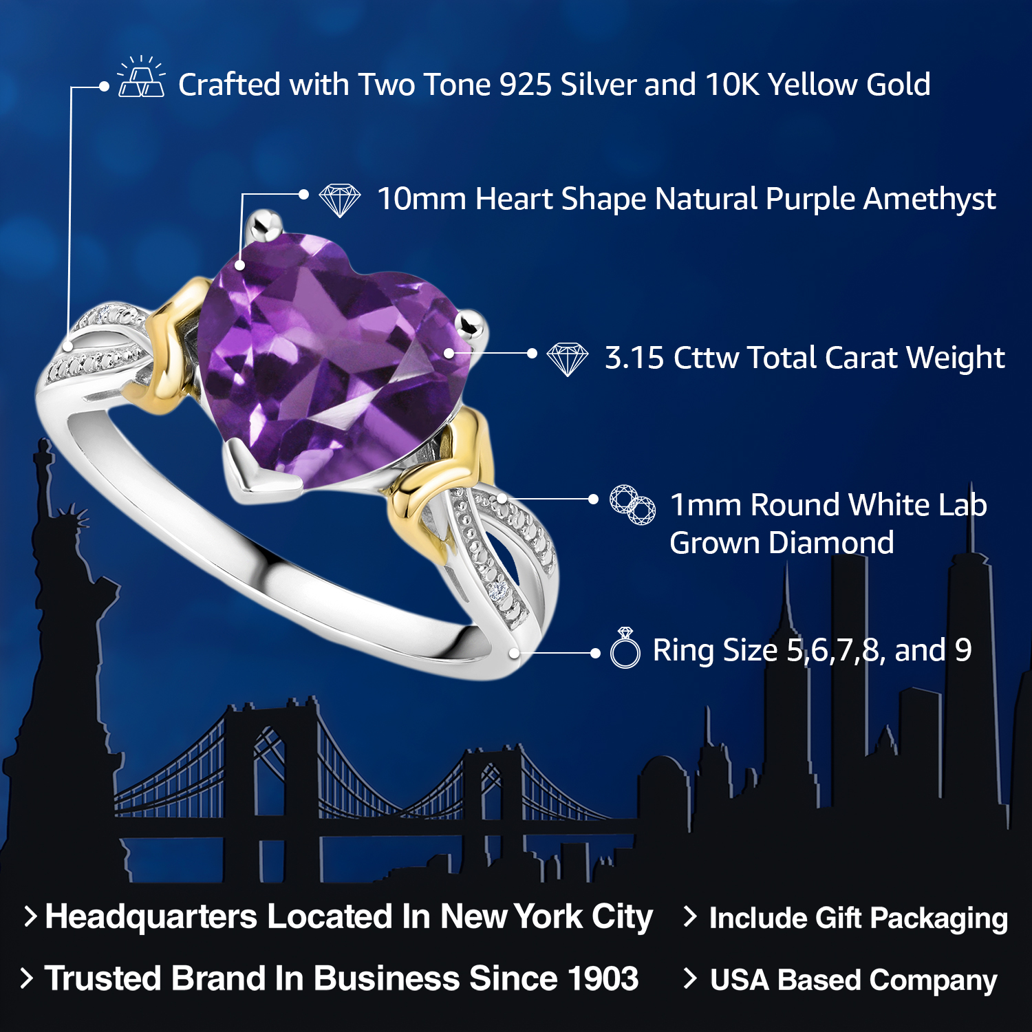 3-4 Cttw Heart Shape Gemstone Birthstone and Diamond Engagement Ring For Women | 925 Sterling Silver and 10K Yellow Gold | 10MM Heart | Available In Size 5, 6, 7, 8, 9