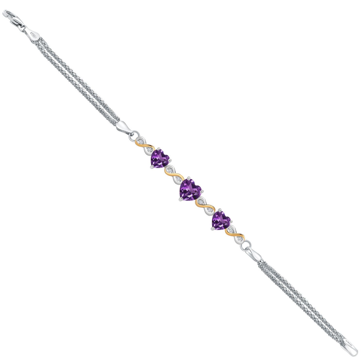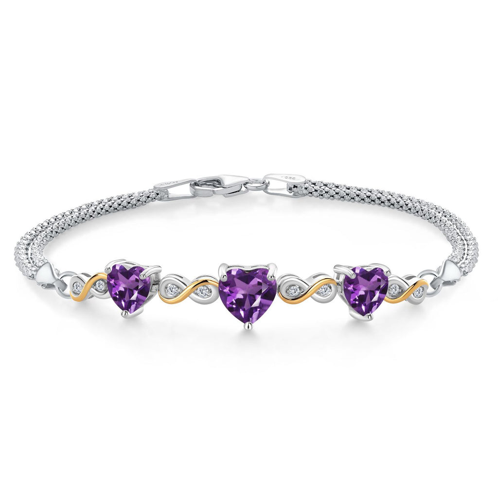 925 Sterling Silver and 10k Yellow Gold Purple Amethyst and White Lab Grown Diamond Bracelet For Women (2.58 Cttw, Heart 7MM and 6MM, 6.5/7/7.5 Inch, Made In Italy)
