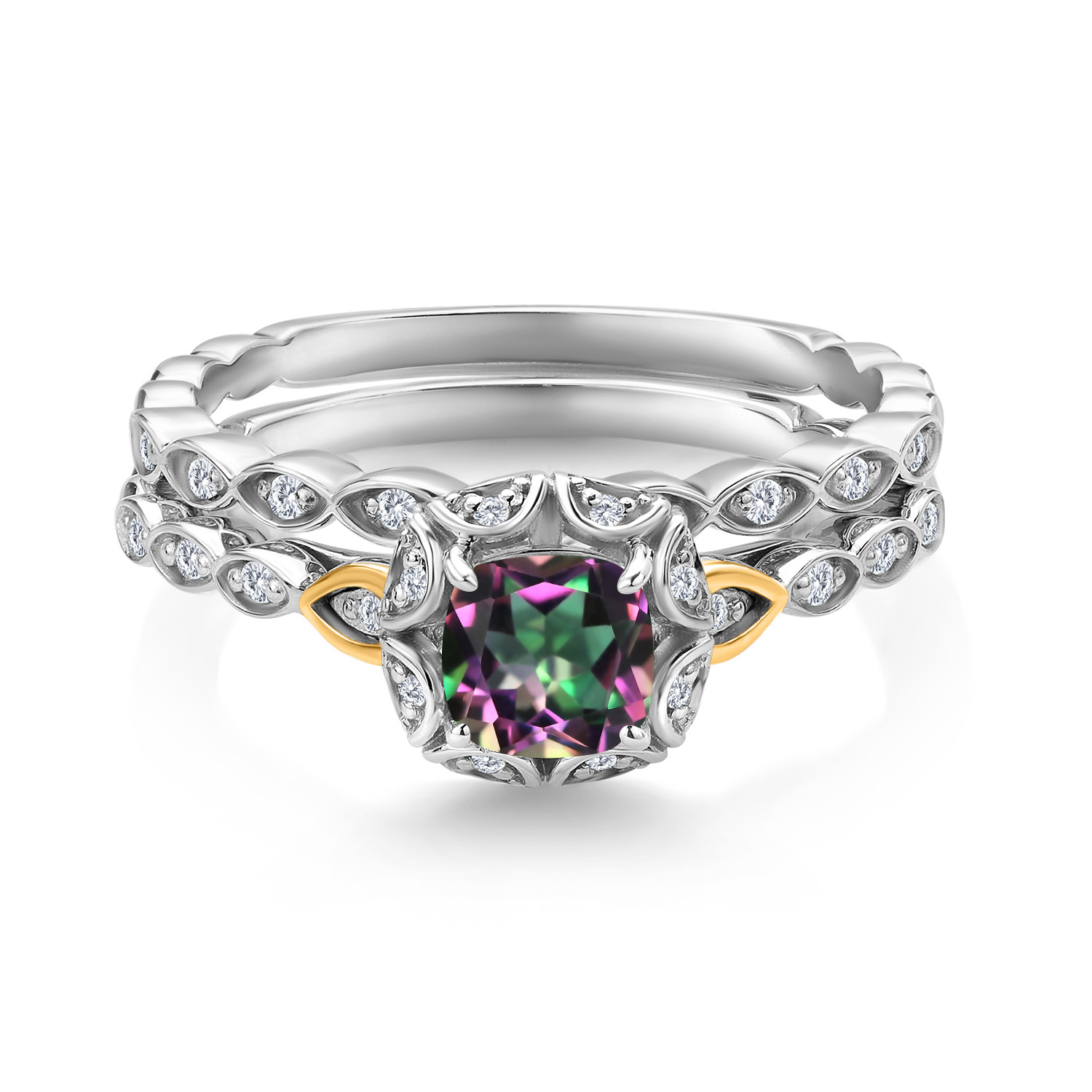 ELEGANT AND TIMELESS DESIGN: The combination of the vibrant cushion cut gemstone and the brilliant lab-grown diamonds creates a sophisticated and timeless look. The two-tone design of sterling silver and yellow gold adds a touch of elegance, making this set perfect for engagements, weddings, or anniversaries.