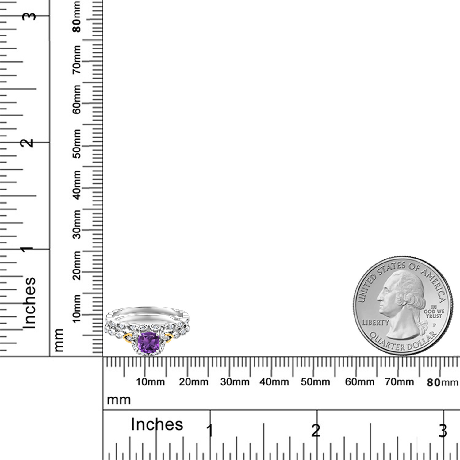 EXCEPTIONAL QUALITY AND CRAFTSMANSHIP: This beautiful bridal ring set features a 5MM cushion cut gemstone birthstone, elegantly complemented by sparkling white lab-grown diamonds. Crafted from high-quality 925 sterling silver and accented with 10K yellow gold, this set ensures durability and a luxurious finish, making it a cherished addition to any jewelry collection.