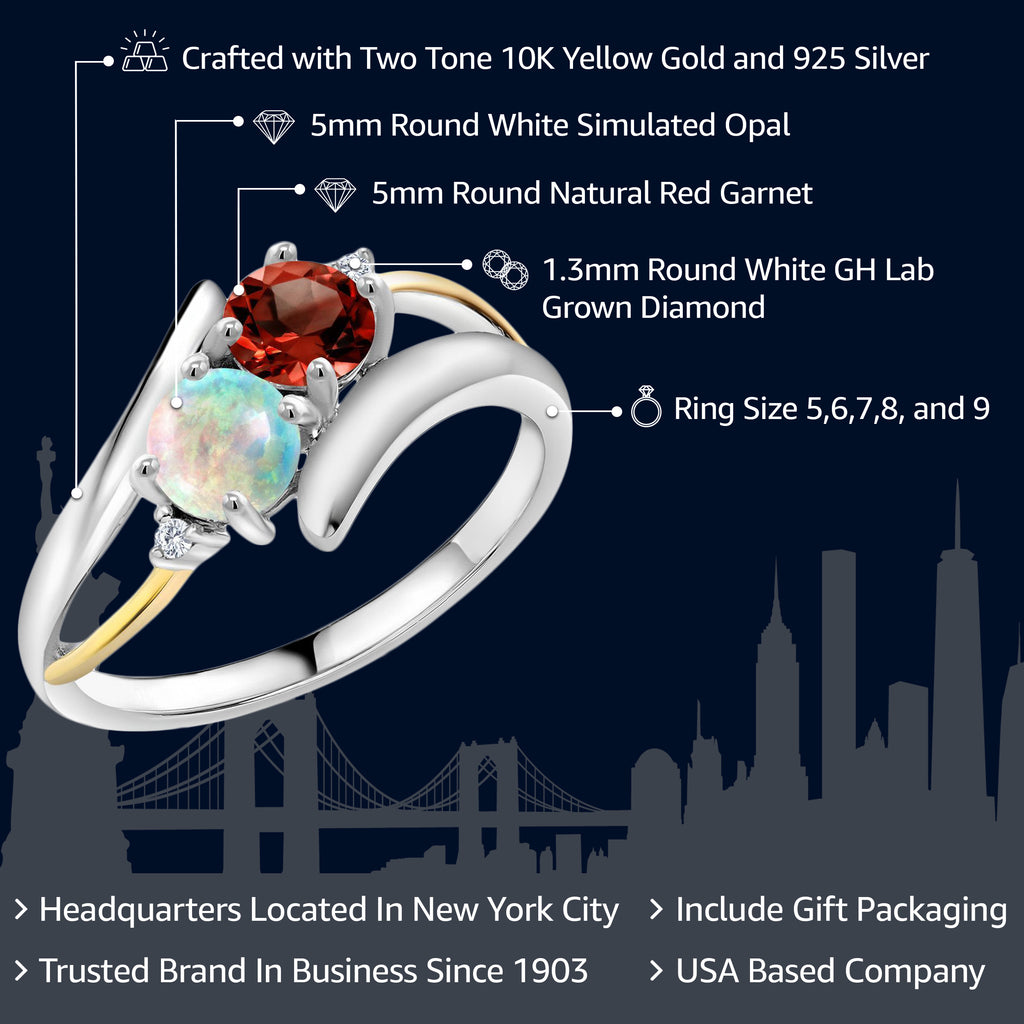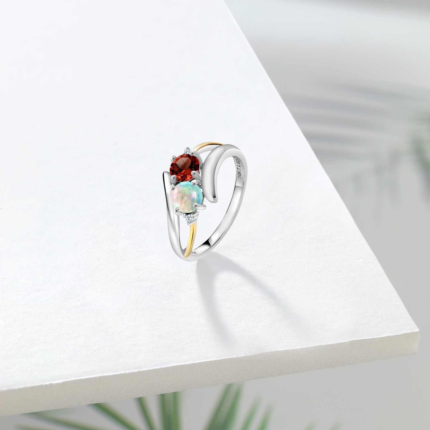 UNIQUE CROSSOVER DESIGN: Make a bold statement with this distinctive crossover ring featuring a captivating blend of 925 sterling silver and 10K yellow gold. The ring elegantly showcases two stunning gemstones – a vibrant red garnet and a mesmerizing white simulated opal – creating a unique and eye-catching design.