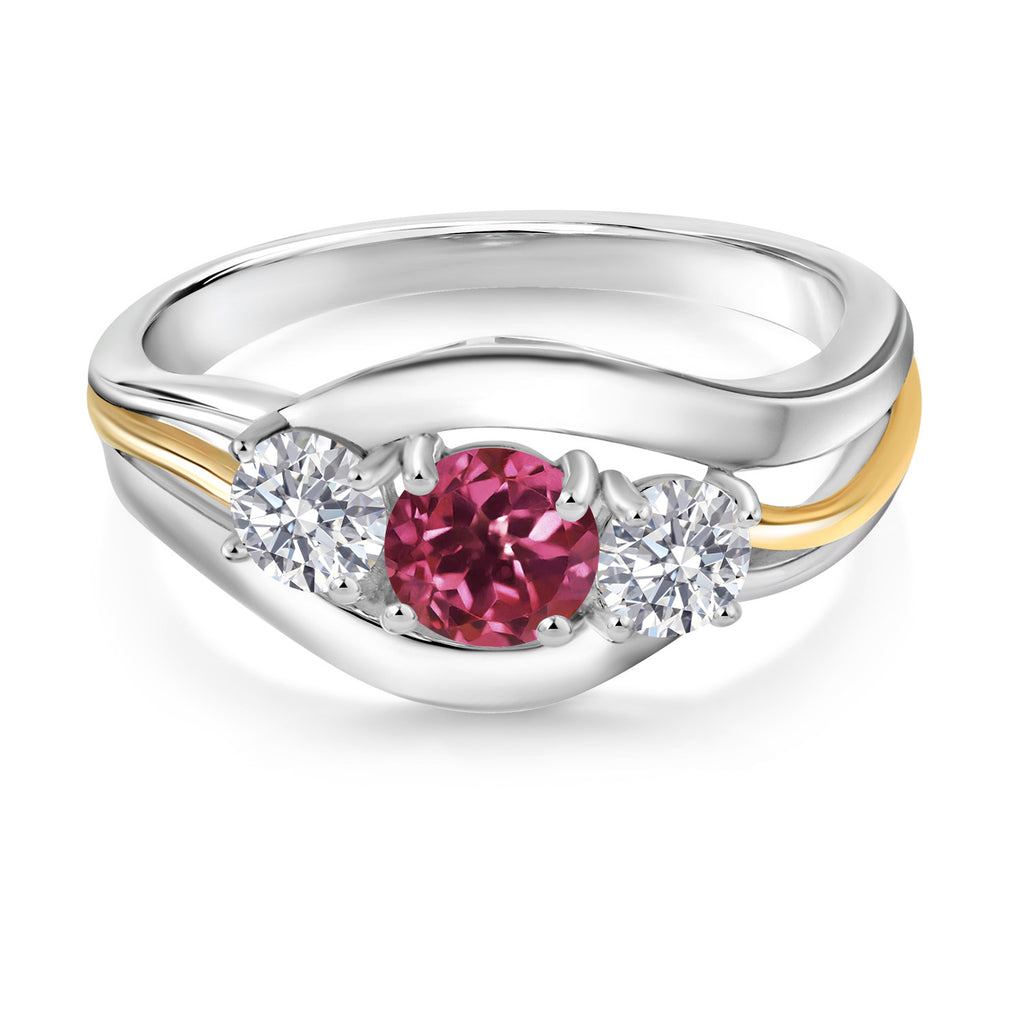 925 Sterling Silver and 10K Yellow Gold Round Pink Tourmaline and White Lab Grown Diamond 3 Stone Ring For Women (1.06 Cttw, Available In Size 5, 6, 7, 8, 9)