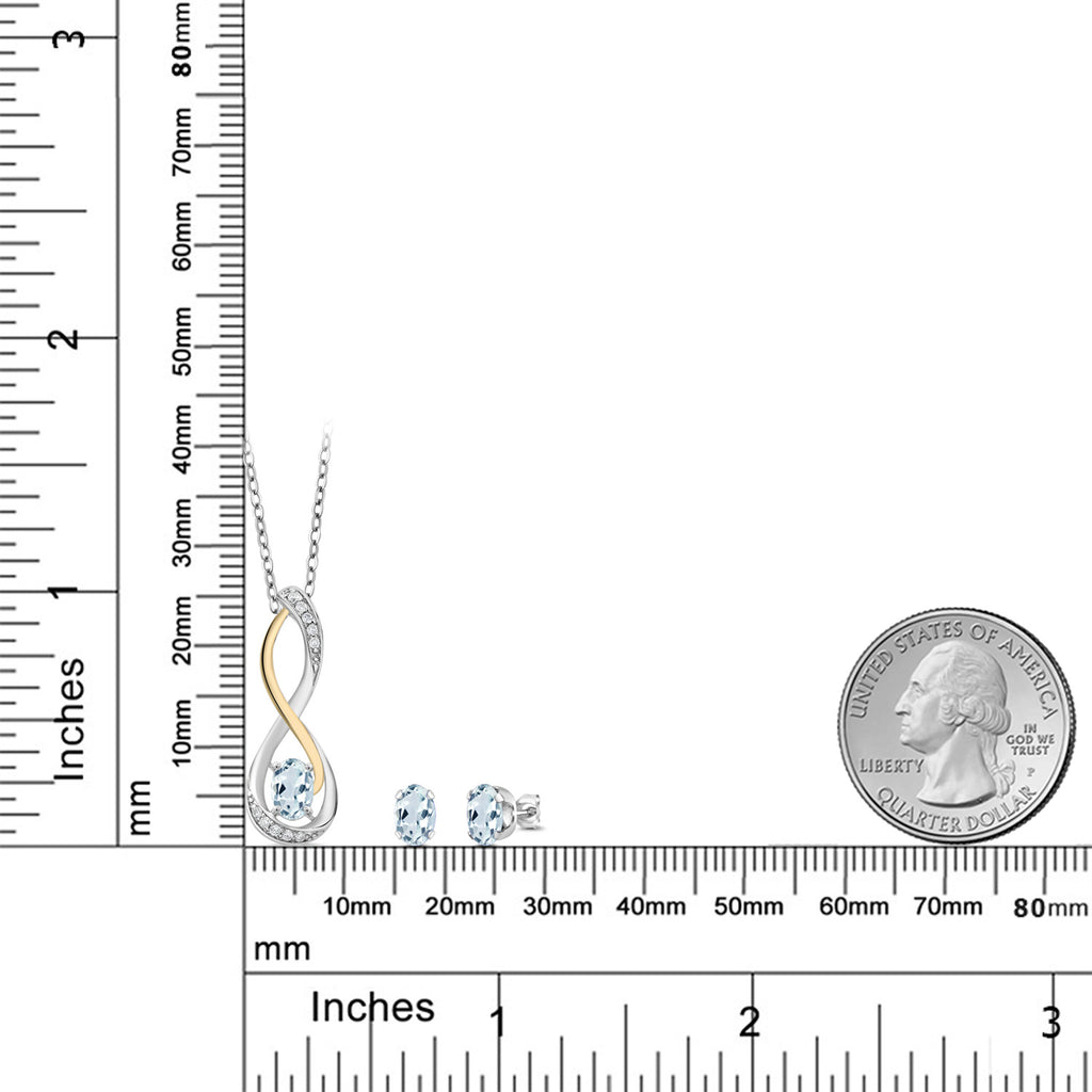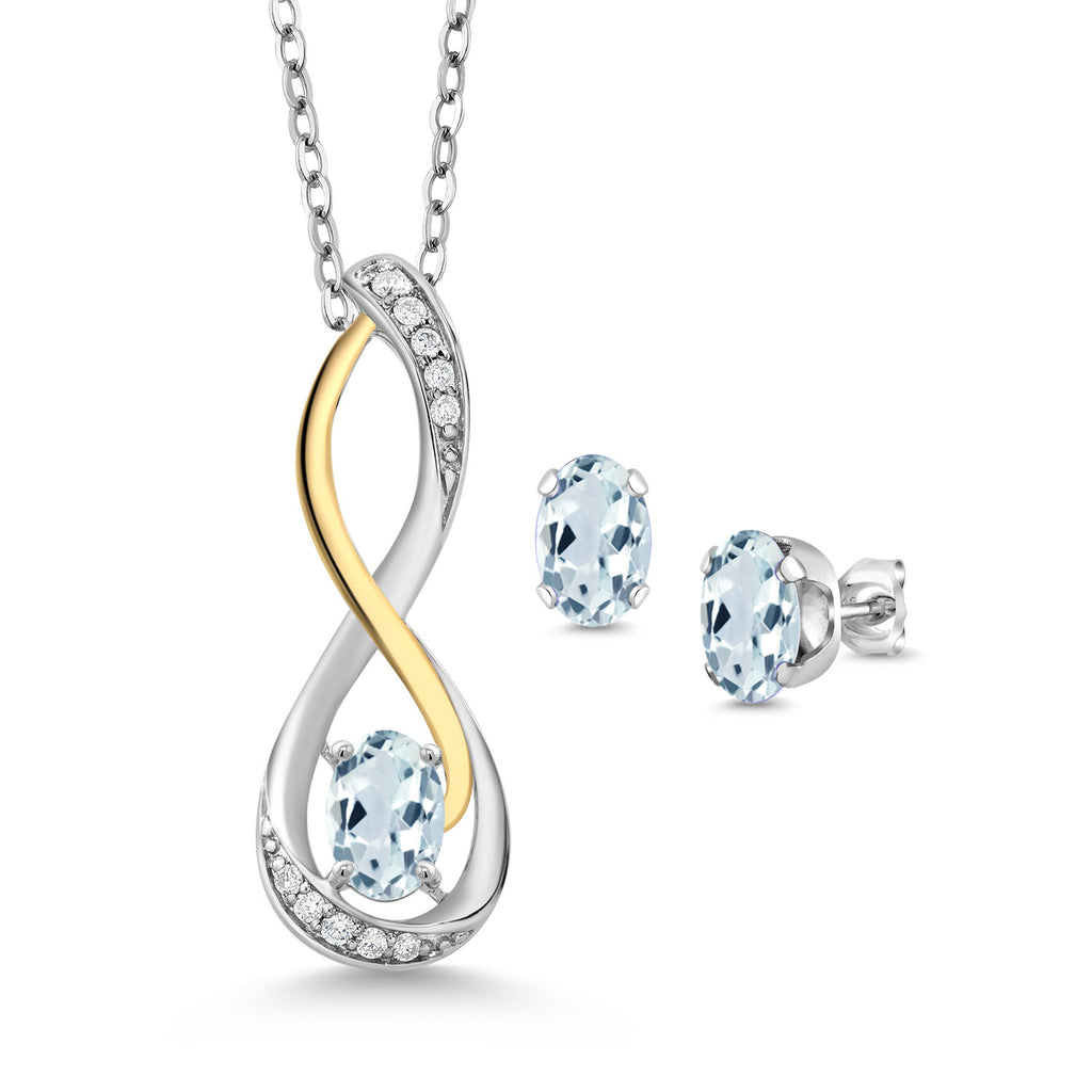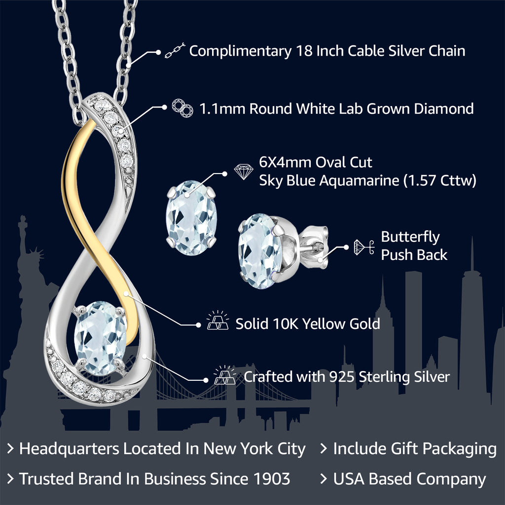 925 Sterling Silver and 10K Yellow Gold Sky Blue Aquamarine and White E-F Lab Grown Diamond Infinity Pendant and Earrings Jewelry Set For Women (1.57 Cttw, with 18 Inch Chain)