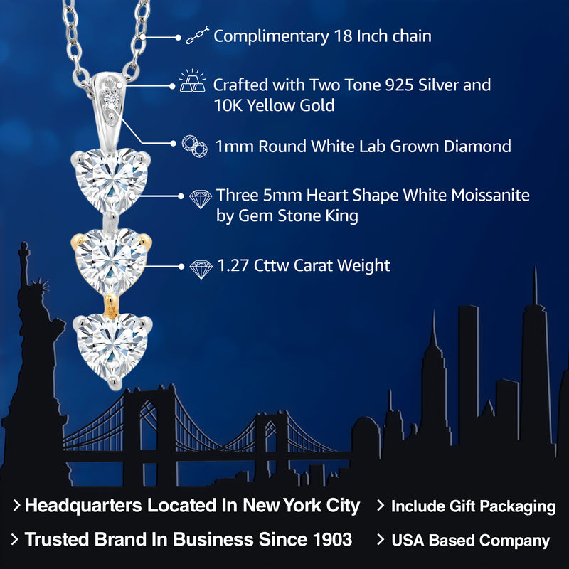 Gem Stone King 1.27 Cttw White Moissanite and Lab Grown Diamond 3-Stone Heart Shape Pendant Necklace for Women By Keren Hanan | 925 Sterling Silver and 10K Yellow Gold | With 18 Inch Chain