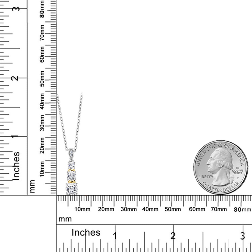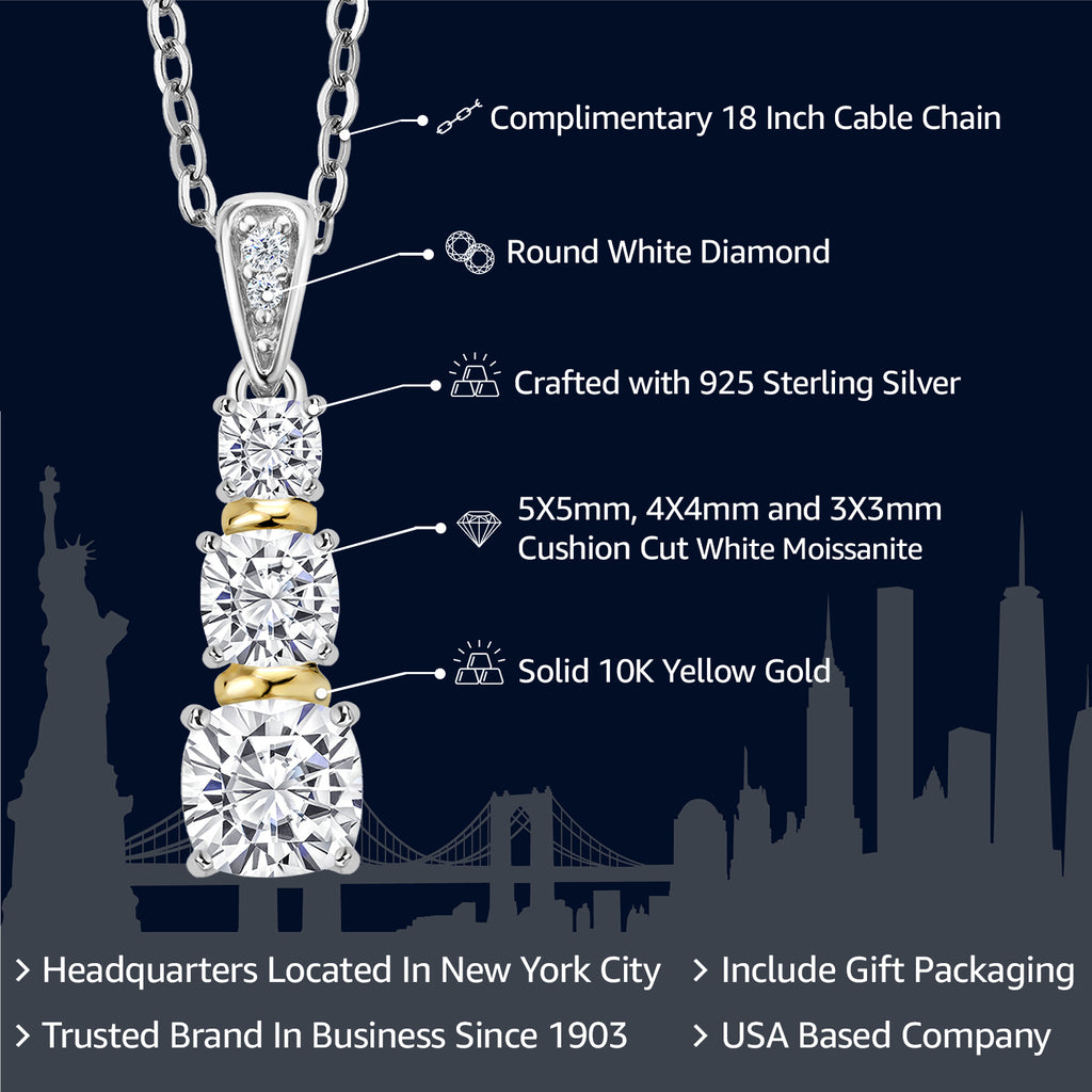 925 Sterling Silver and 10K Yellow Gold White Moissanite and White Diamond 3 Stone Pendant Necklace For Women (1.08 Cttw, Cushion 5MM, 4MM and 3MM, with 18 Inch Chain)