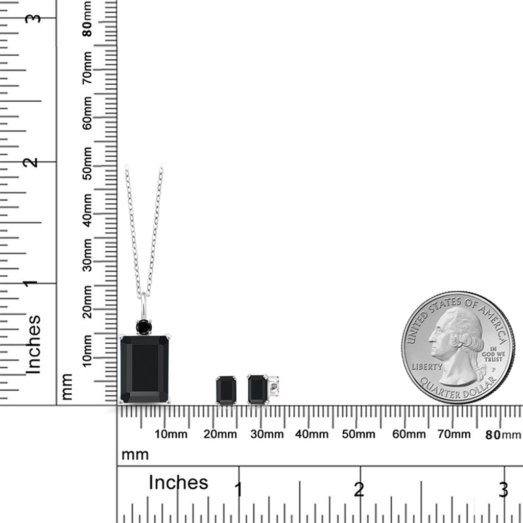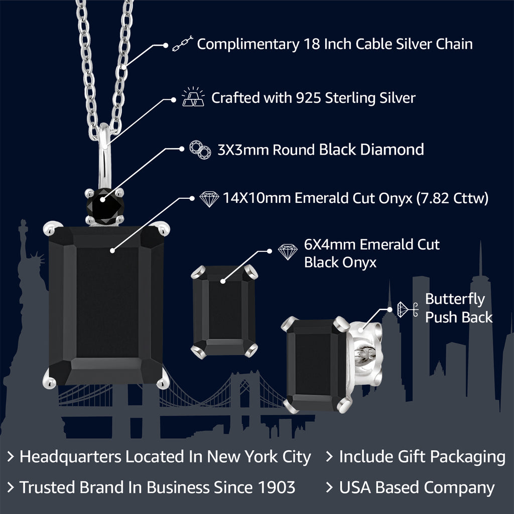 925 Sterling Silver Black Onyx and Black Diamond Pendant Necklace Earrings Set For Women (7.82 Cttw, Gemstone December Birthstone, Emerald Cut 14X10MM and 6X4MM, with 18 Inch Chain)