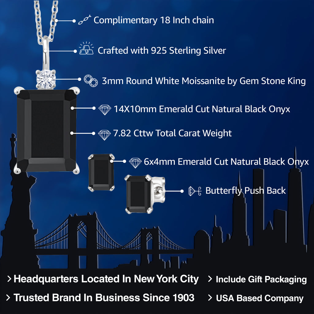 EXCEPTIONAL QUALITY AND CRAFTSMANSHIP: This exquisite jewelry set features a total of 7.82 Cttw, showcasing striking black onyx and brilliant white moissanite gemstones. The set includes an emerald cut 14X10MM black onyx pendant with an 18-inch chain and matching 6X4MM earrings, all crafted from high-quality 925 sterling silver, ensuring durability and a luxurious finish.