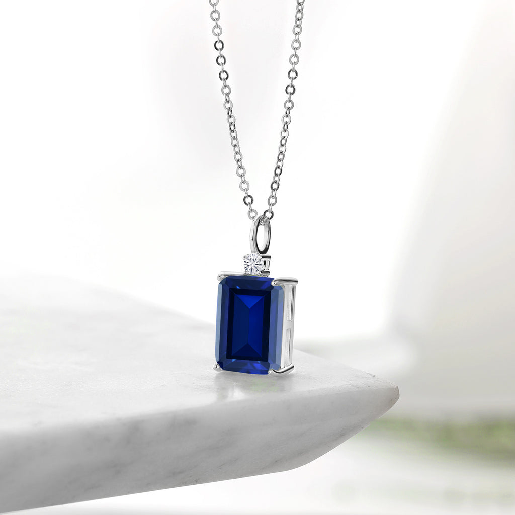 EXQUISITE GEMSTONE COMBINATION: Elevate your jewelry collection with this captivating pendant necklace featuring a 10.10 Cttw, 14x10mm Emerald Cut Blue Created Sapphire paired with brilliant Moissanite accents. The striking contrast between the deep blue sapphire and the dazzling moissanite creates a mesmerizing visual impact.