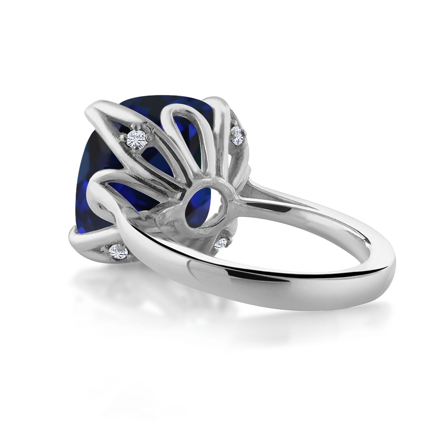 925 Sterling Silver Blue Created Sapphire and White Moissanite Engagement Ring For Women (14.10 Cttw, 14MM Cushion, Available in Size 5,6,7,8,9)