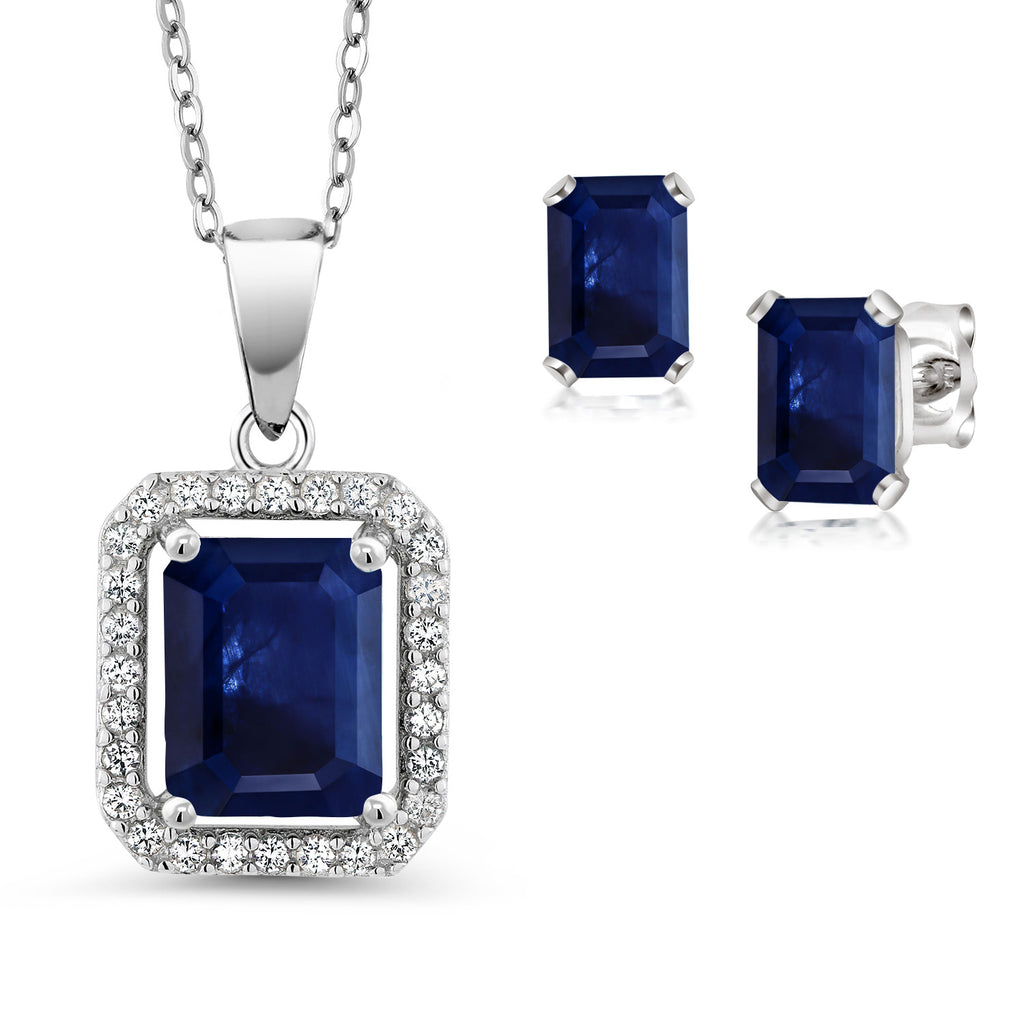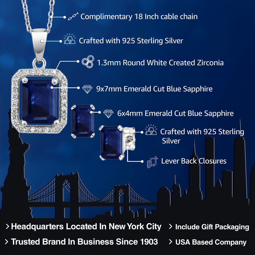 925 Sterling Silver Blue Sapphire Pendant and Earrings Jewelry Set For Women (4.04 Cttw, Emerald Cut 9X7MM and 6X4MM, Gemstone September Birthstone, with 18 Inch Chain)