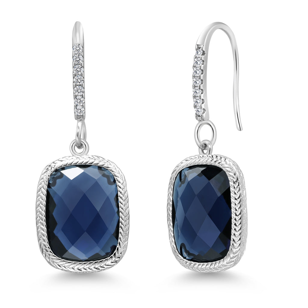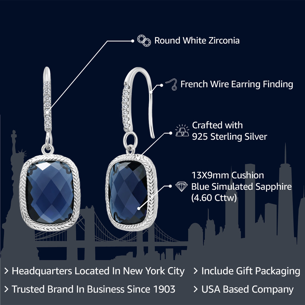 These earrings feature stunning cushion-cut simulated sapphire, each measuring 13x9mm, showcasing a brilliant blue hue reminiscent of clear ocean waters, adding a touch of elegance and sophistication to any attire. Total Carat Weight is 4.60 cttw.