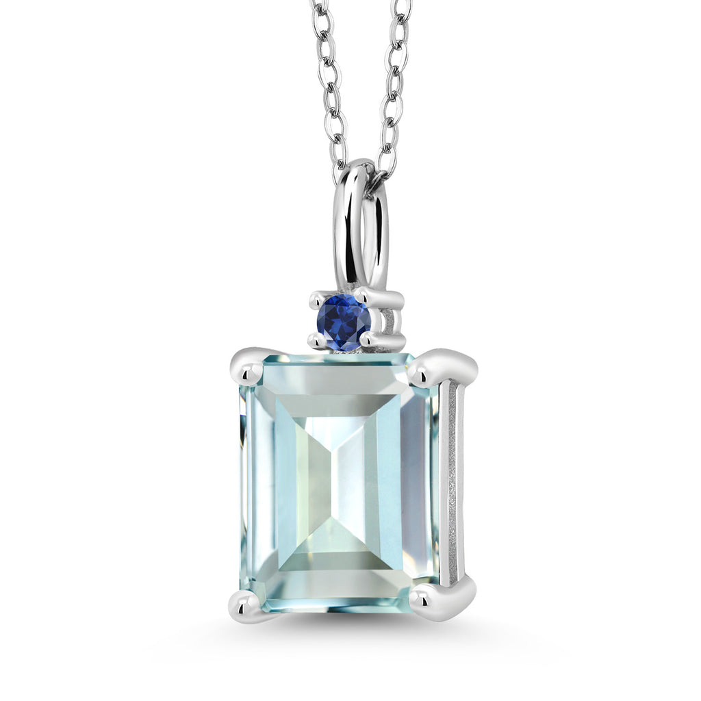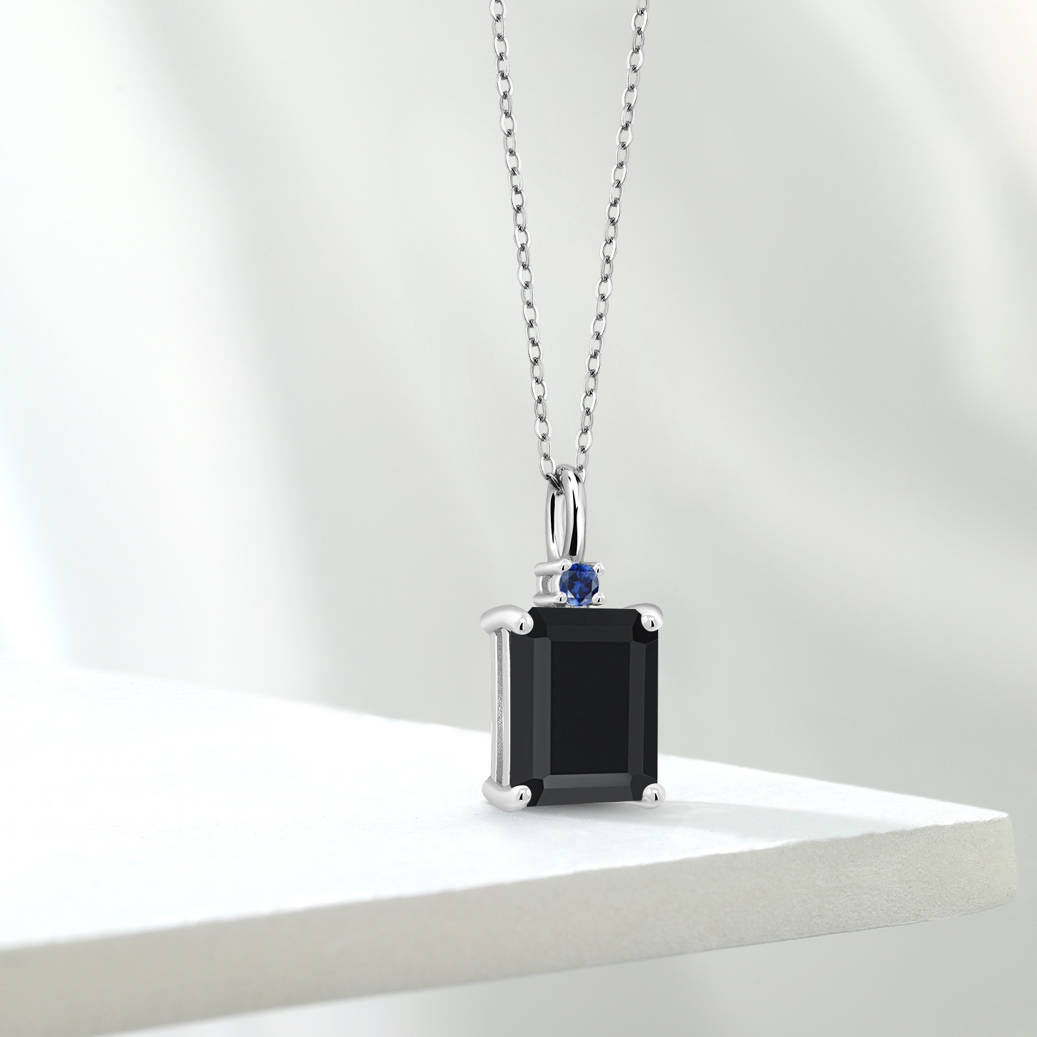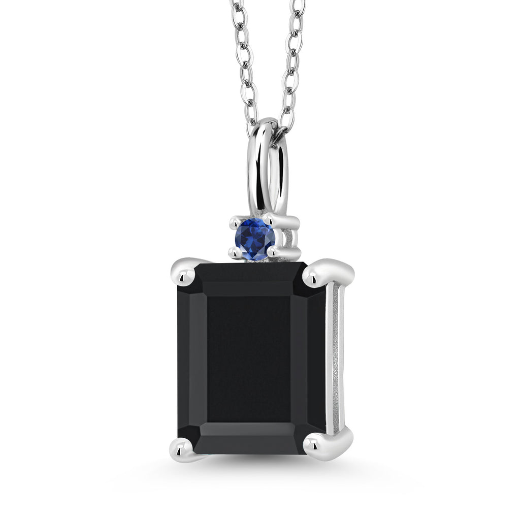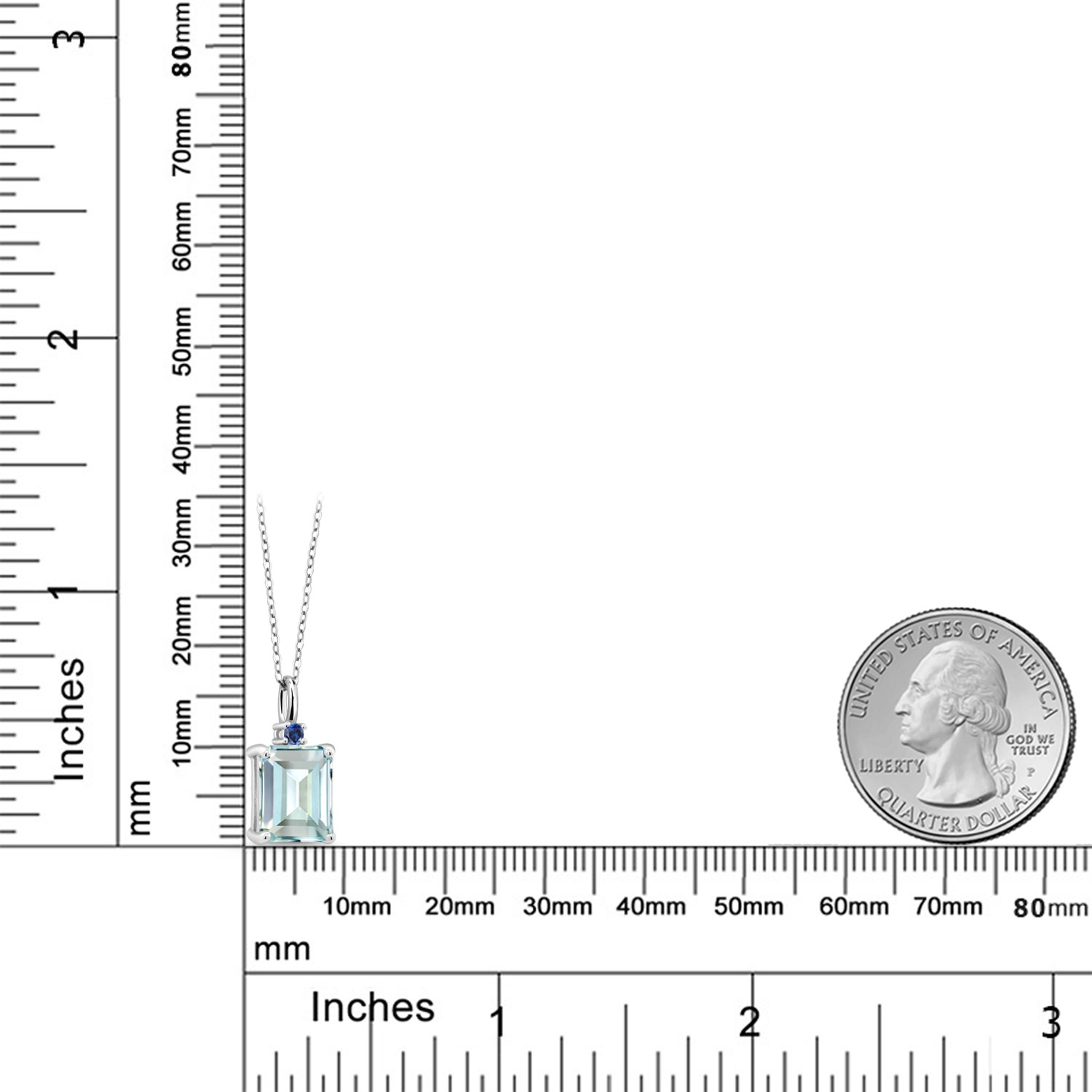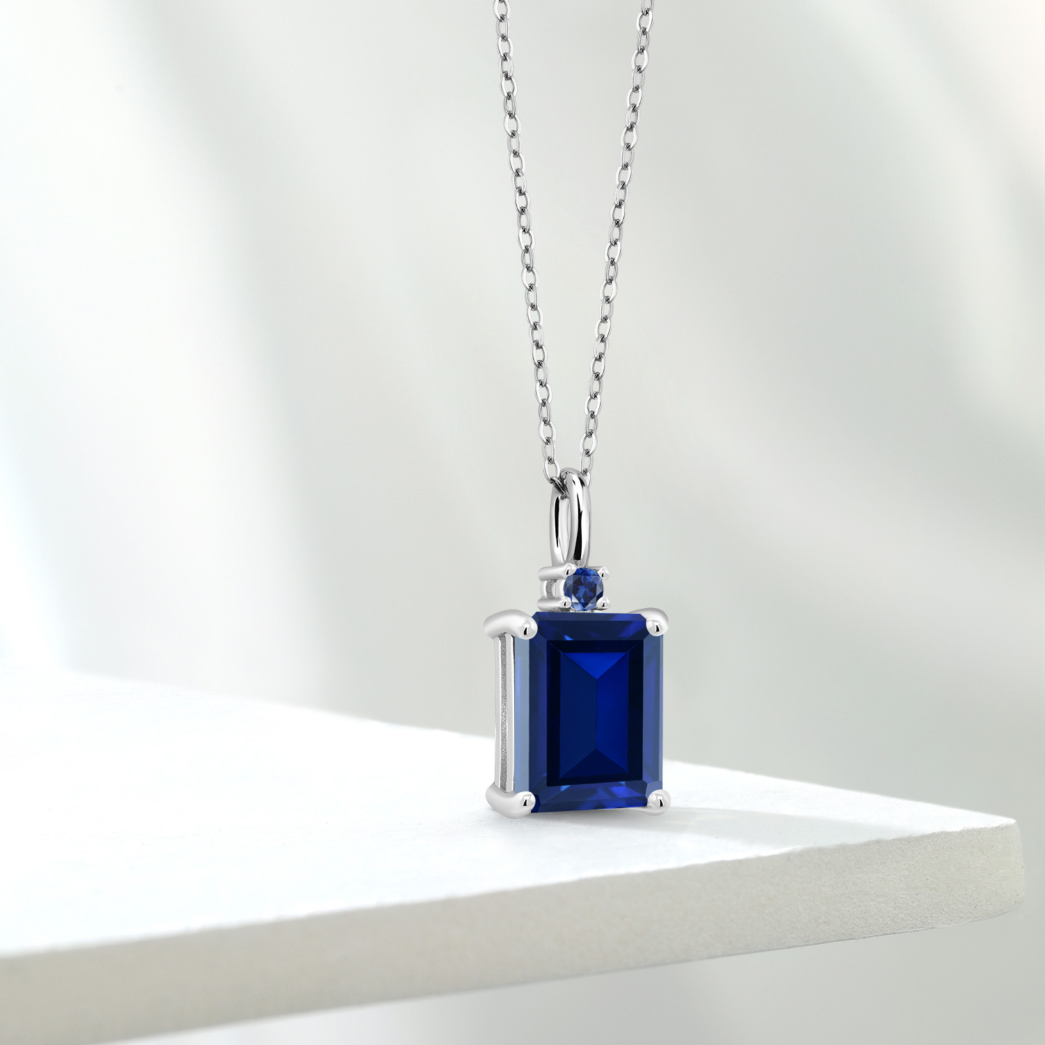 925 Sterling Silver Gemstone Birthstone and Blue Created Sapphire Pendant Necklace for Women | Emerald Cut 10X8MM and Round 2MM | With 18 Inch Chain | Fine Jewelry for Her Mom Wife
