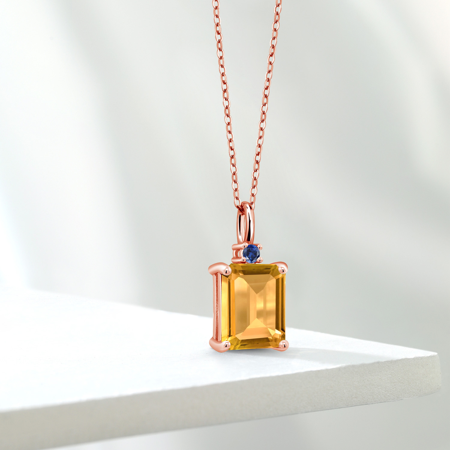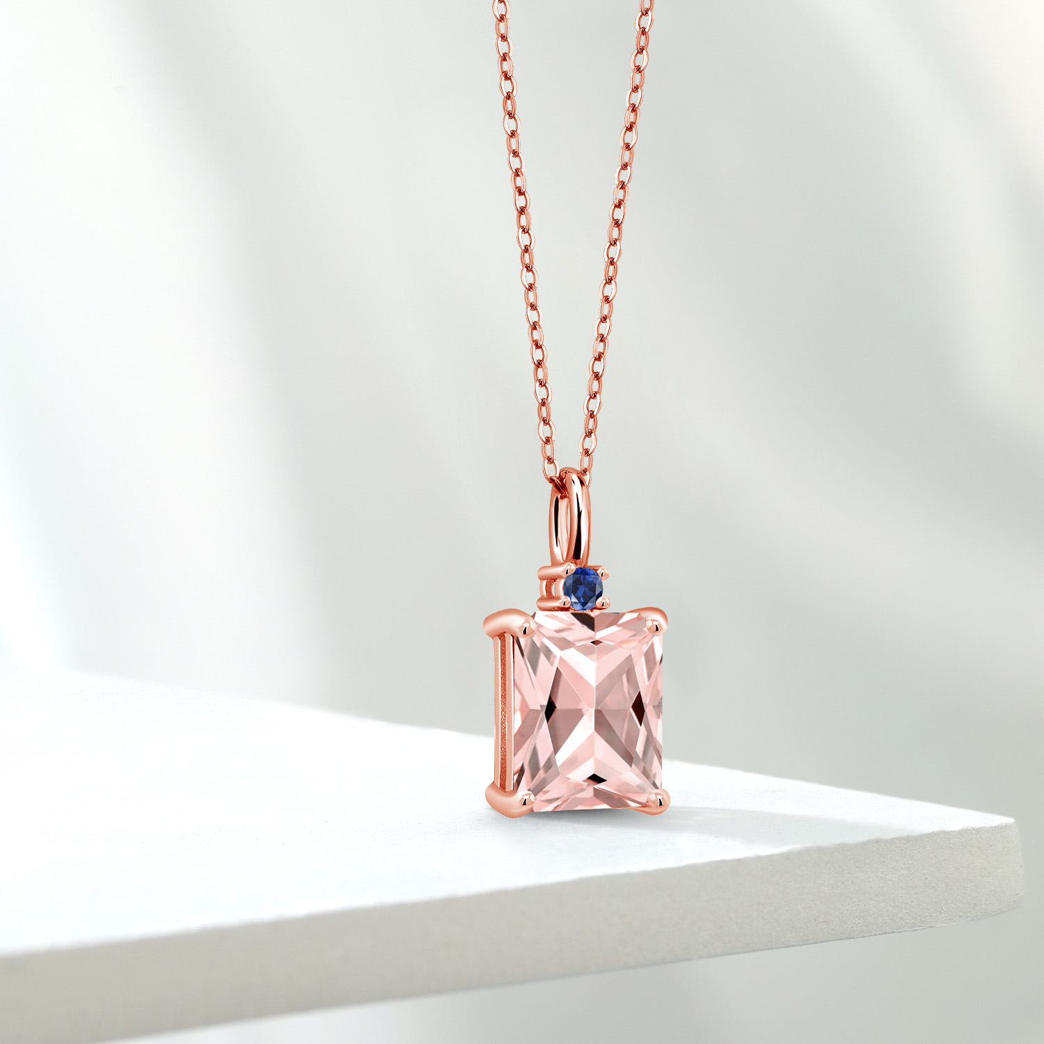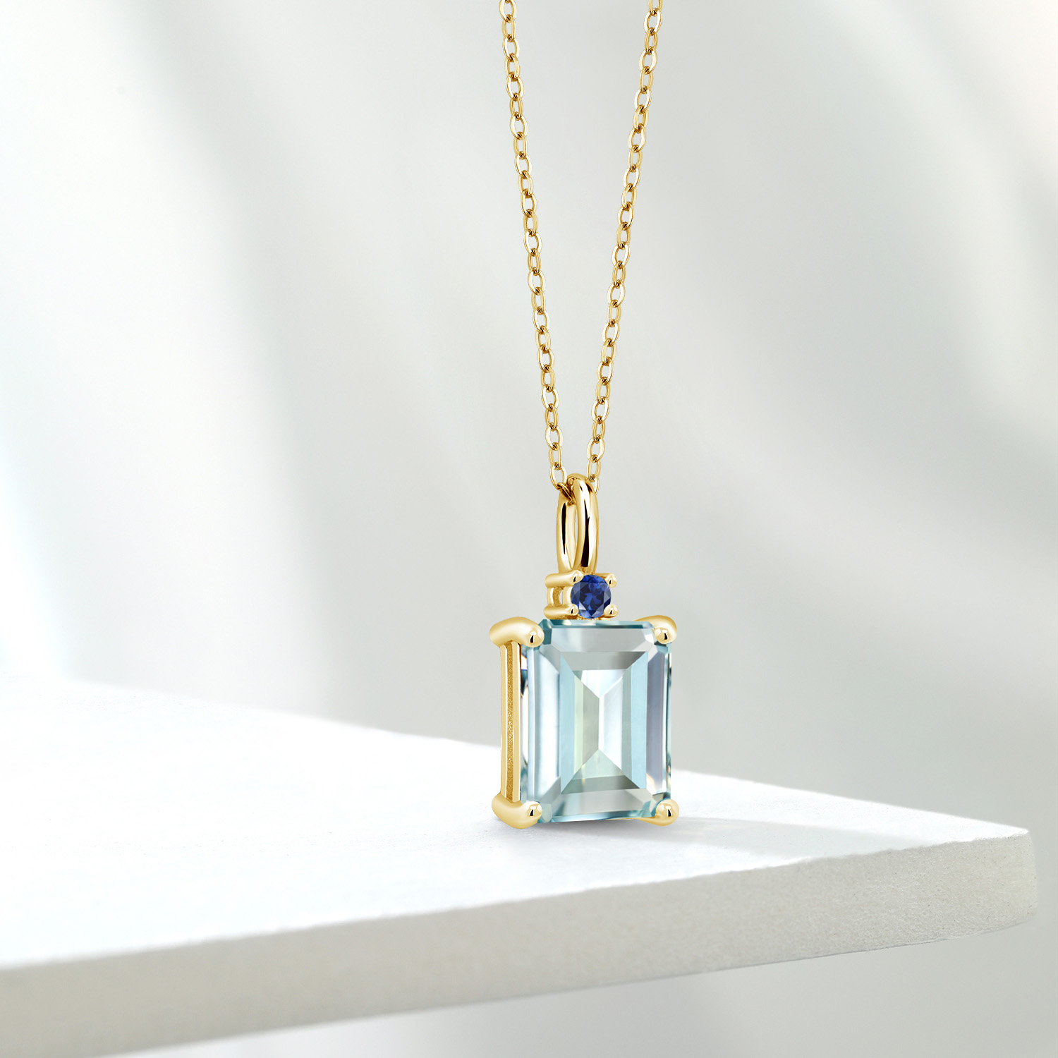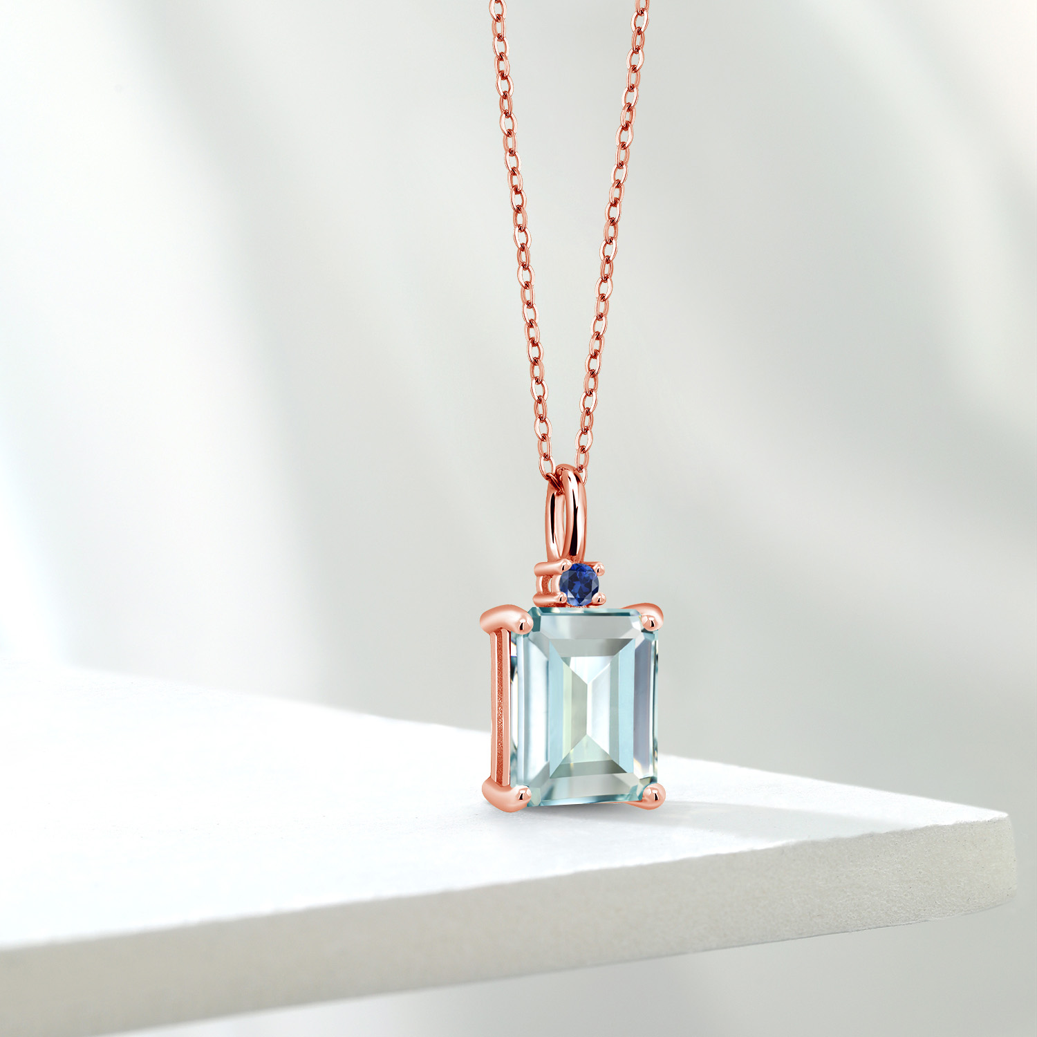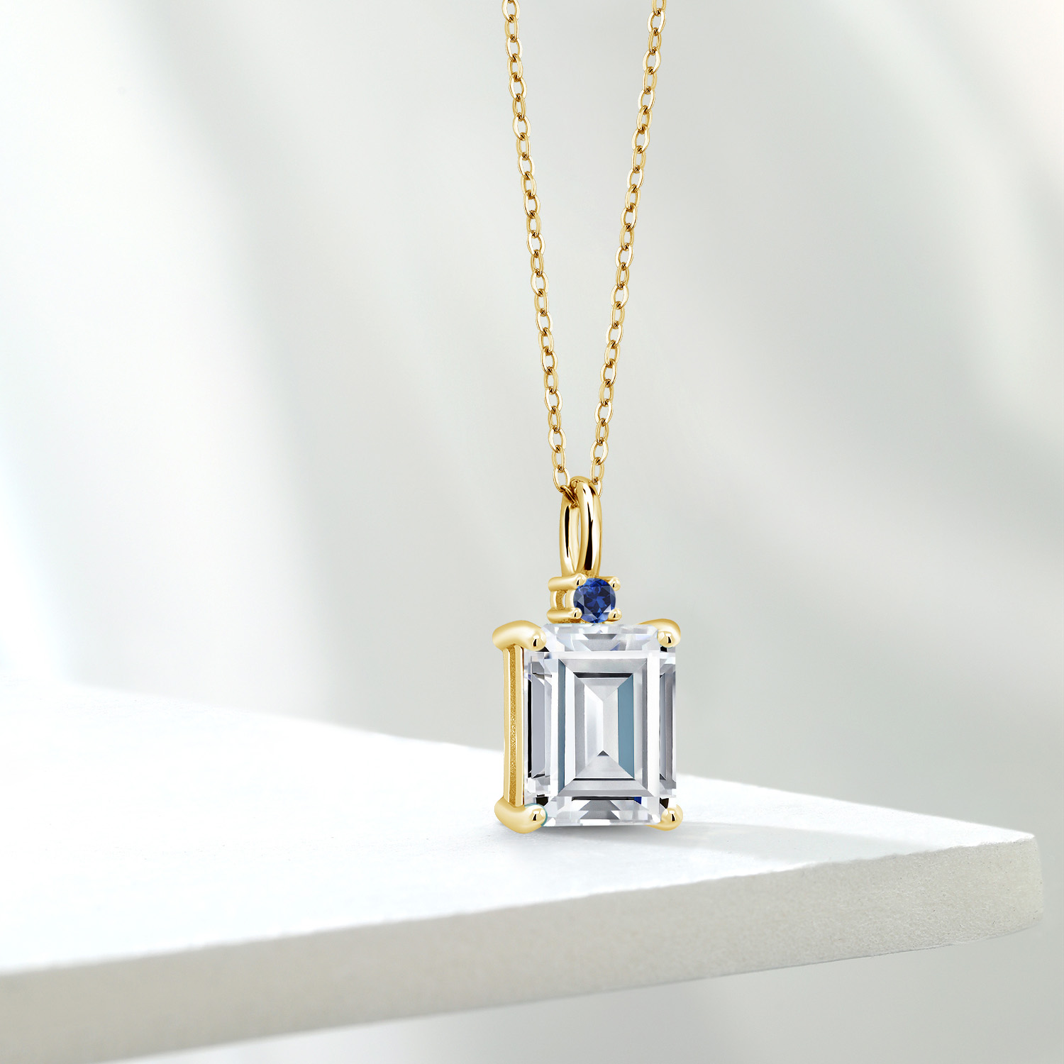 925 Sterling Silver Gemstone Birthstone and Blue Created Sapphire Pendant Necklace for Women | Emerald Cut 10X8MM and Round 2MM | With 18 Inch Chain | Fine Jewelry for Her Mom Wife
