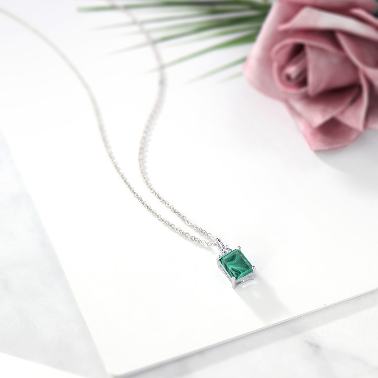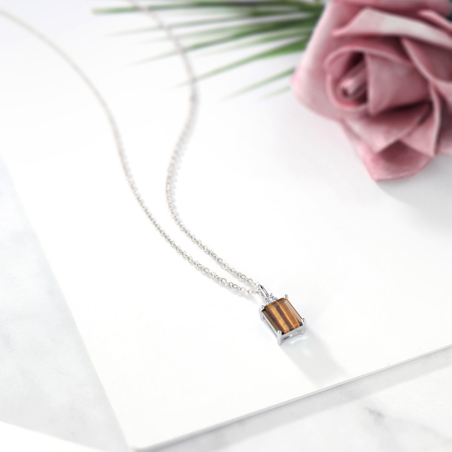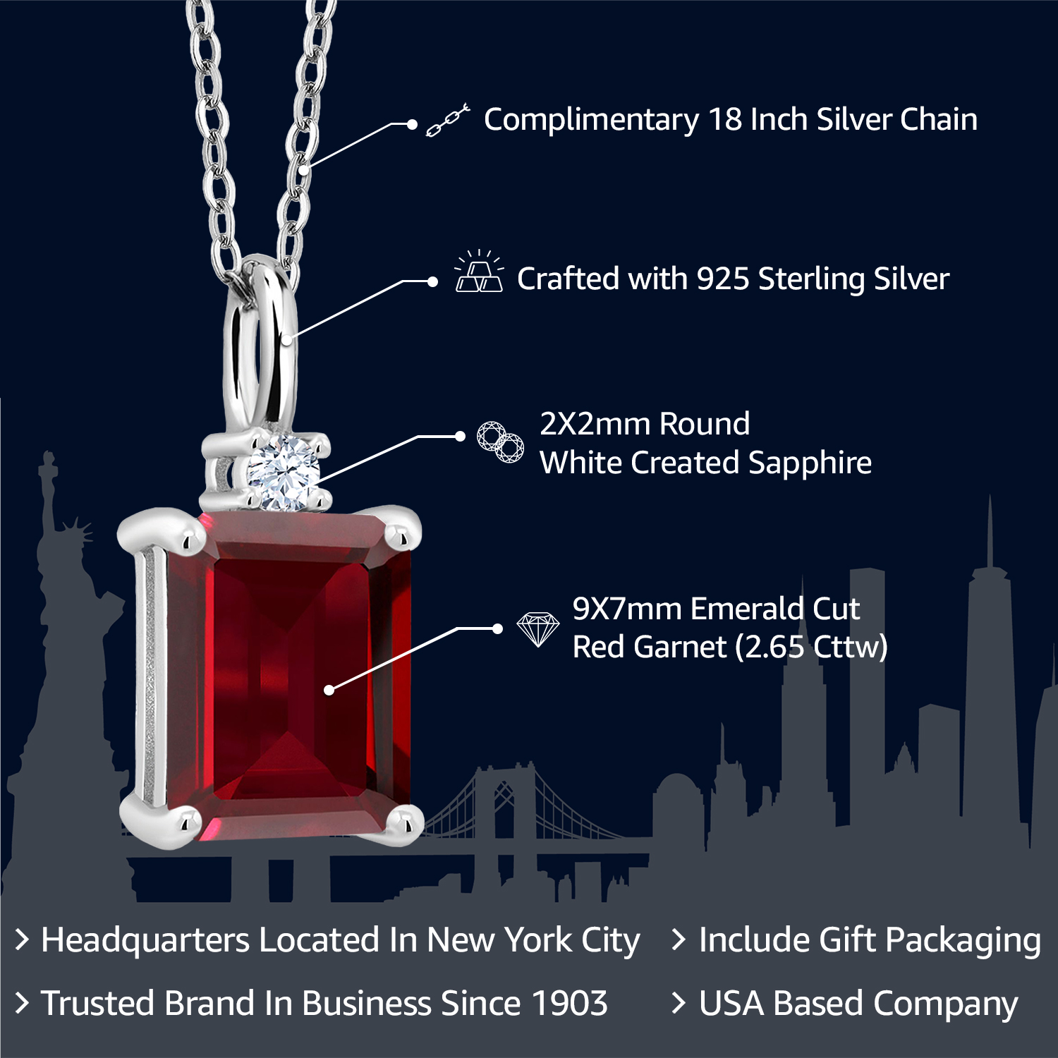 925 Sterling Silver Gemstone Birthstone and White Created Sapphire Solitaire Pendant Necklace for Women | Emerald Cut 9X7MM and Round 2MM | With 18 Inch Chain | Fine Jewelry for Her Mom Wife
