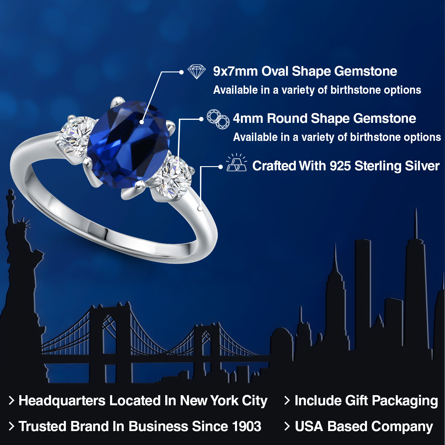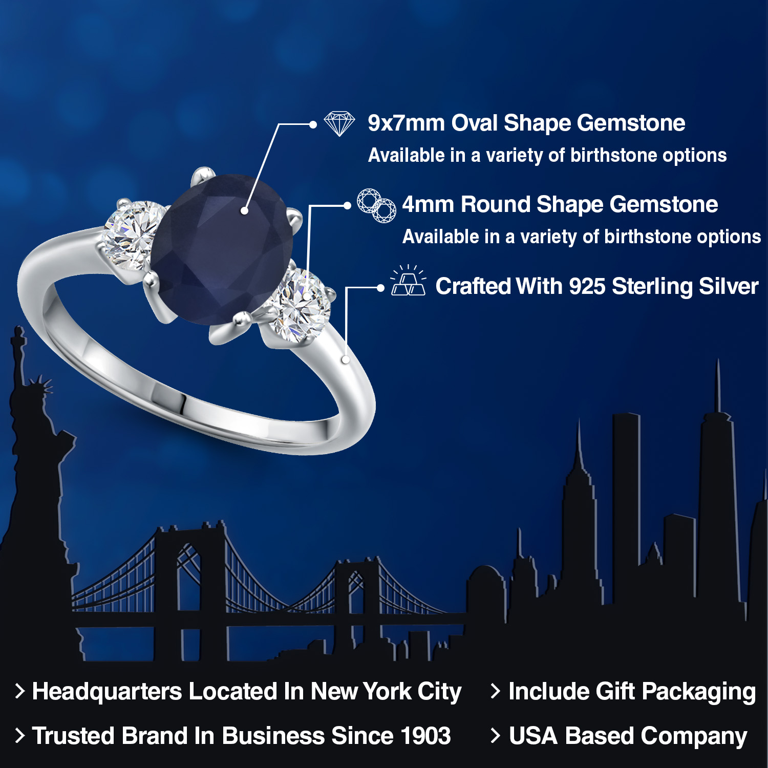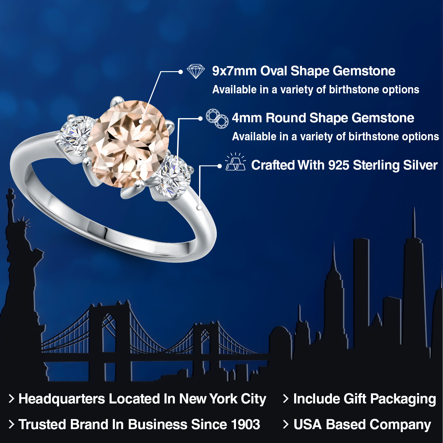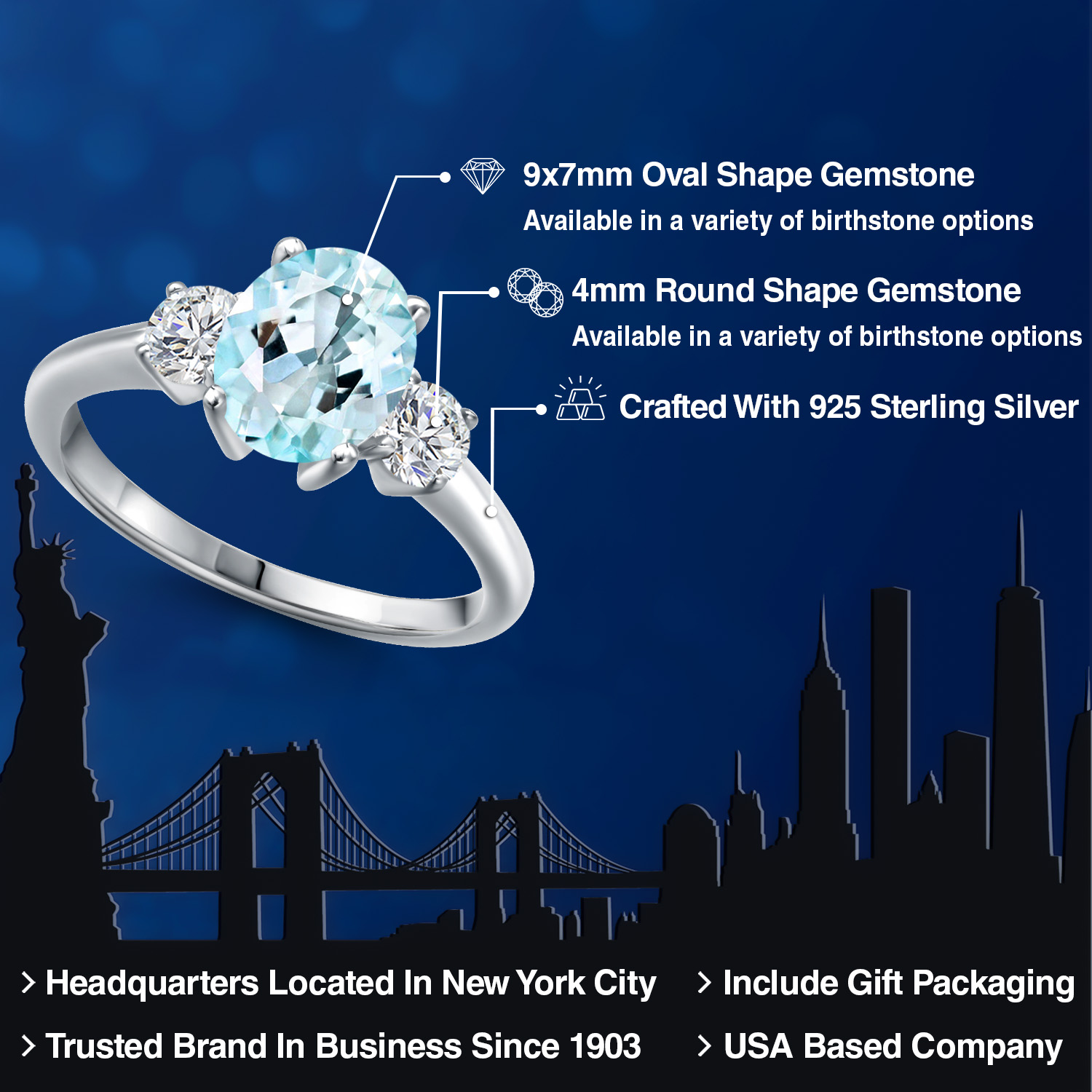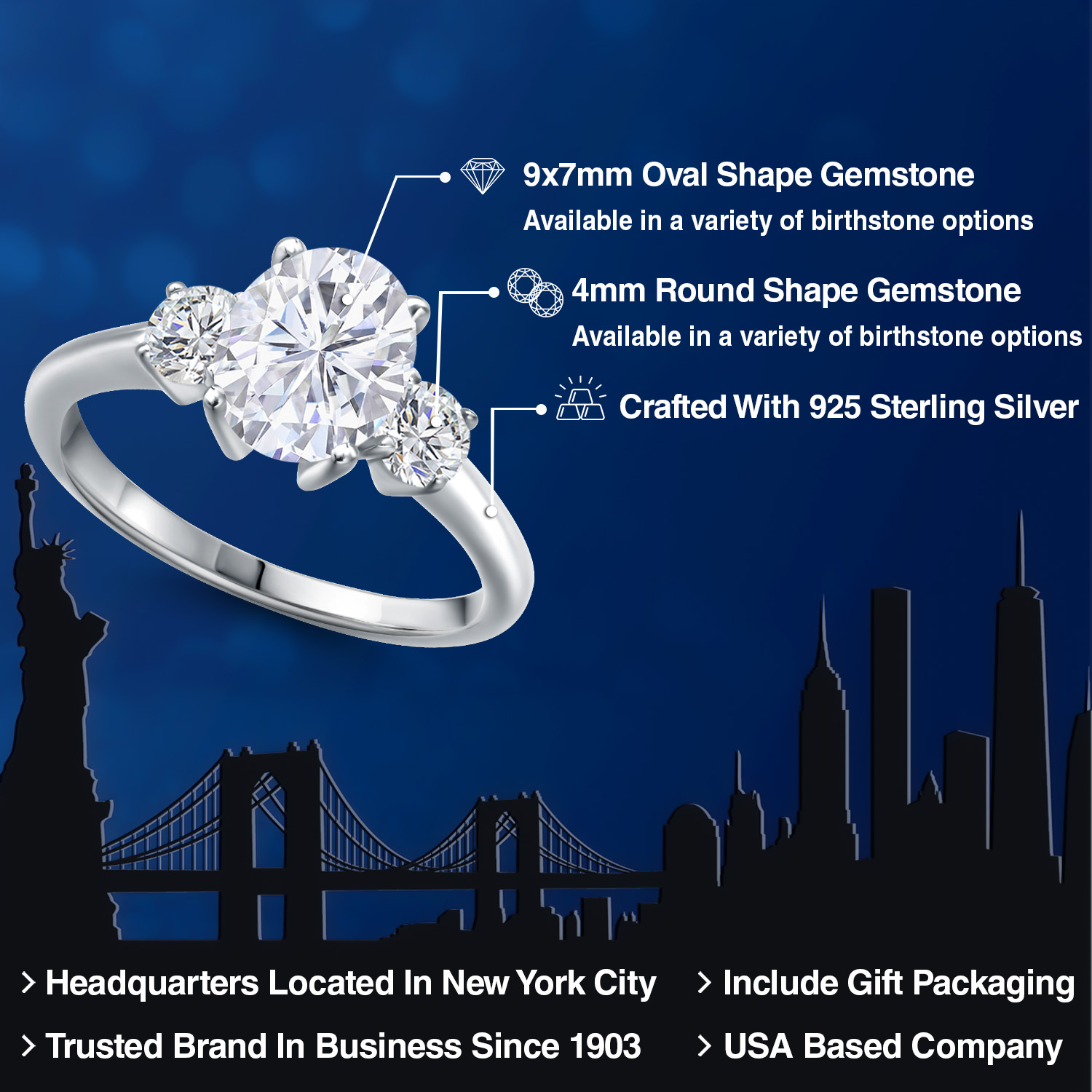 925 Sterling Silver Gemstone Birthstone and White Lab Grown Diamond 3-Stone Engagement Ring for Women | Oval 9X7MM and Round 4MM | Three Stone Wedding Anniversary Promise Ring | Sizes 5, 6, 7, 8, 9