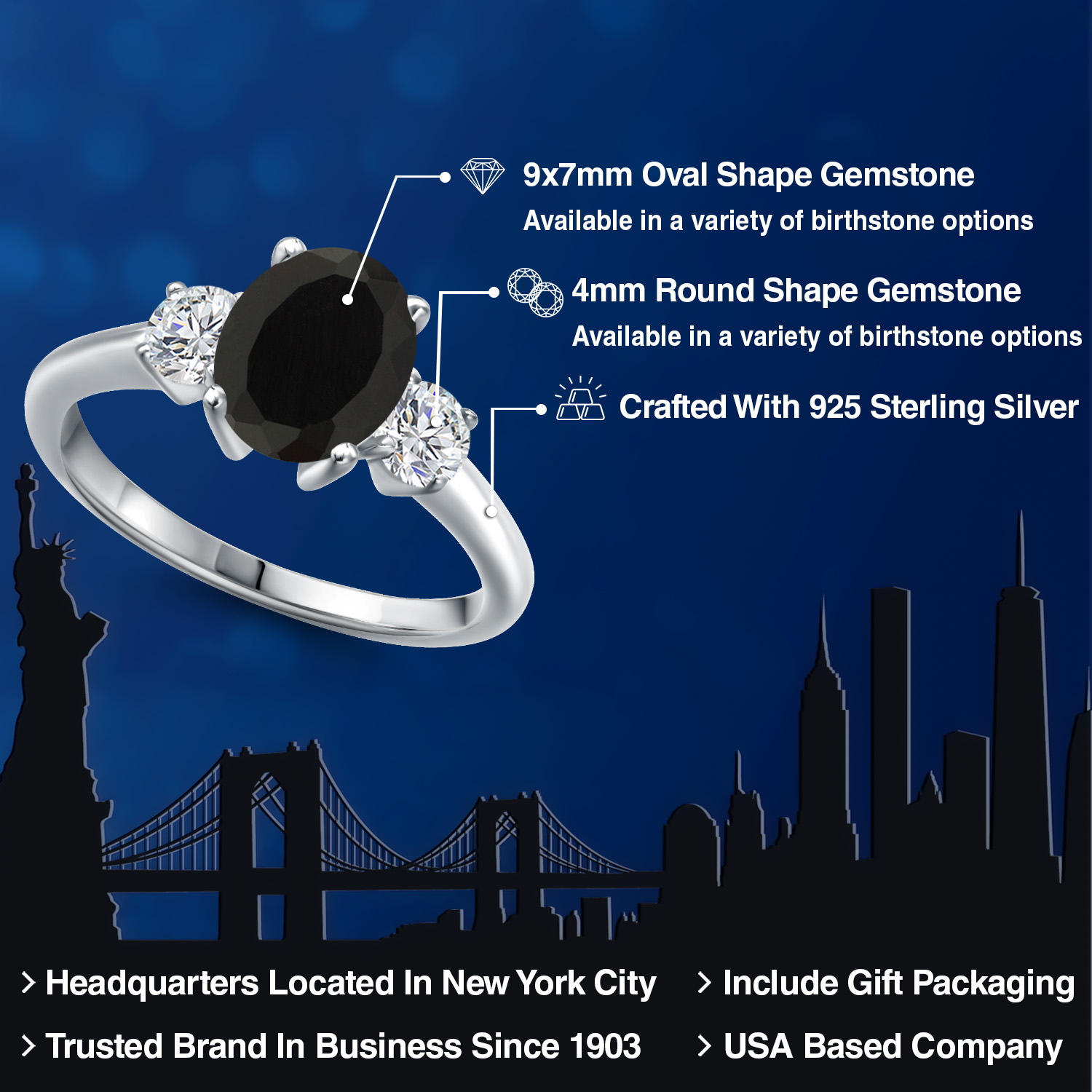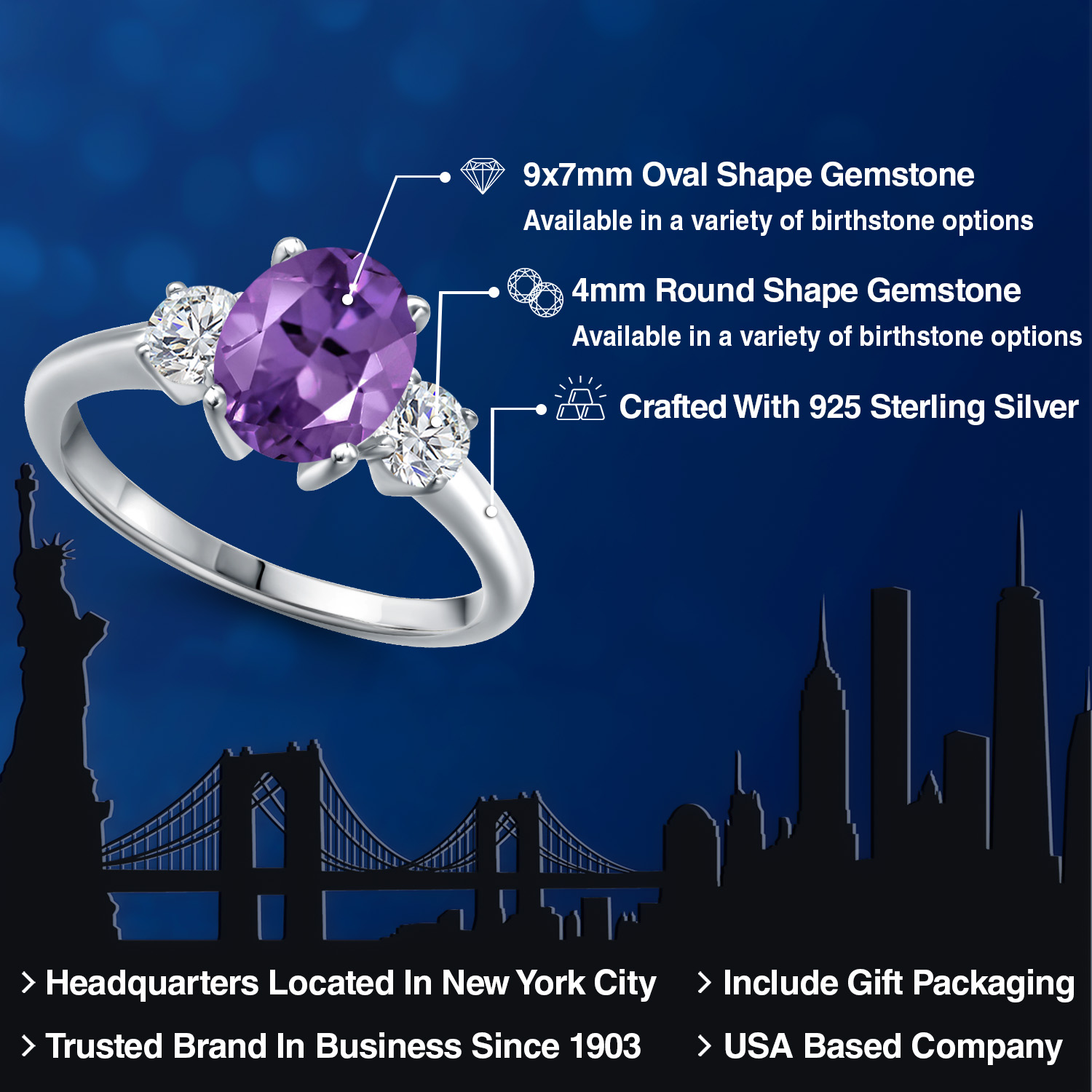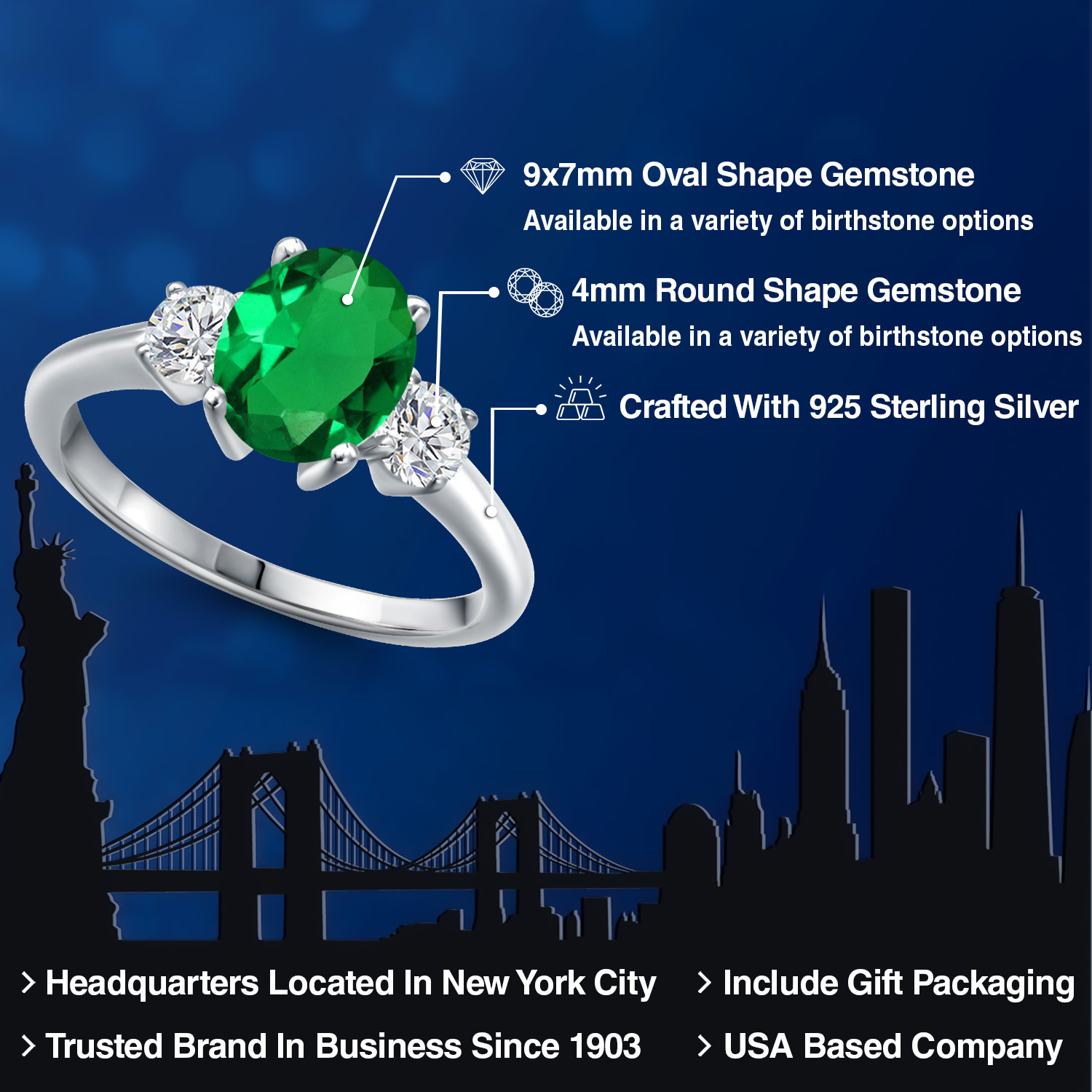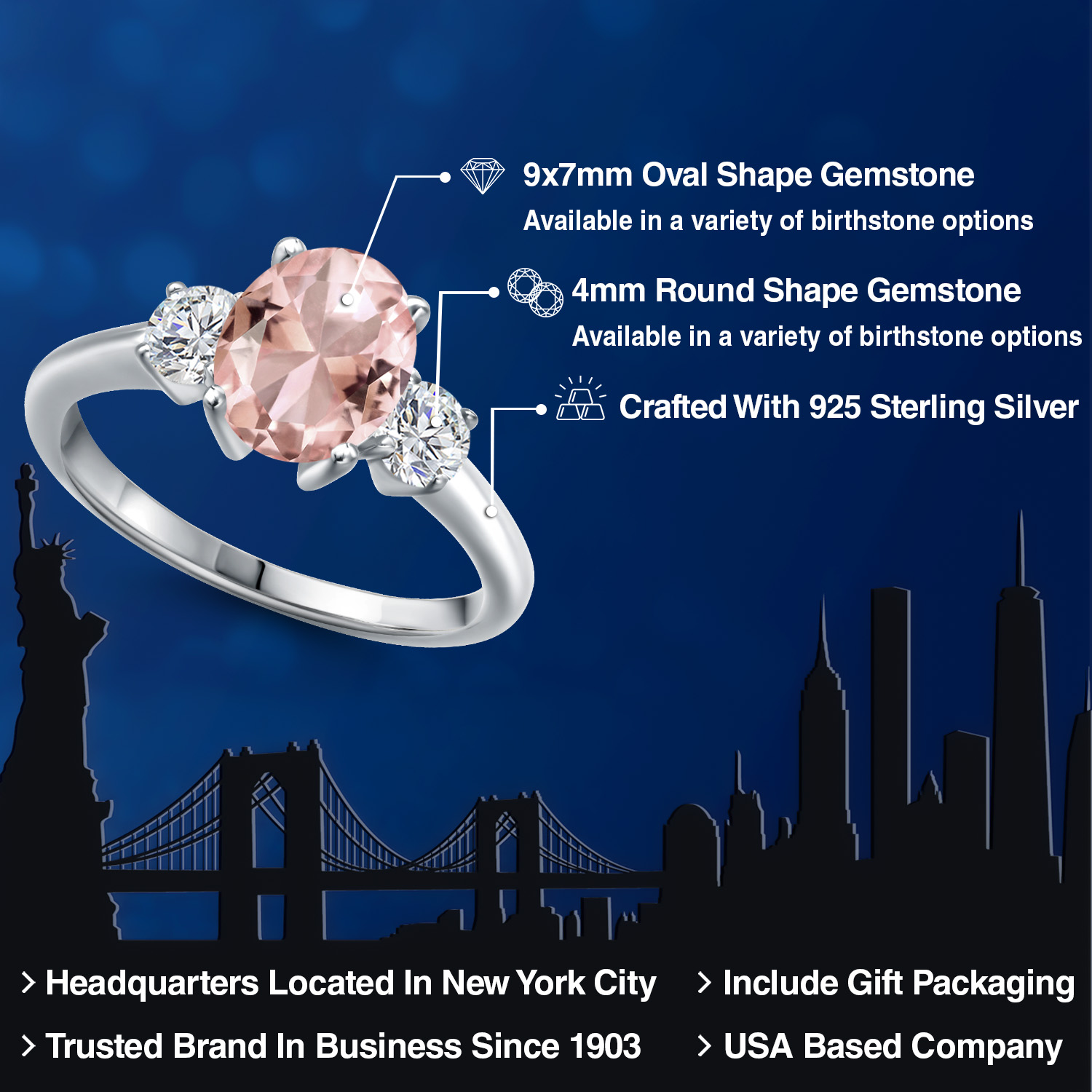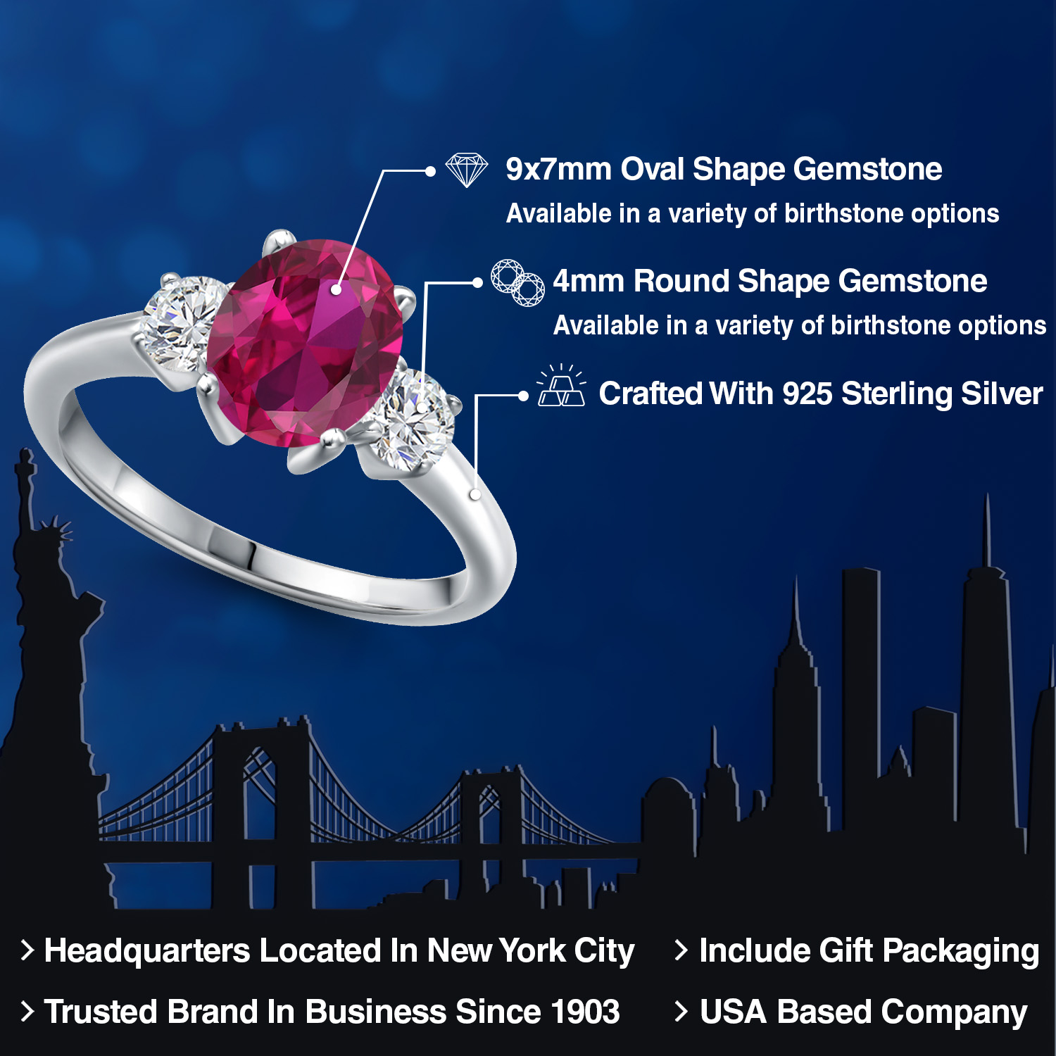 925 Sterling Silver Gemstone Birthstone and White Lab Grown Diamond 3-Stone Engagement Ring for Women | Oval 9X7MM and Round 4MM | Three Stone Wedding Anniversary Promise Ring | Sizes 5, 6, 7, 8, 9