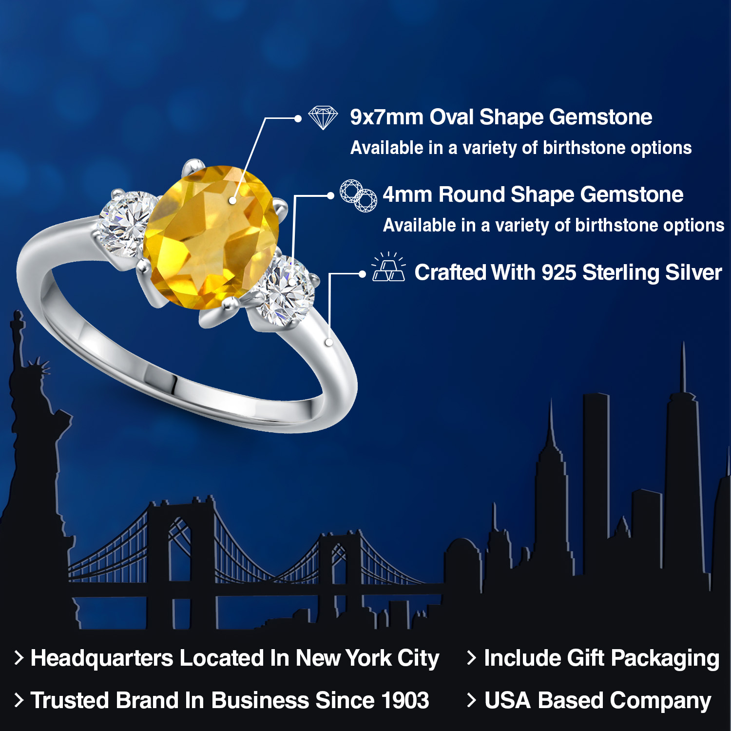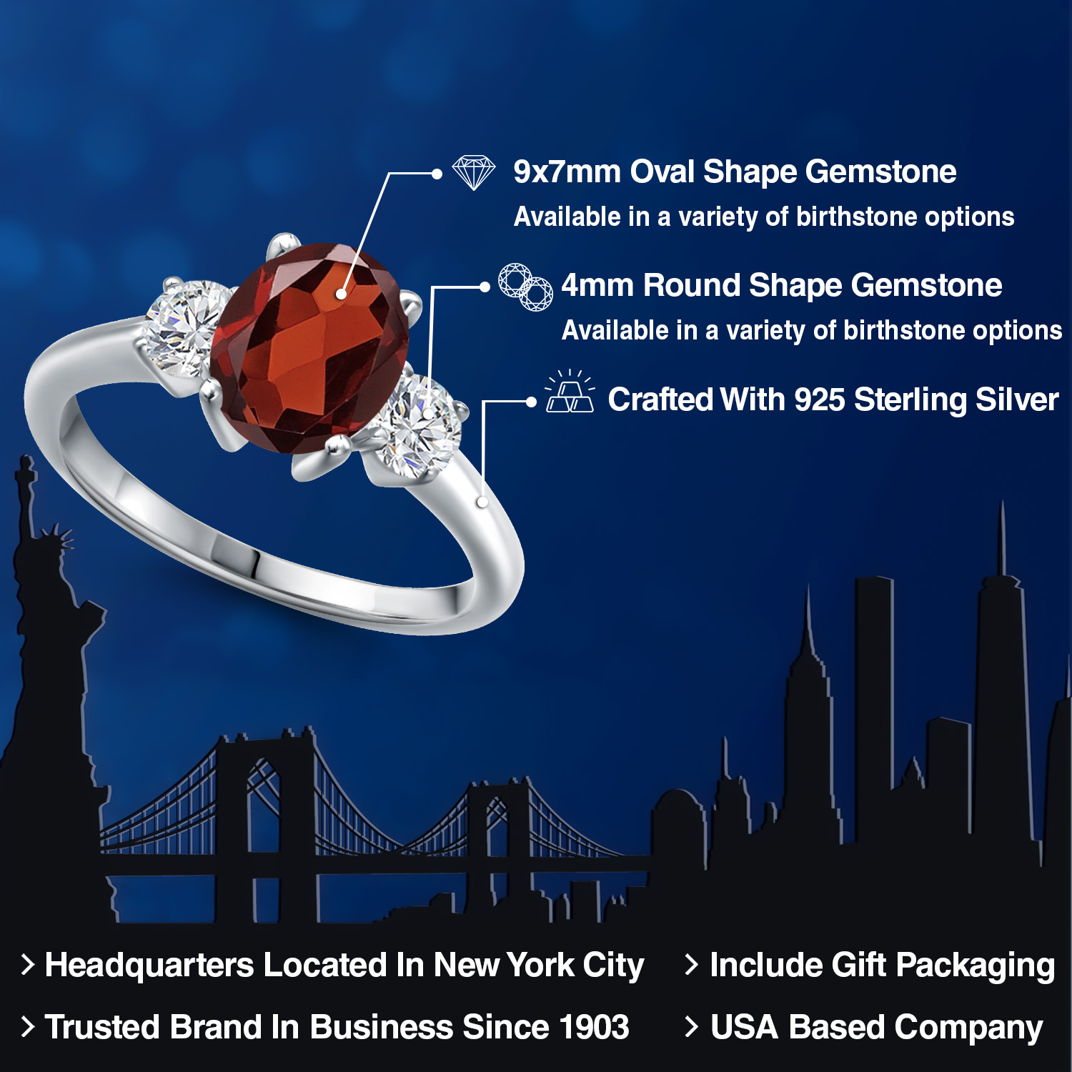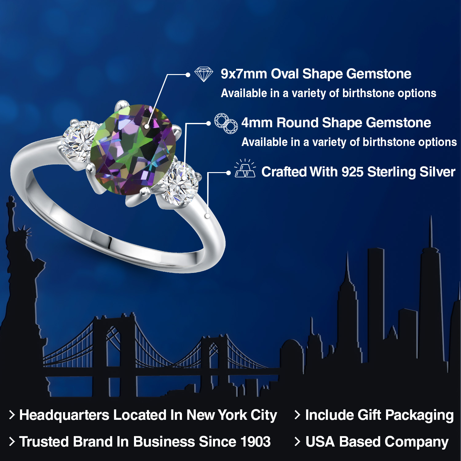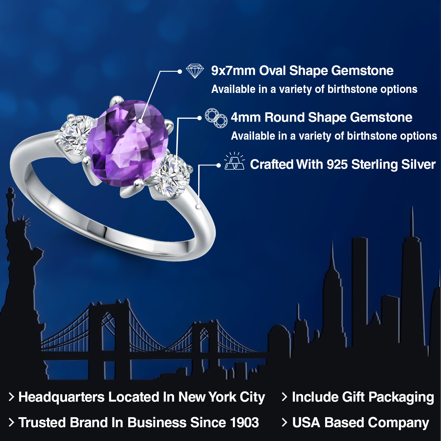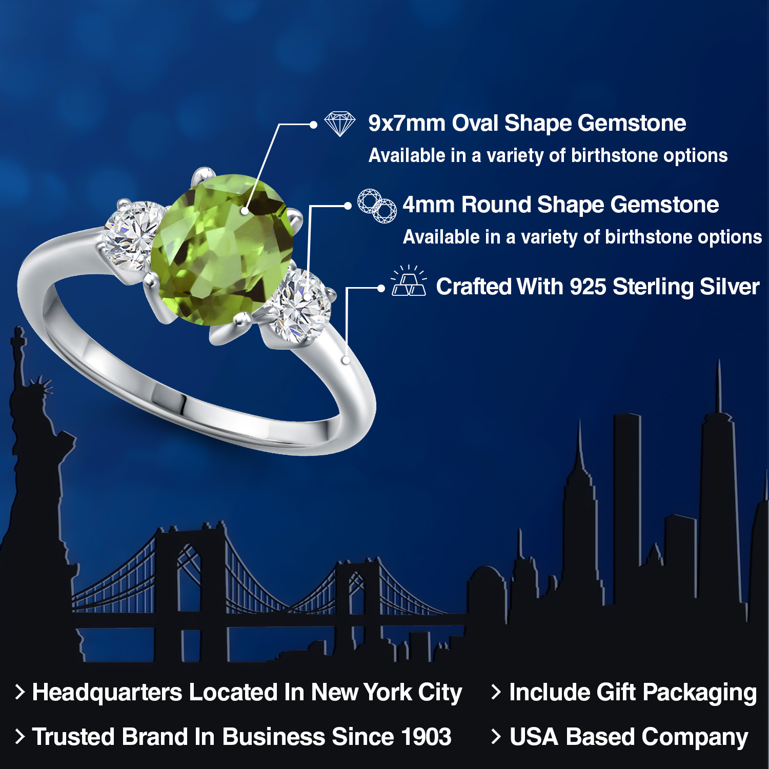 925 Sterling Silver Gemstone Birthstone and White Lab Grown Diamond 3-Stone Engagement Ring for Women | Oval 9X7MM and Round 4MM | Three Stone Wedding Anniversary Promise Ring | Sizes 5, 6, 7, 8, 9