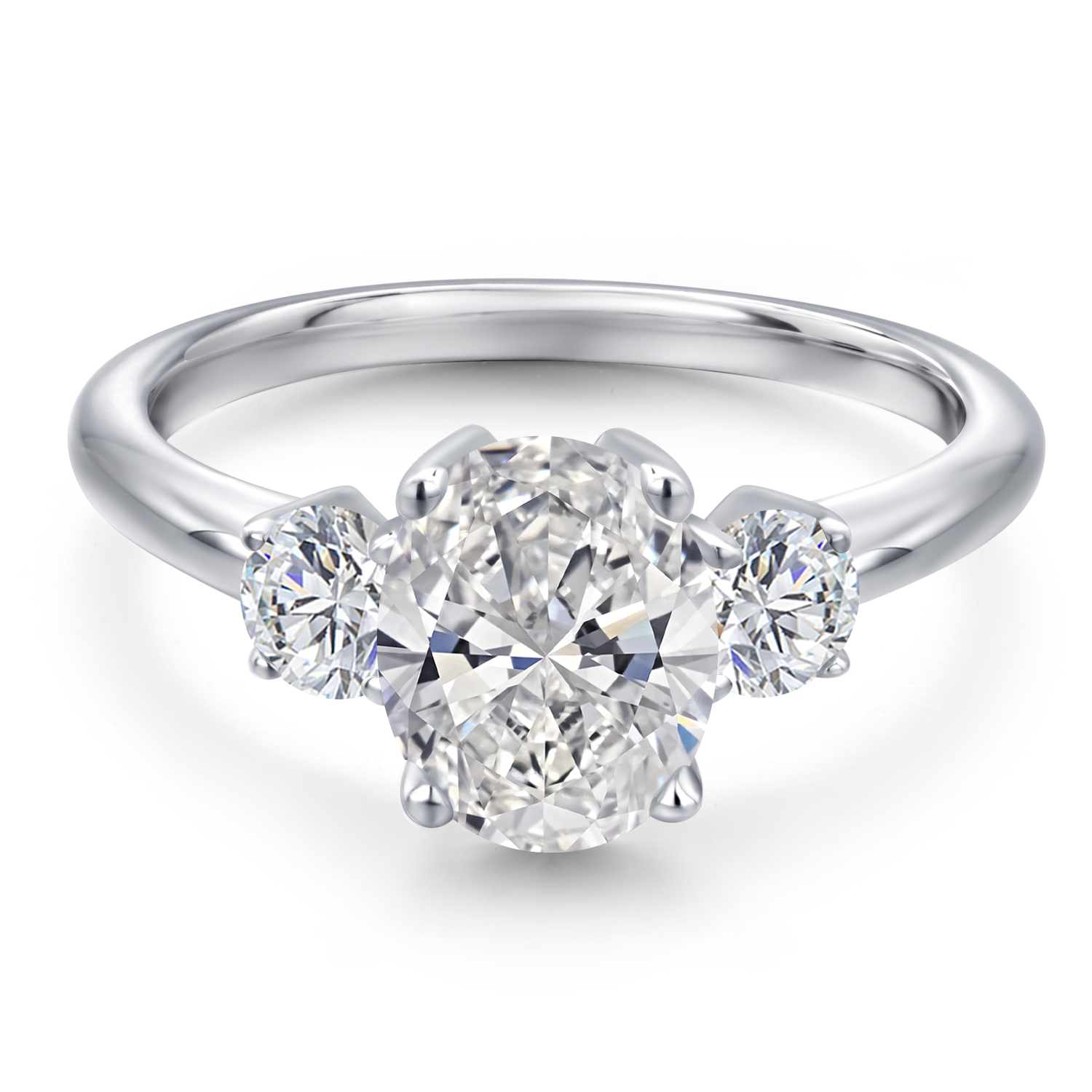 CLASSIC THREE-STONE DESIGN: This ring features a classic three-stone setting, with a radiant 4MM round white lab-grown diamond on each side of the main gemstone. These side stones are meticulously set to enhance the center stone's brilliance, symbolizing the past, present, and future of your love story. The craftsmanship is evident in the precise setting and polishing, resulting in a piece that exudes elegance and sophistication.