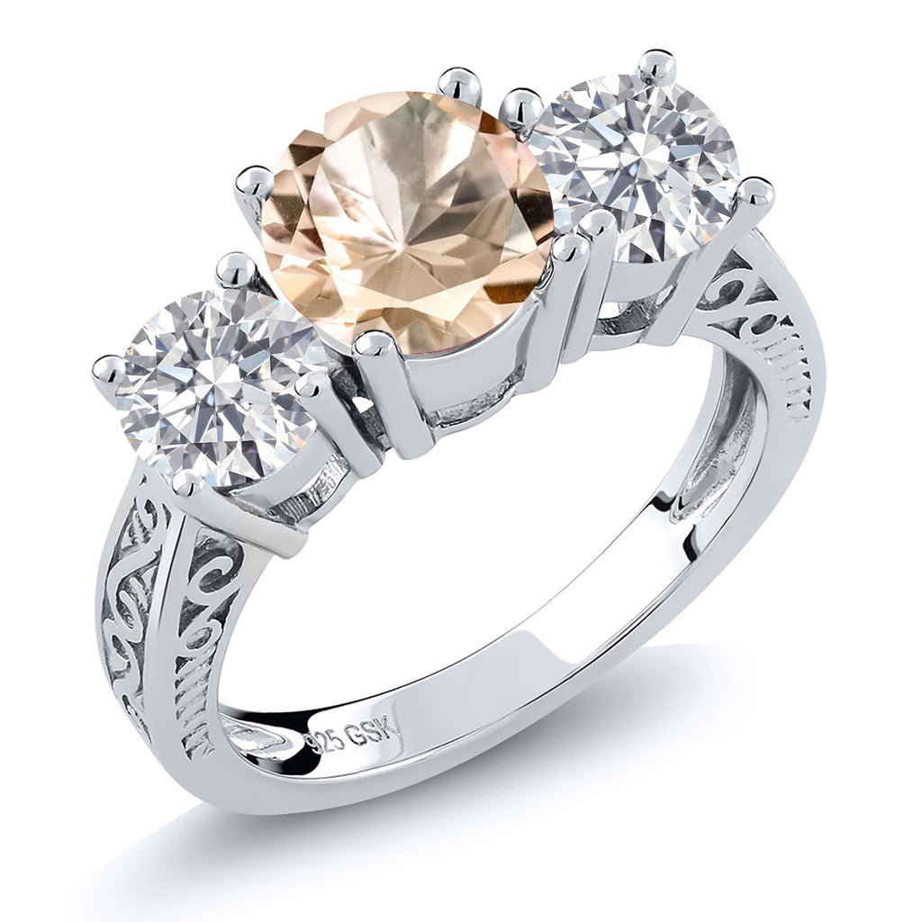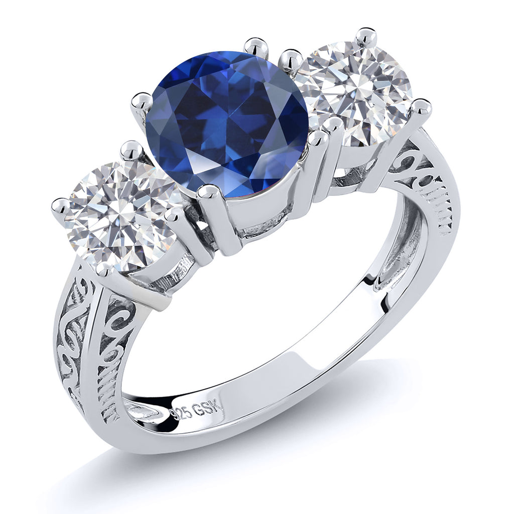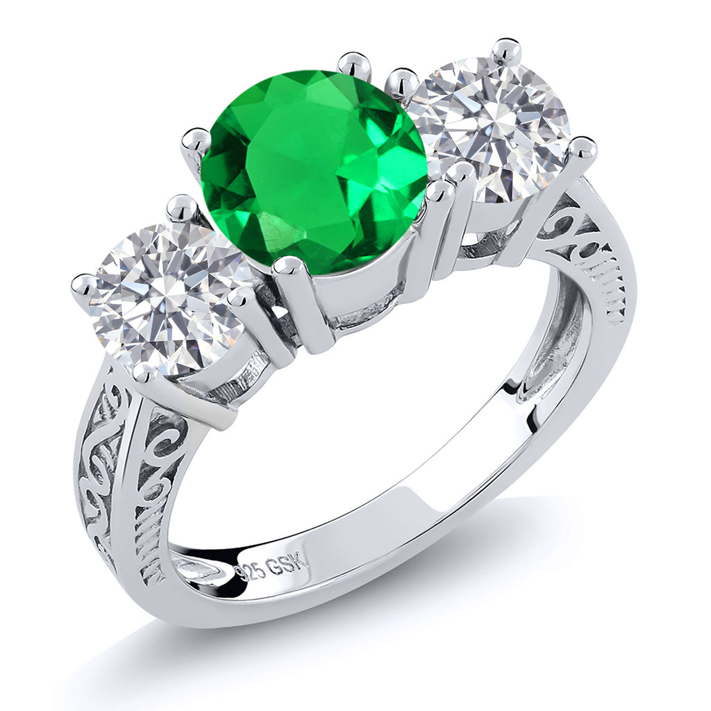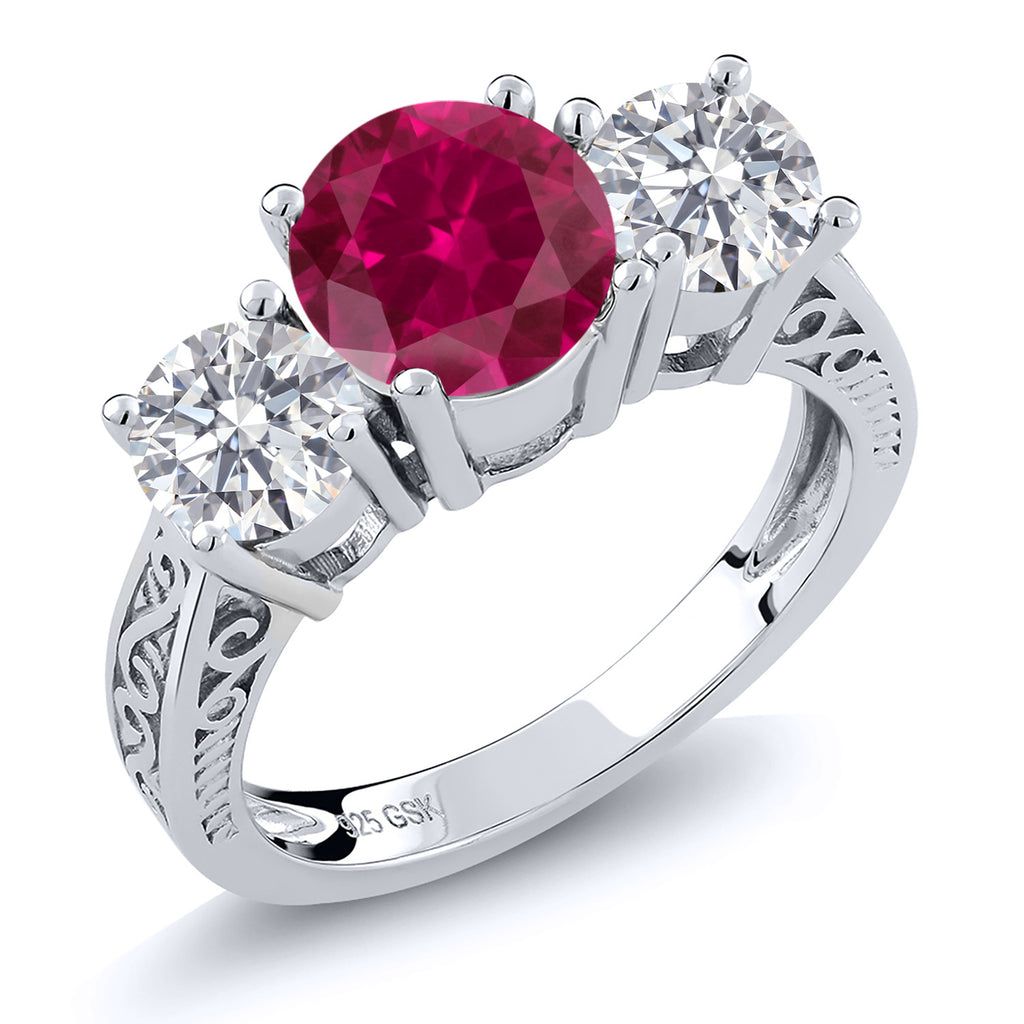 925 Sterling Silver Gemstone Birthstone and White Lab Grown Diamond 3-Stone Ring for Women | Round 7MM & 5MM | Wedding Engagement Anniversary Promise Ring with Filigree Band | Size 5-9