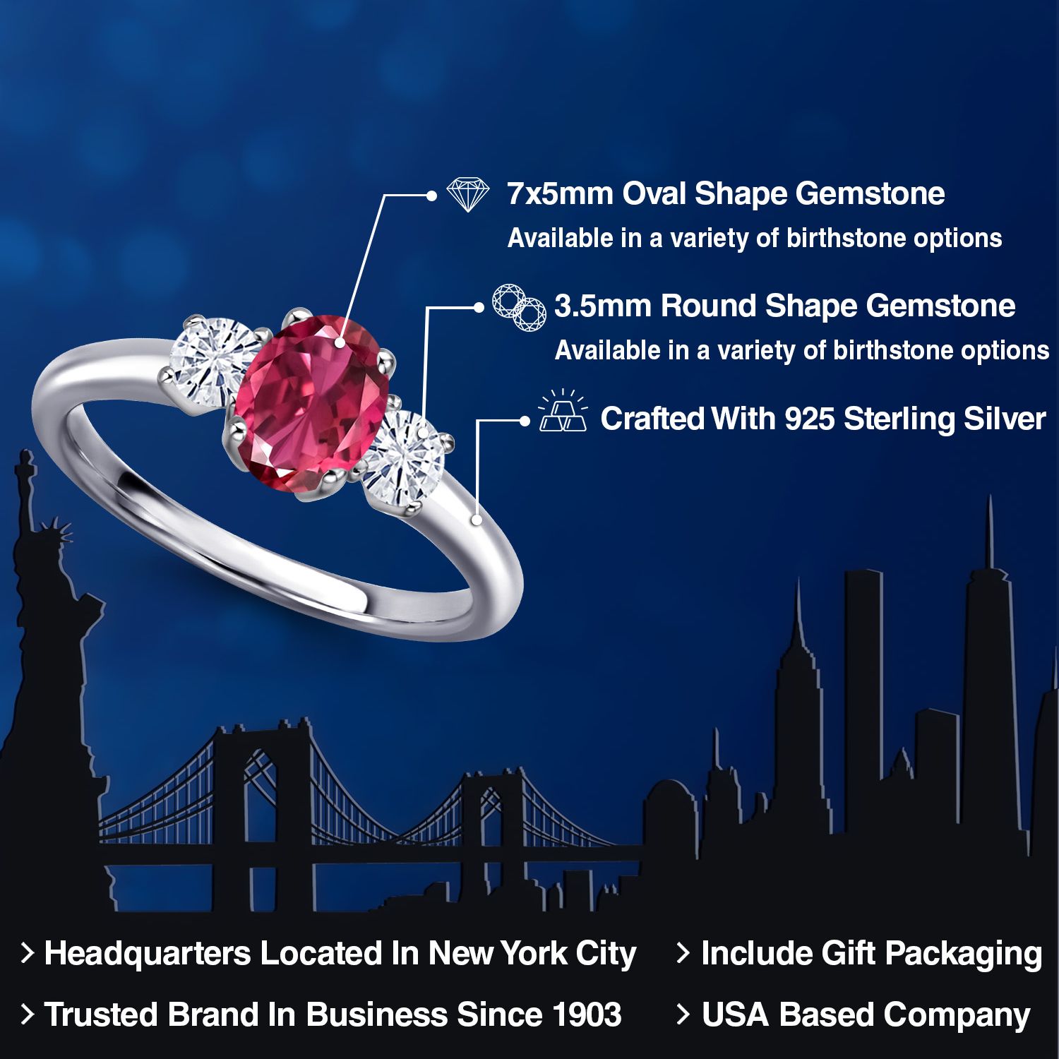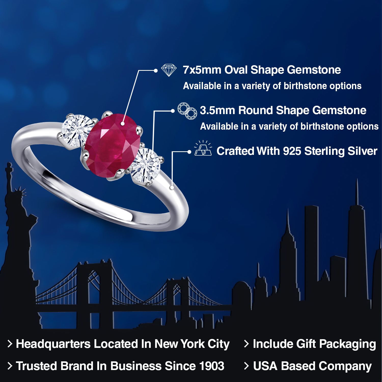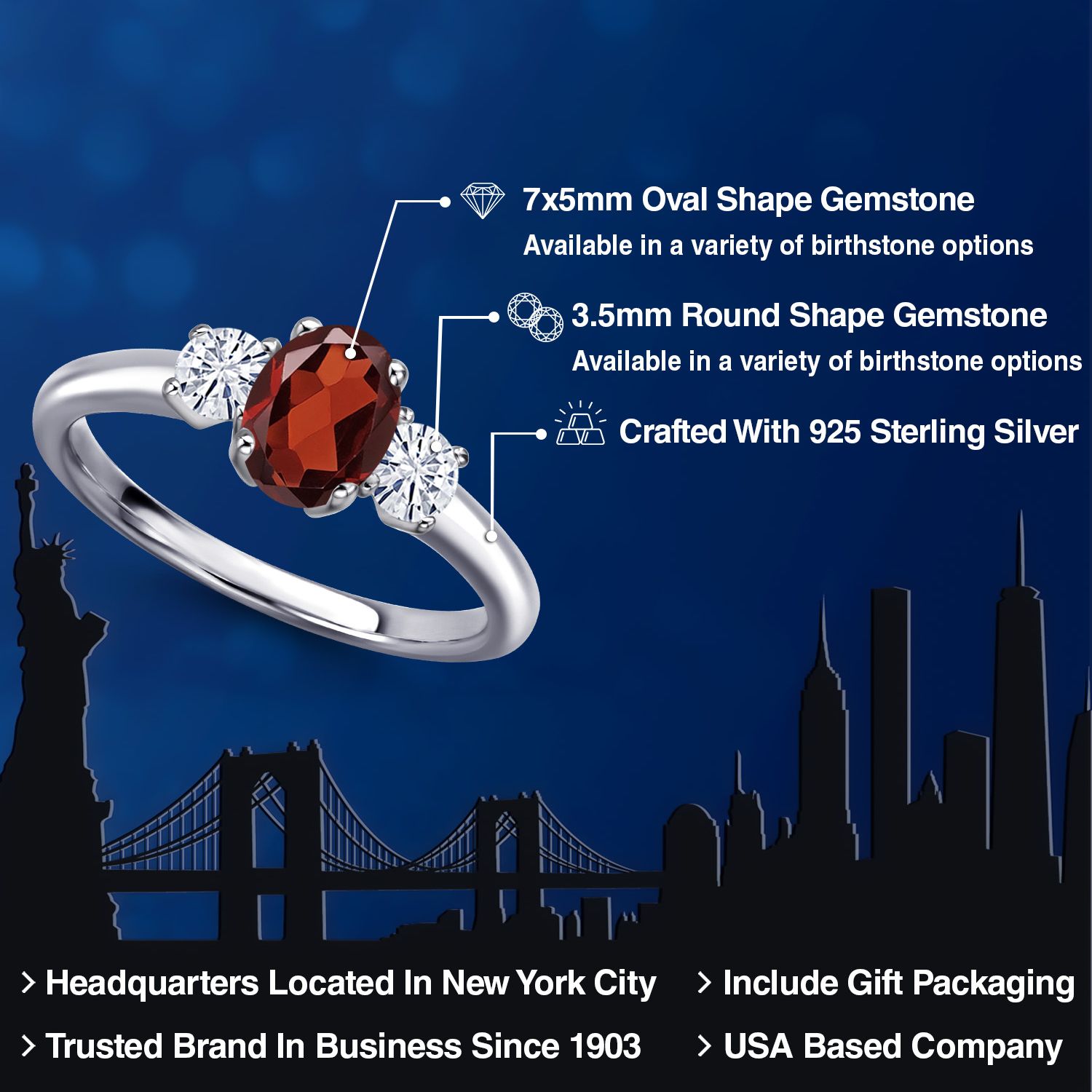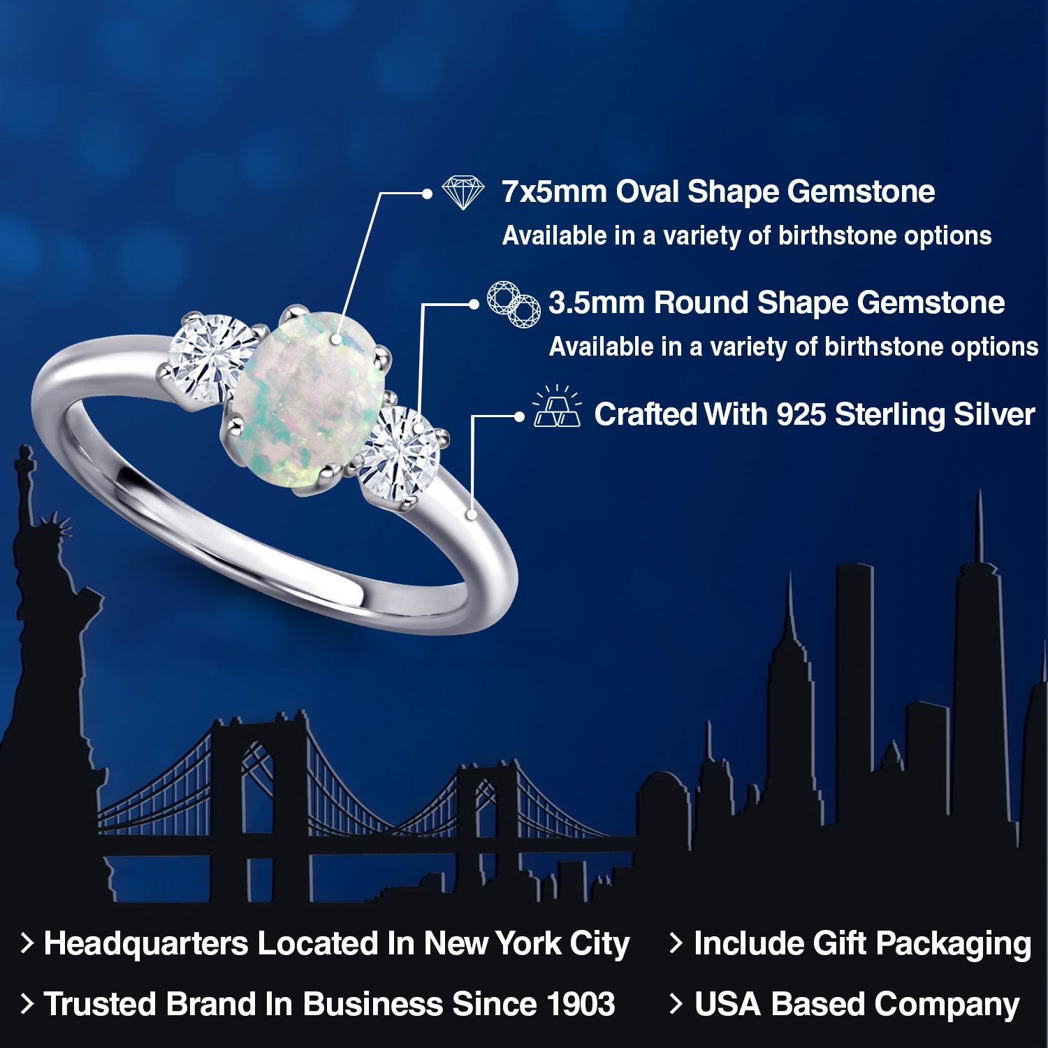925 Sterling Silver Gemstone Birthstone and White Moissanite 3-Stone Engagement Ring for Women | Oval 7X5MM and Round 3MM | Wedding Anniversary Promise Ring | Sizes 5, 6, 7, 8, 9