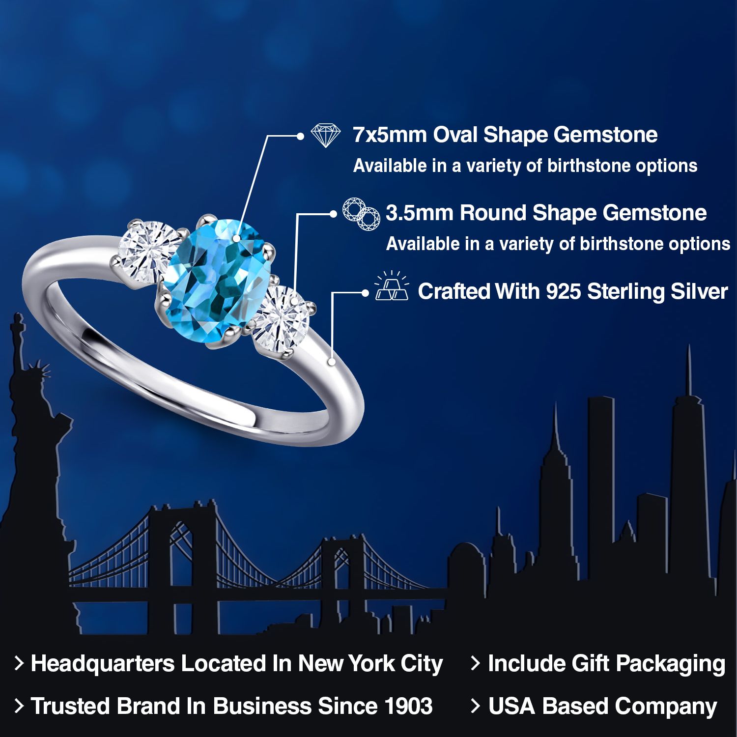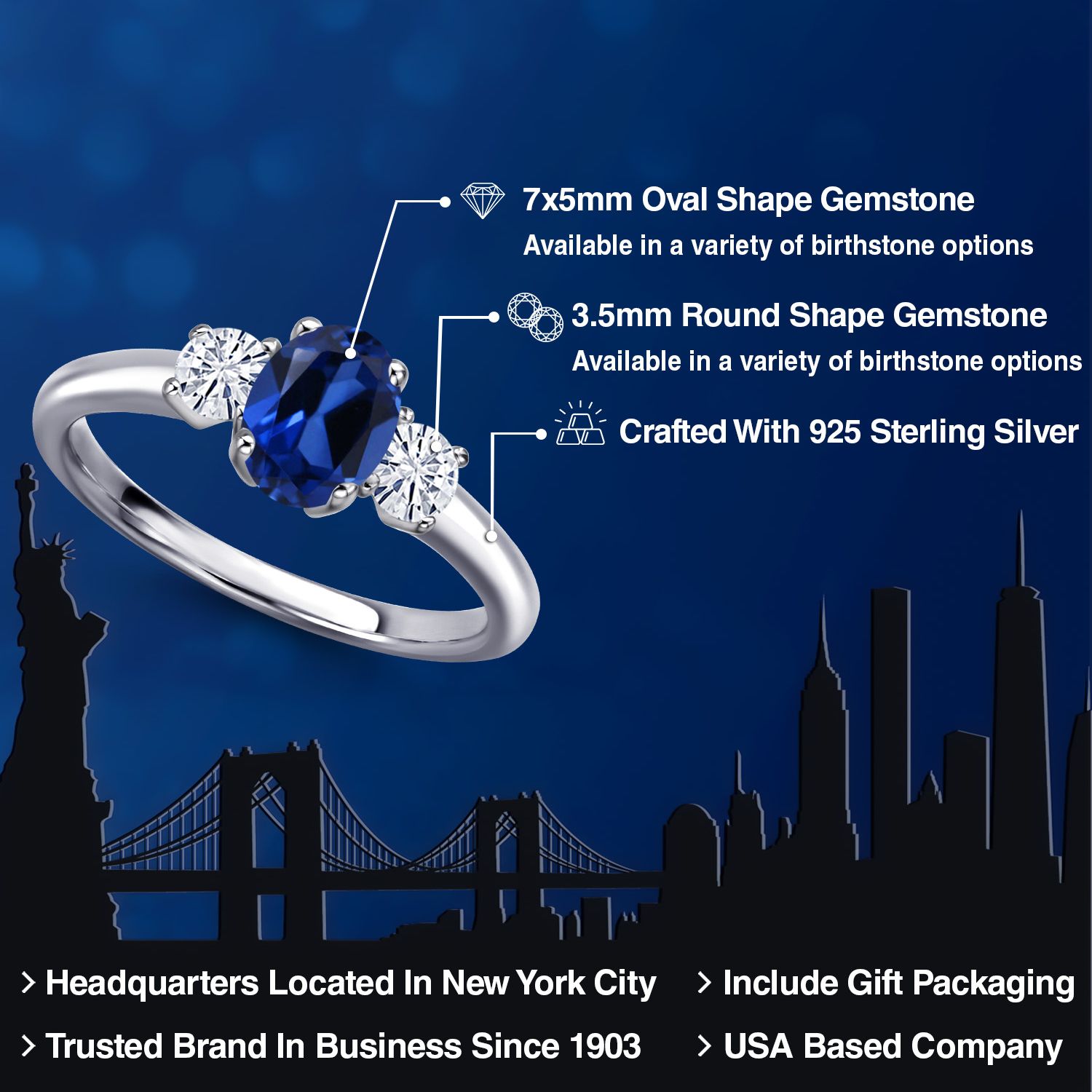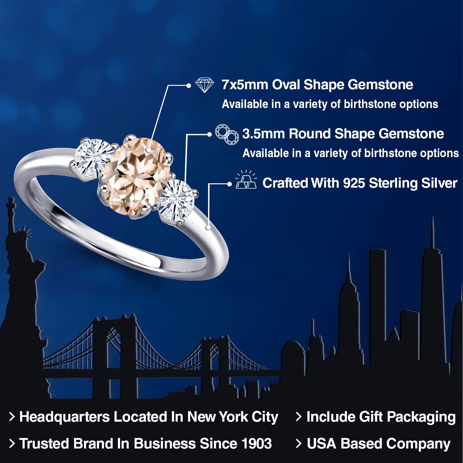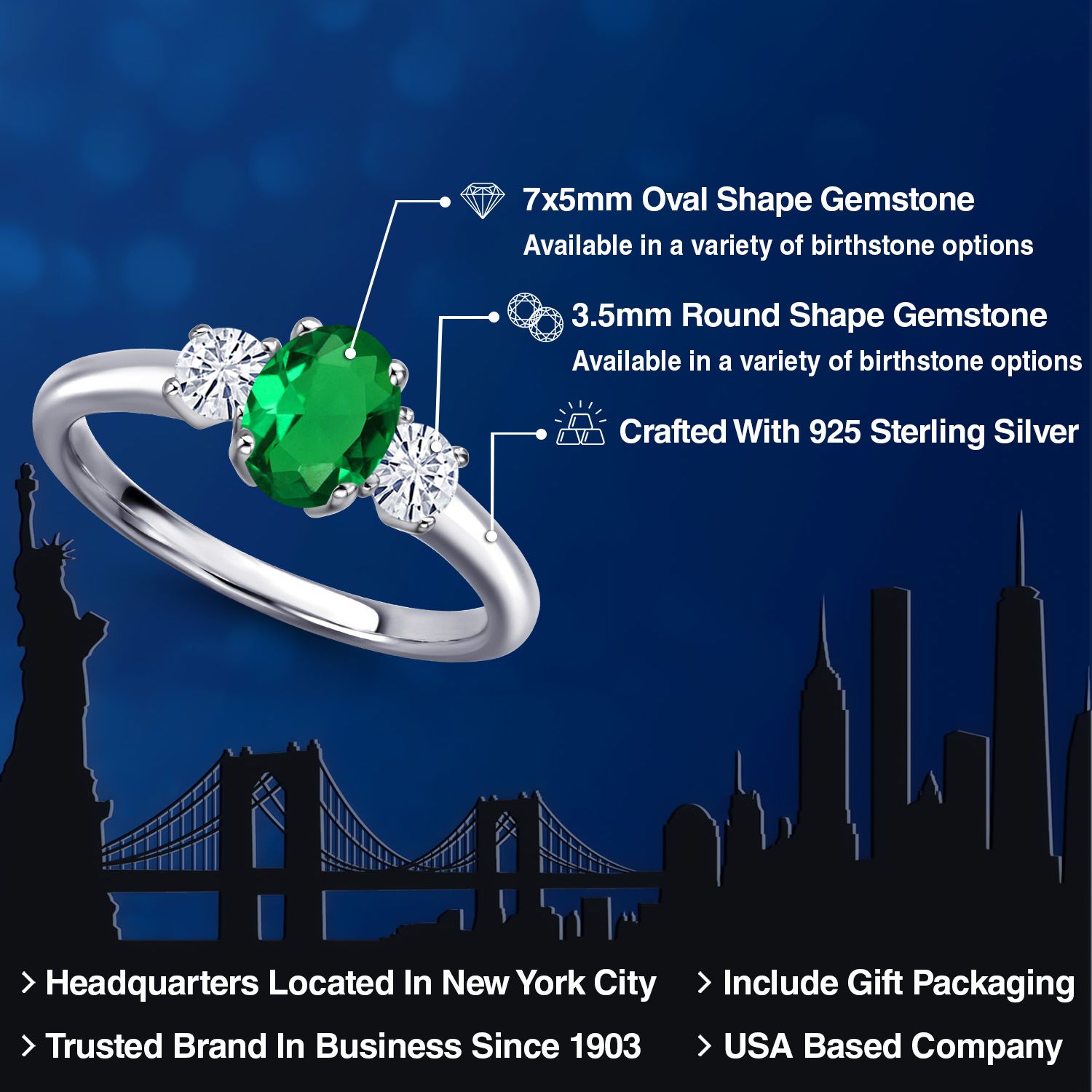 925 Sterling Silver Gemstone Birthstone and White Moissanite 3-Stone Engagement Ring for Women | Oval 7X5MM and Round 3MM | Wedding Anniversary Promise Ring | Sizes 5, 6, 7, 8, 9