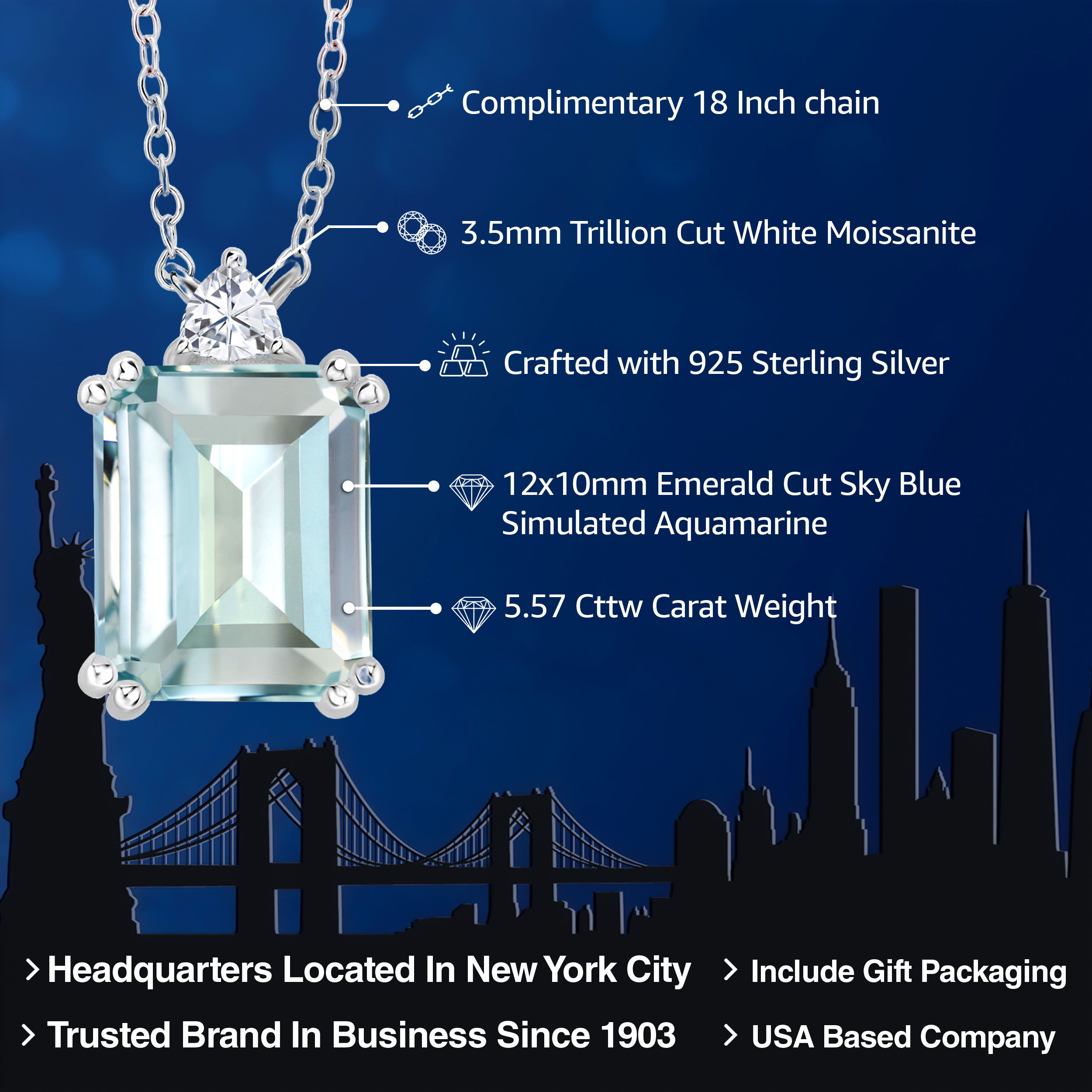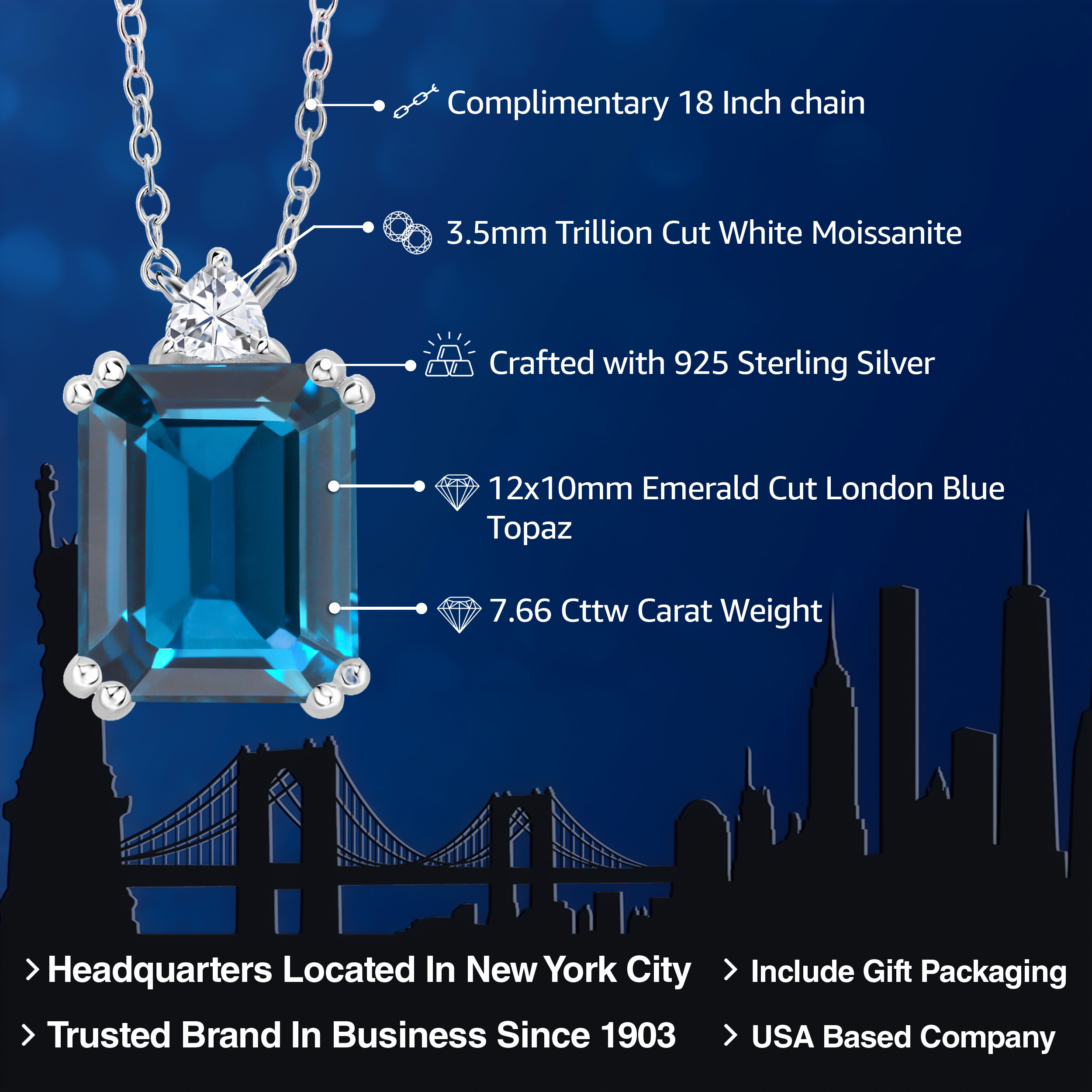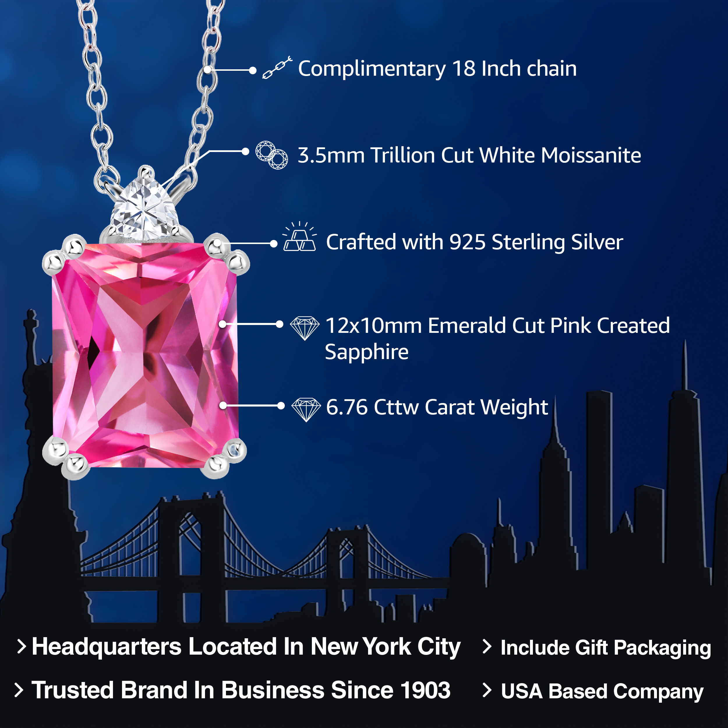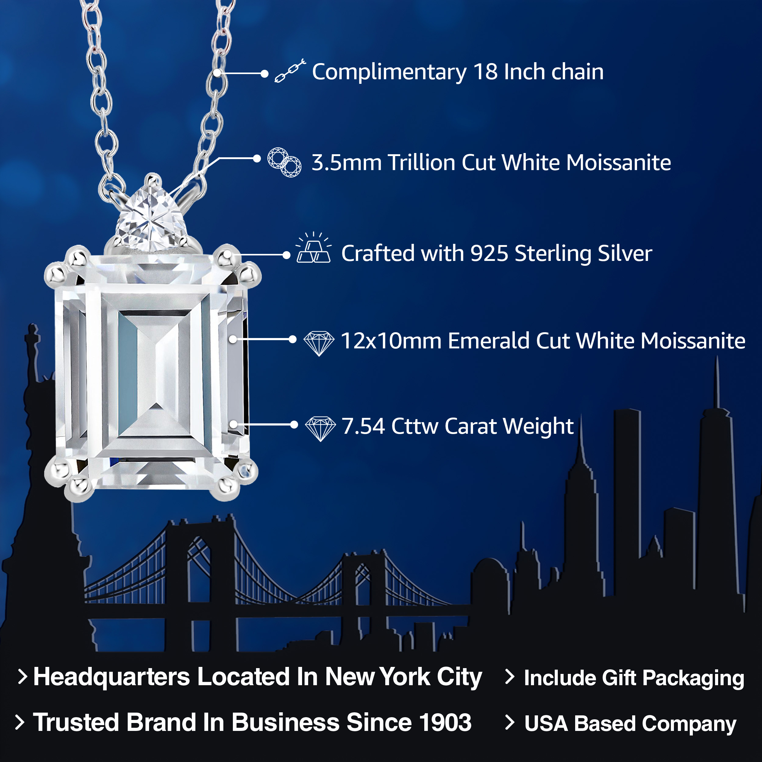Emerald Cut Pendant Necklace For Women | 925 Sterling Silver | Gemstone Birthstone and White Moissanite | Emerald Cut 12X10MM | Trillion 3.5MM | With 18 Inch Chain