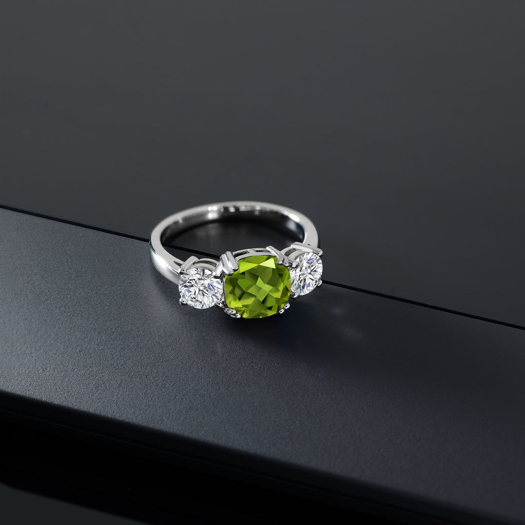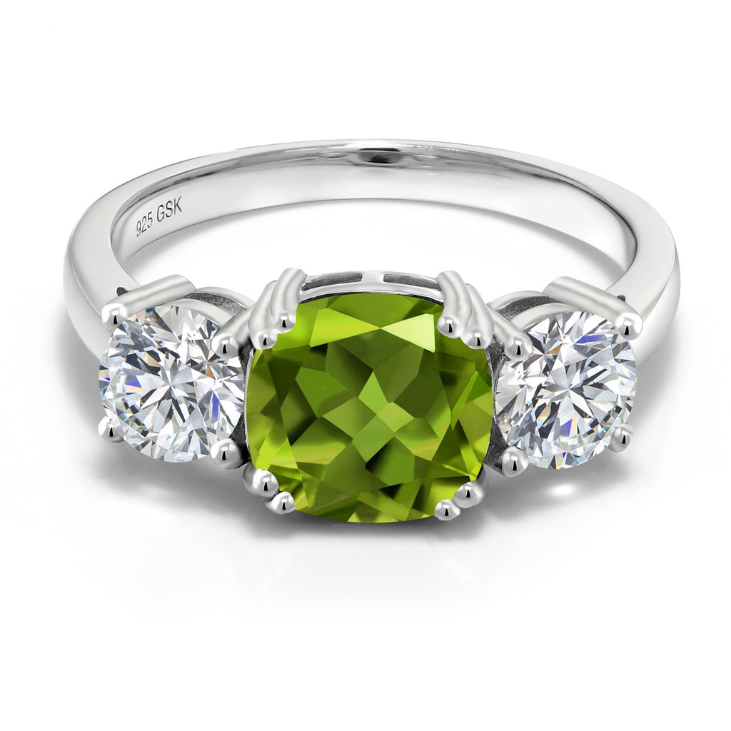 MEASUREMENTS: 8x8mm Cushion Green Peridot, 5x5mm Round E - F Lab Grown Diamond. Total Carat Weight is 3.45 cttw