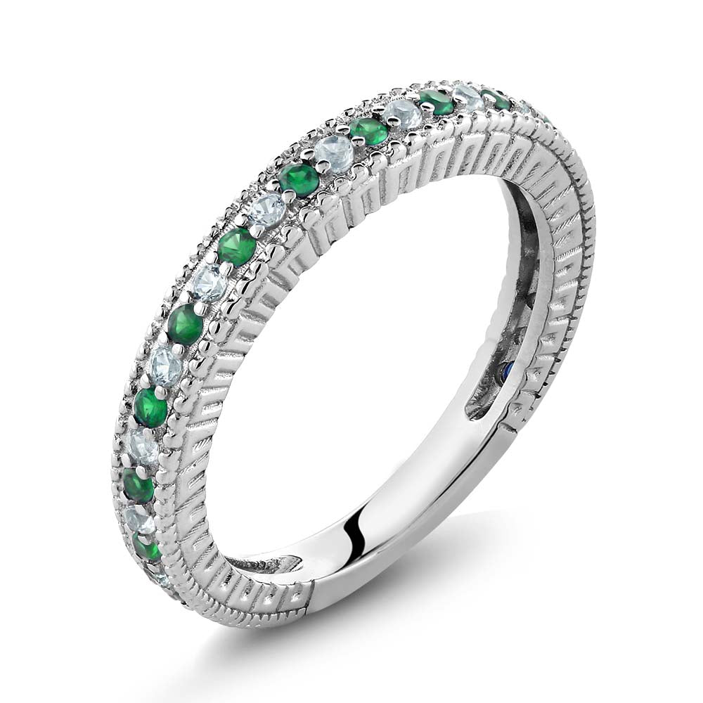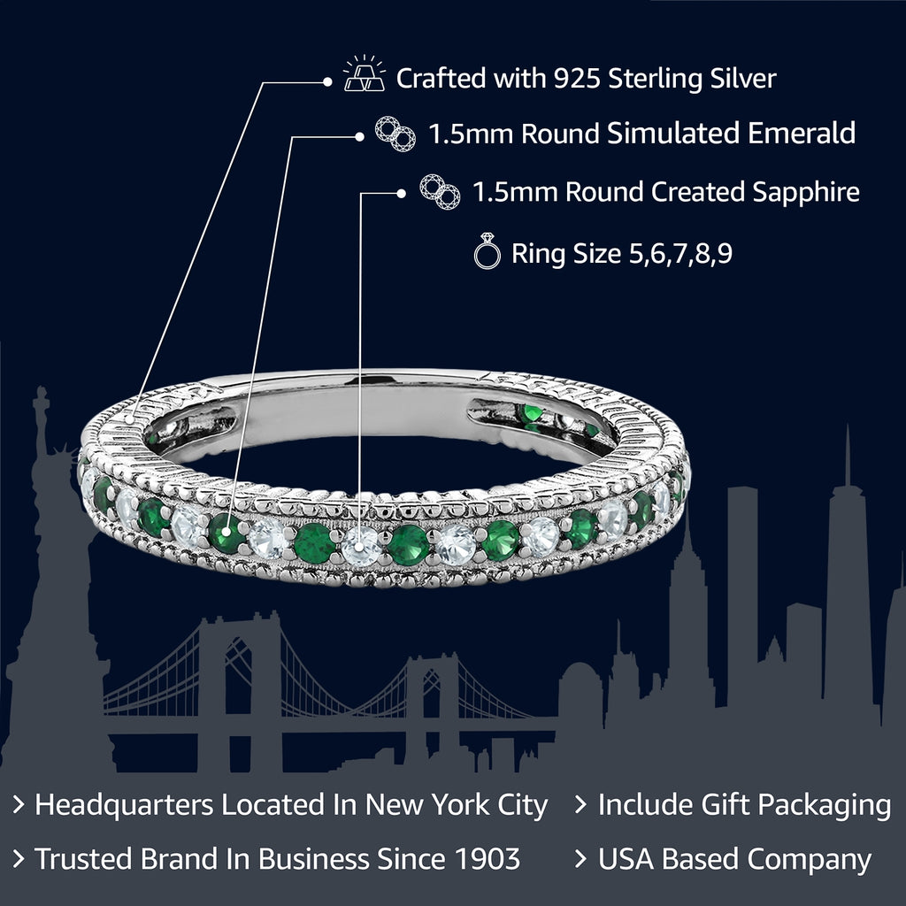 Green Simulated Emerald and White Created Sapphire Ring | 925 Silver | Anniversary Wedding Band Ring For Women | 0.48 Cttw | Wedding Engagement Anniversary Promise Ring