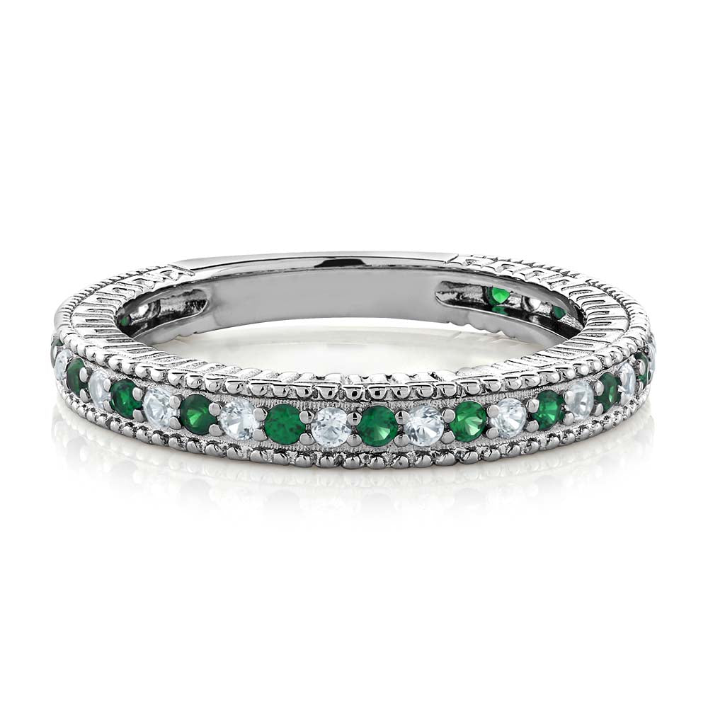 ELEGANT GREEN SIMULATED EMERALD GEMSTONES: This ring features elegant green simulated emerald gemstones that exude a rich and vibrant green hue. The emerald's lush color symbolizes love, renewal, and growth, making it a perfect choice for an anniversary or wedding band ring.