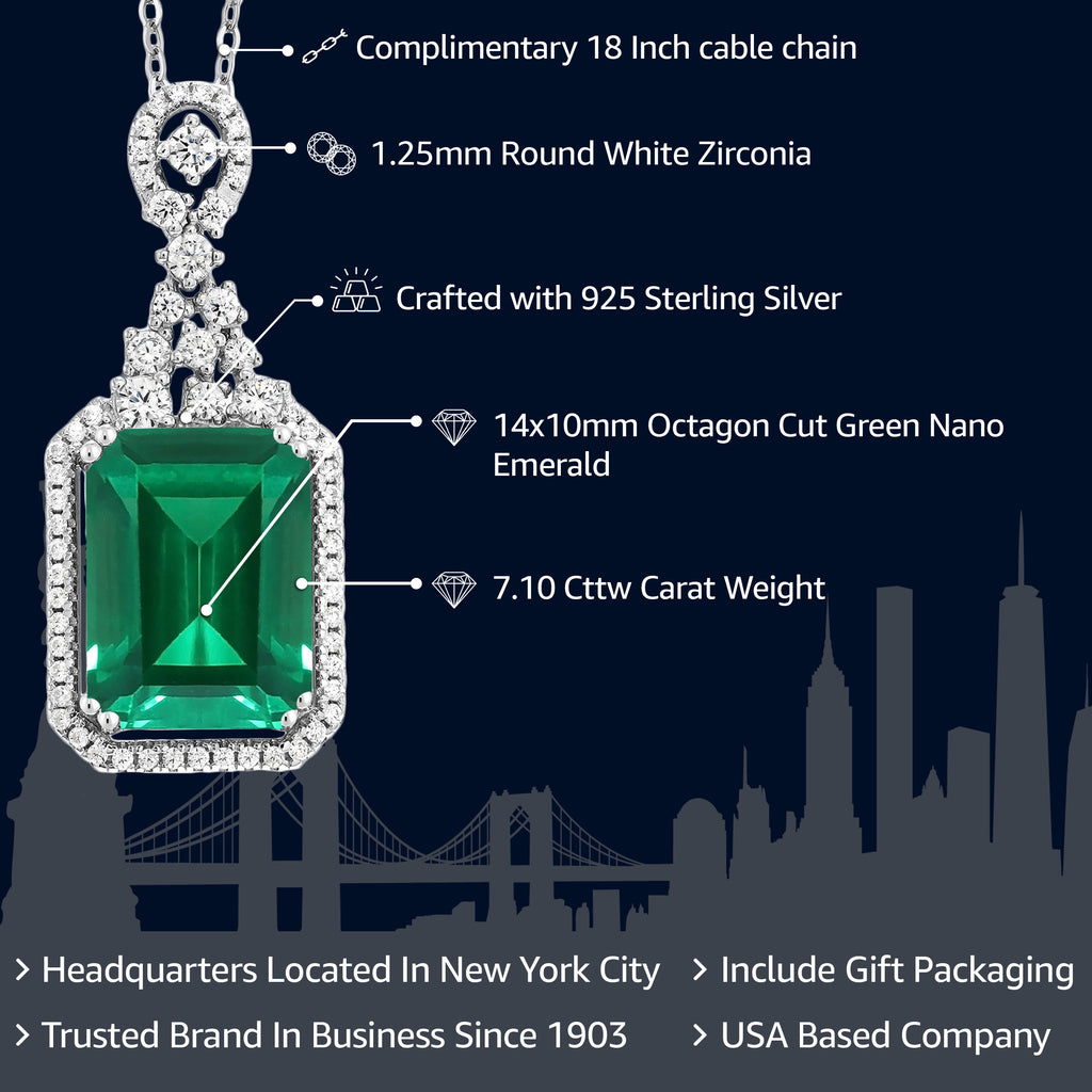IMPRESSIVE CARAT TOTAL WEIGHT: With a total carat weight of 7.10 cttw, this pendant necklace makes a statement. The sizeable emerald cut green simulated emerald gemstone captures attention with its sparkling brilliance, adding a touch of grandeur and luxury to the necklace.