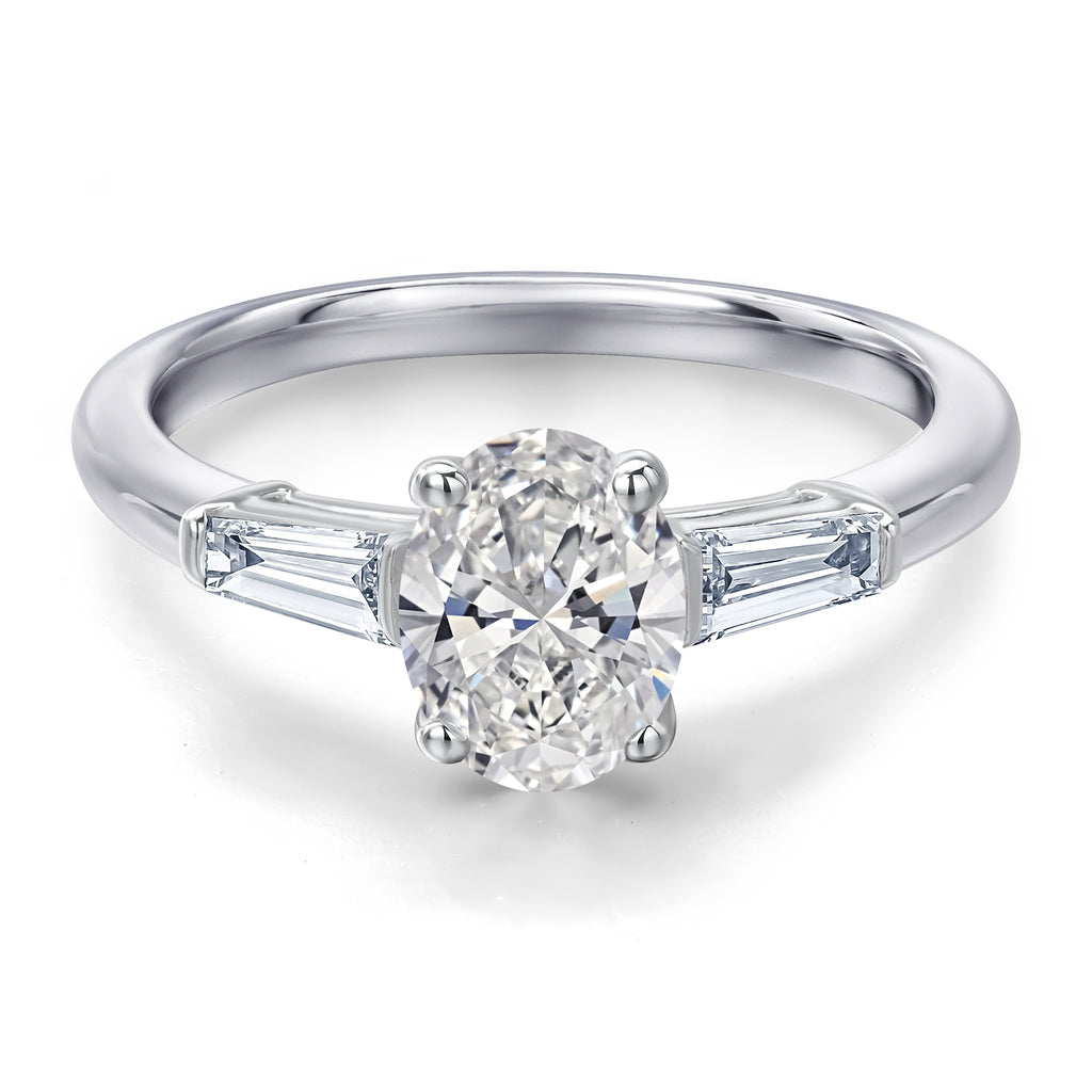 MEASUREMENTS: 8x6mm Oval E - F Lab Grown Diamond, 5x2.25mm Tapered Baguette E - F Lab Grown Diamond. Total Carat Weight is 1.3 cttw
