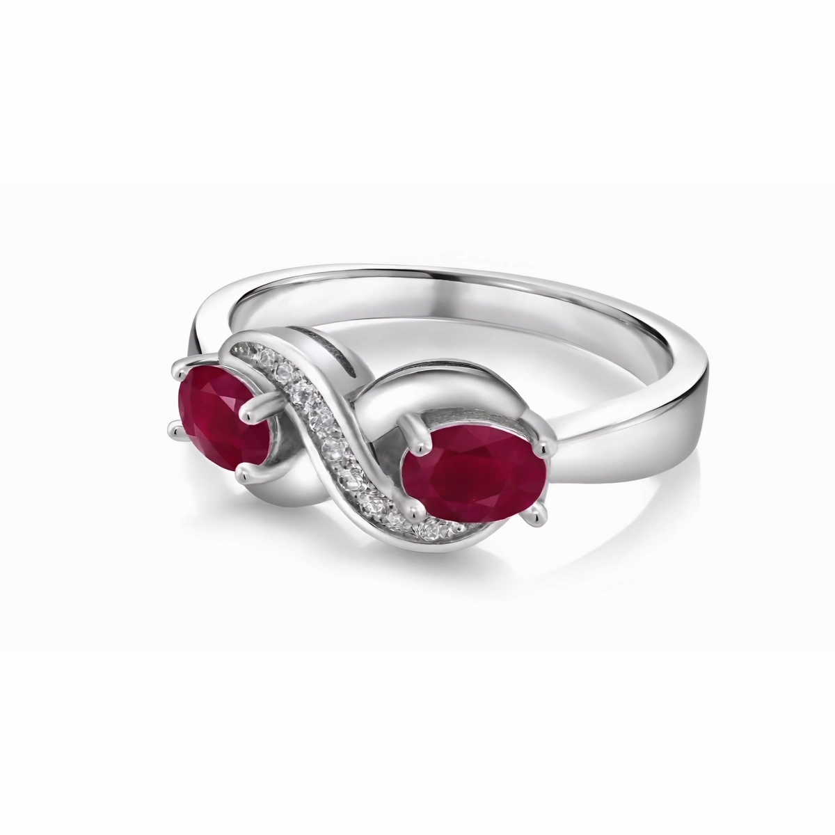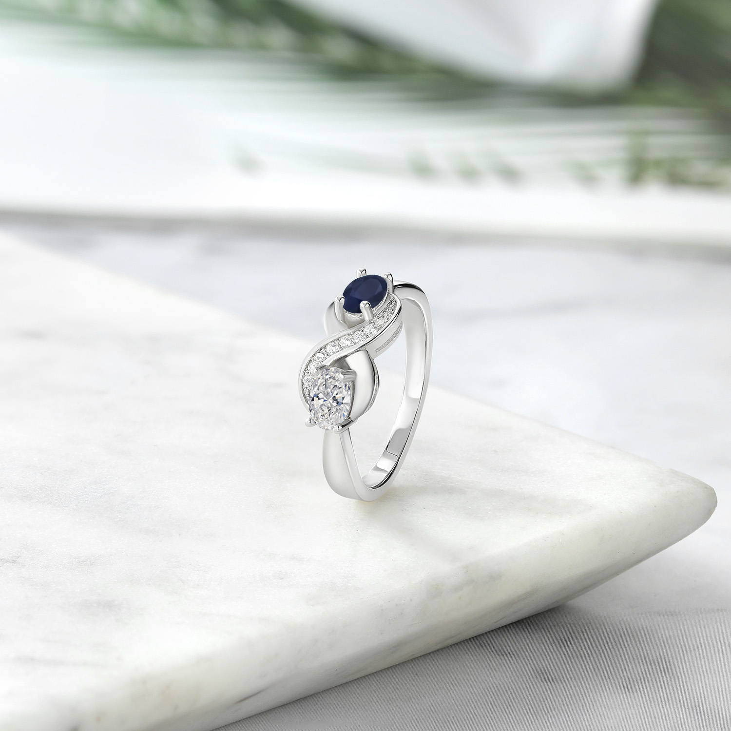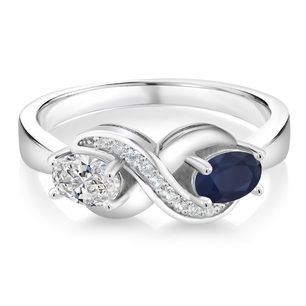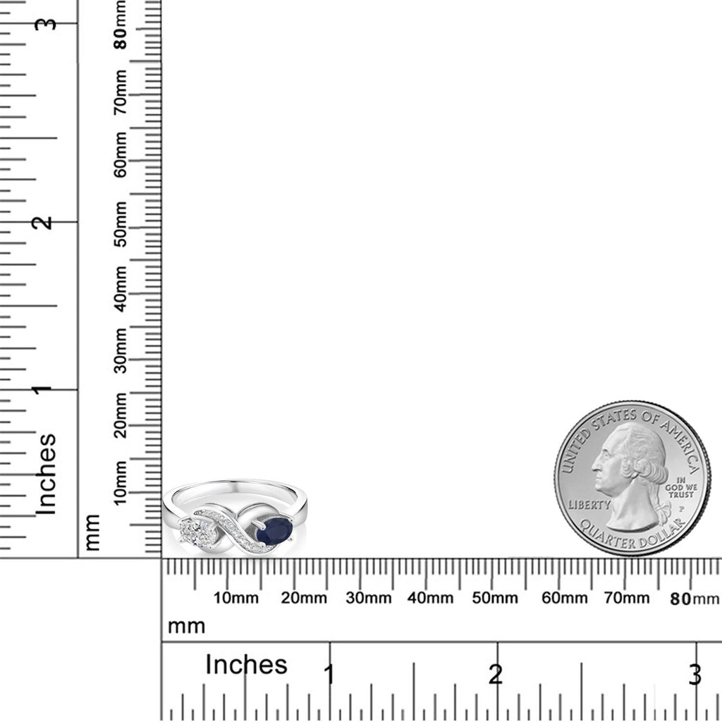 MEASUREMENTS: 6x4mm Oval DEF Lab Grown Diamond, 6x4mm Oval Diffused Blue Sapphire1.2, x, 1.2, mm Round Heat-Treated White Created Sapphire. Total Carat Weight is 0.99 cttw