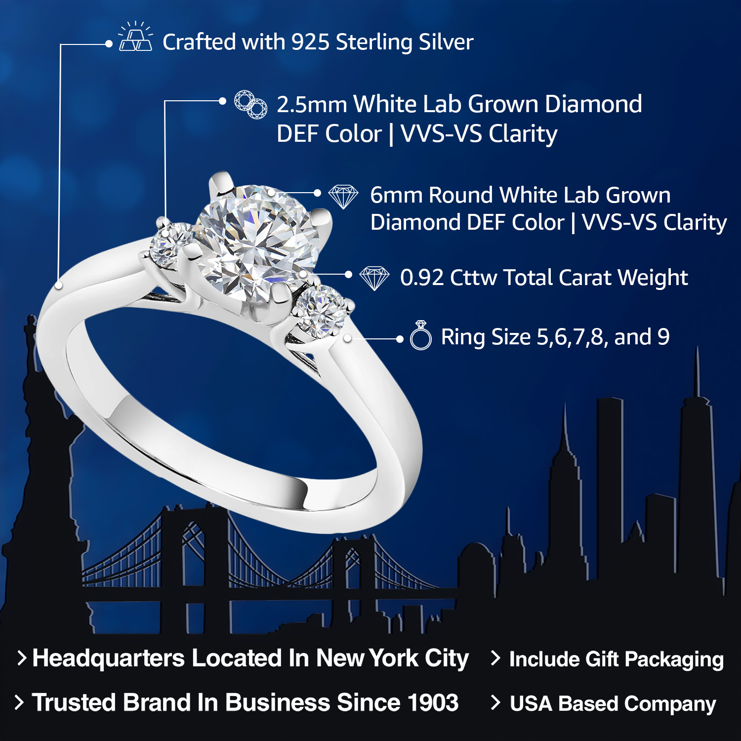 925 Sterling Silver Lab Grown Diamond 3-Stone Engagement Ring For Women | 0.87 Cttw | Round 6MM and 2.5MM | Gemstone April Birthstone | DEF Color | VVS-VS Clarity