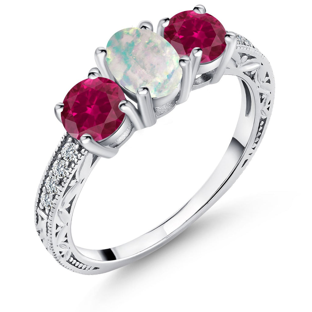 1.95 Cttw Oval Cabochon White Simulated Opal and Red Created Ruby Ring For Women | 925 Silver | Gemstone Birthstone | Wedding Engagement Anniversary Promise Ring For Women