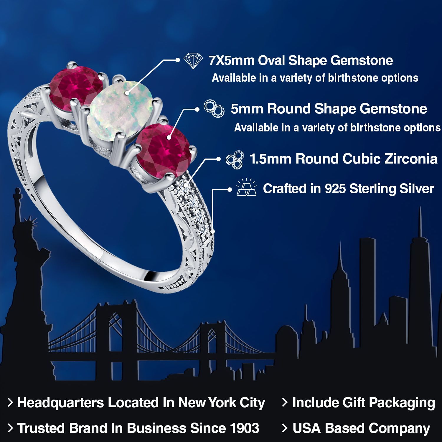 VIBRANT RED CREATED RUBY ACCENTS: Surrounding the simulated opal are vibrant red created ruby accents, adding a bold and passionate contrast. The combination of opal and ruby creates a striking visual appeal, making this ring a statement piece for any occasion.