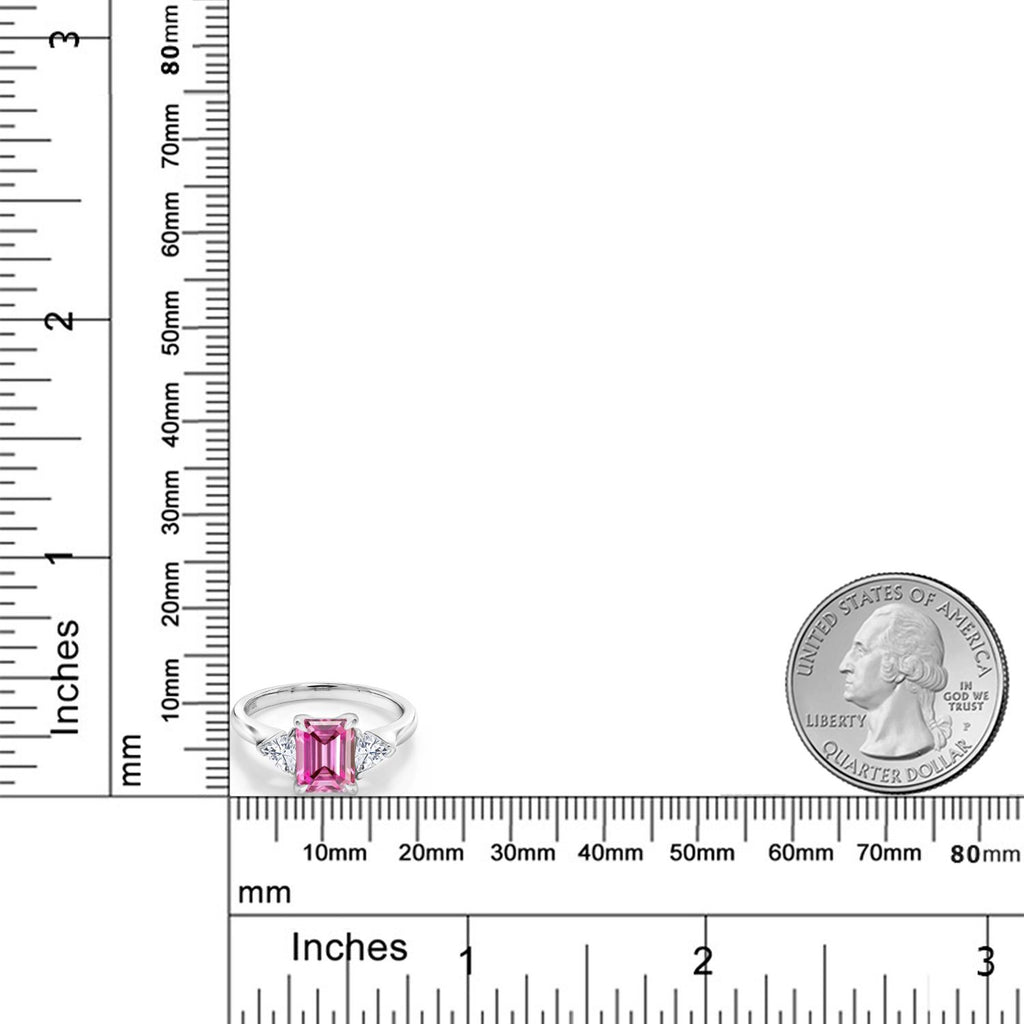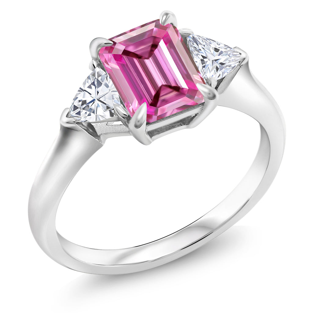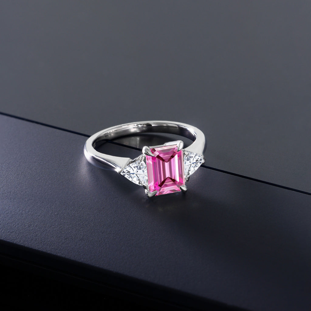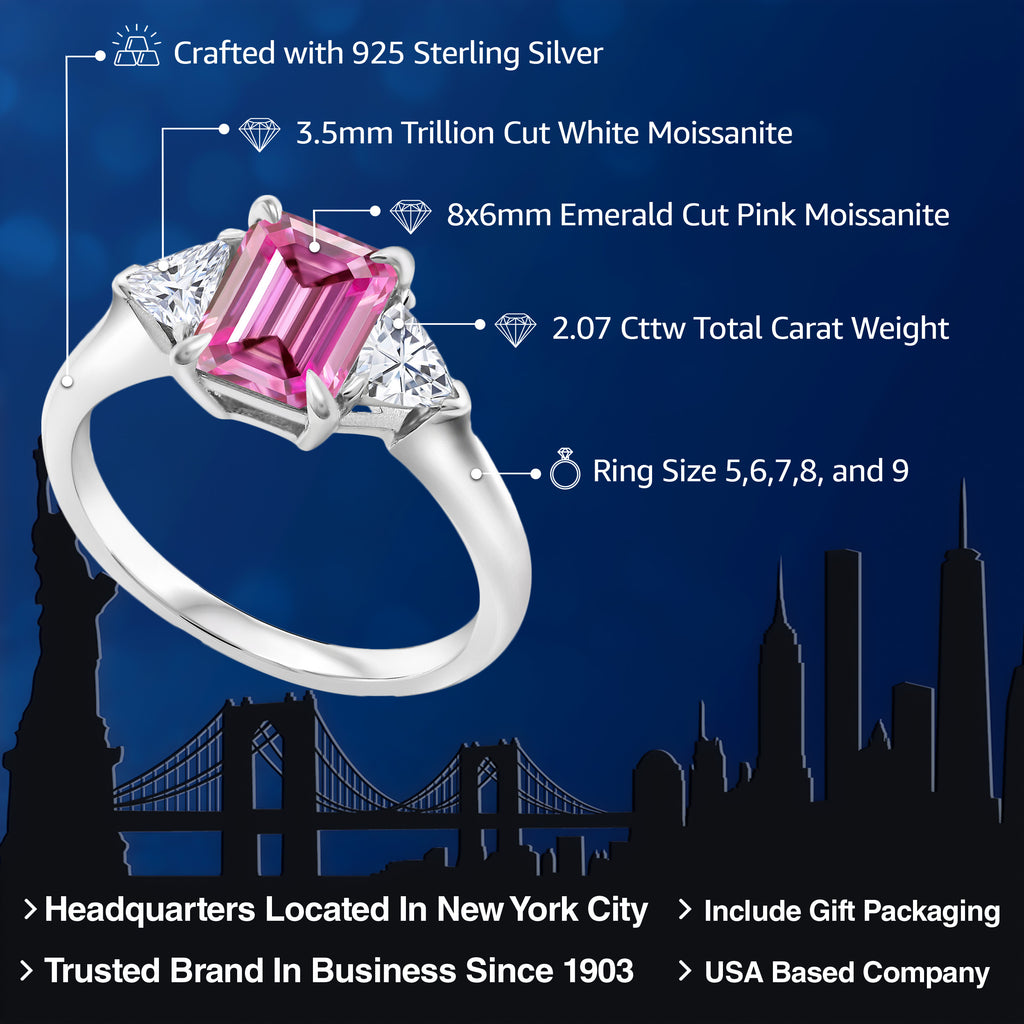 2.07 Cttw Pink and White Moissanite 3-Stone Ring | 925 Sterling Silver | Three Stone Wedding Engagement Anniversary Promise Ring For Women | Emerald Cut 8X6MM | Trillion 3.5MM