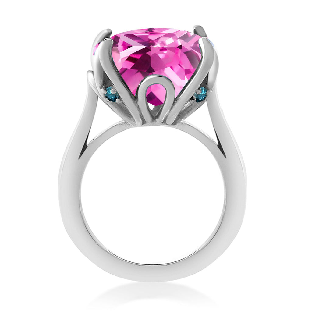 925 Sterling Silver Pink Created Sapphire and Blue Diamond Engagement Ring For Women (14.62 Cttw, 14MM Cushion, Available in Size 5,6,7,8,9)