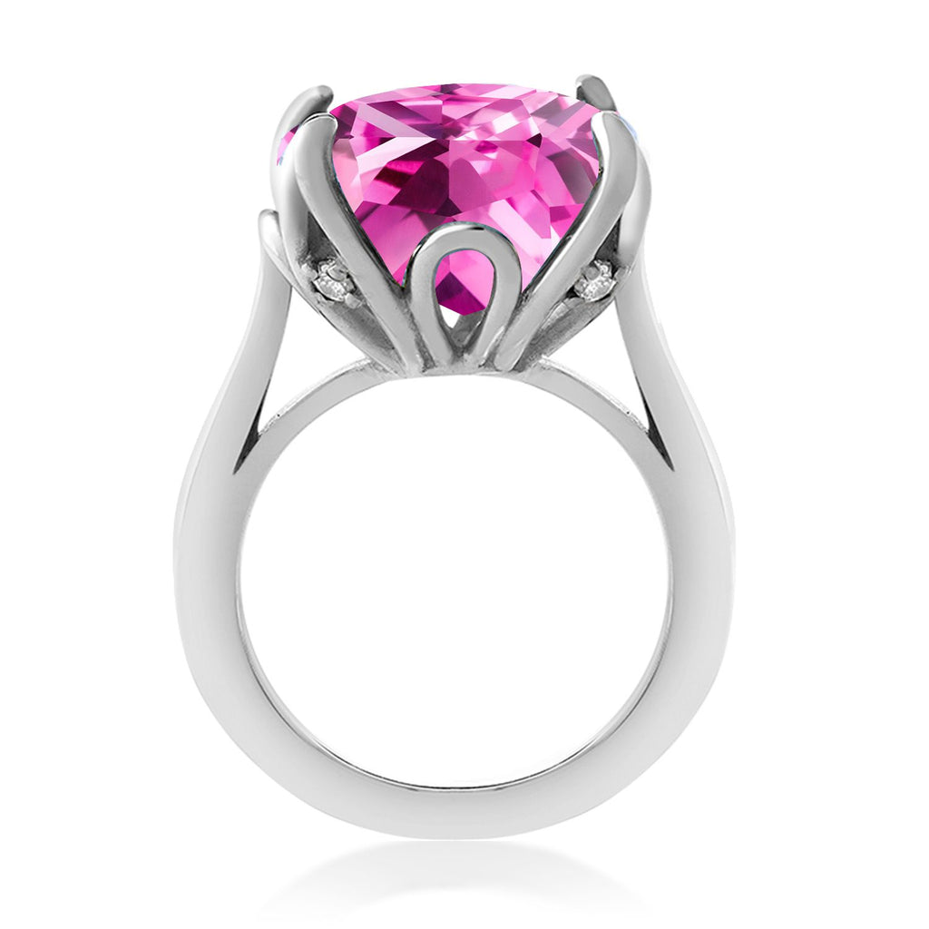 - MEASUREMENTS: 14x14mm Cushion Heat-Treated Pink Created Sapphire, 1.8x1.8mm Round White Zirconia. Total Carat Weight is 14.68 cttw