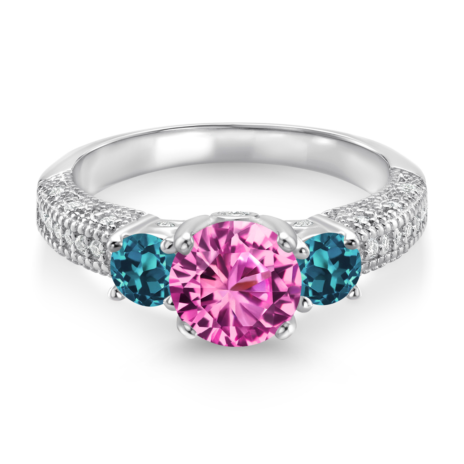 925 Sterling Silver Pink Created Sapphire London Blue Topaz and White Moissanite Engagement Ring For Women (2.40 Cttw, Gemstone September Birthstone, Round 7MM and 4MM)
