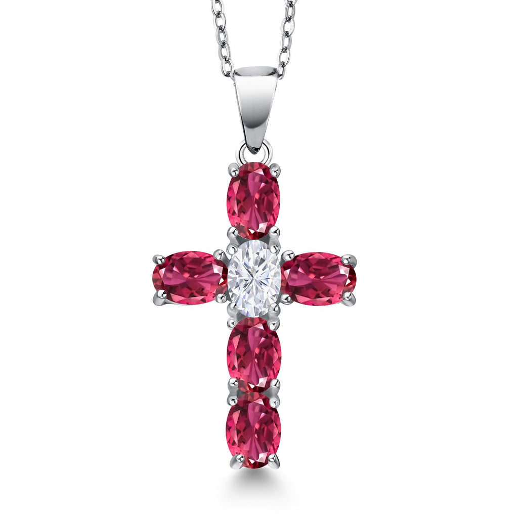 925 Sterling Silver Pink Tourmaline and White Moissanite Cross Pendant Necklace for Women | 2.88 Cttw | Gemstone October Birthstone | Oval 6X4MM | With 18 Inch Chain