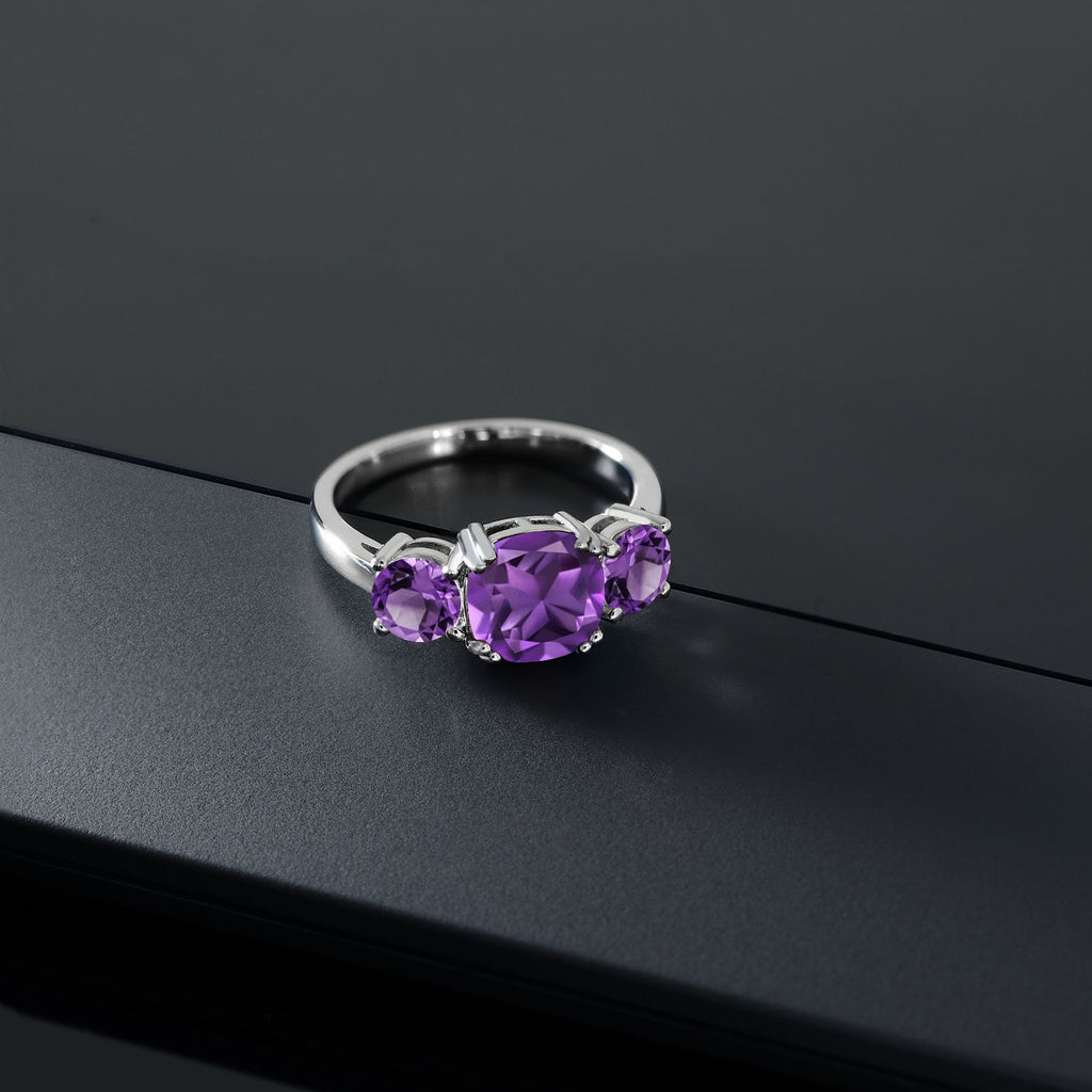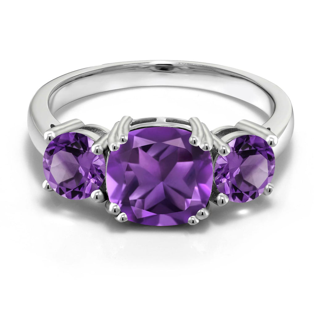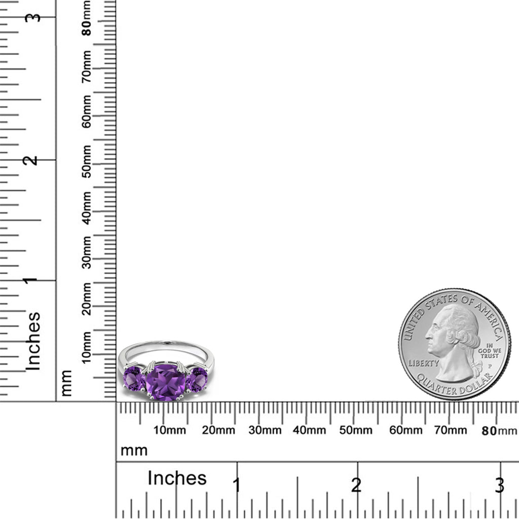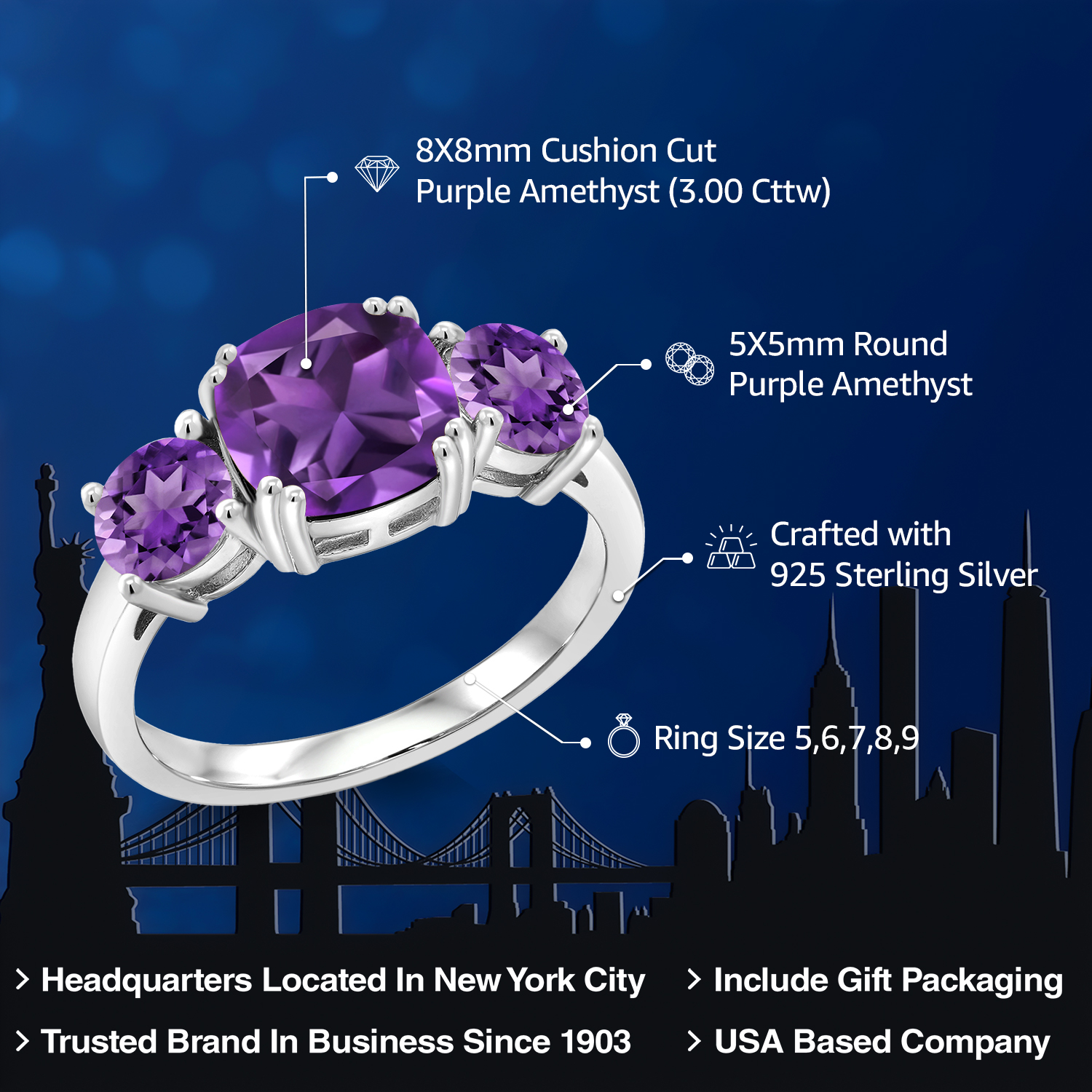 EXQUISITE GEMSTONE TRIO: This engagement ring features a trio of dazzling purple amethyst gemstones, totaling 3.00 carats. The centerpiece is a luxurious cushion-cut 8mm amethyst, flanked by two smaller yet equally stunning amethyst stones on each side. Together, they create a captivating ensemble that symbolizes love, loyalty, and commitment.